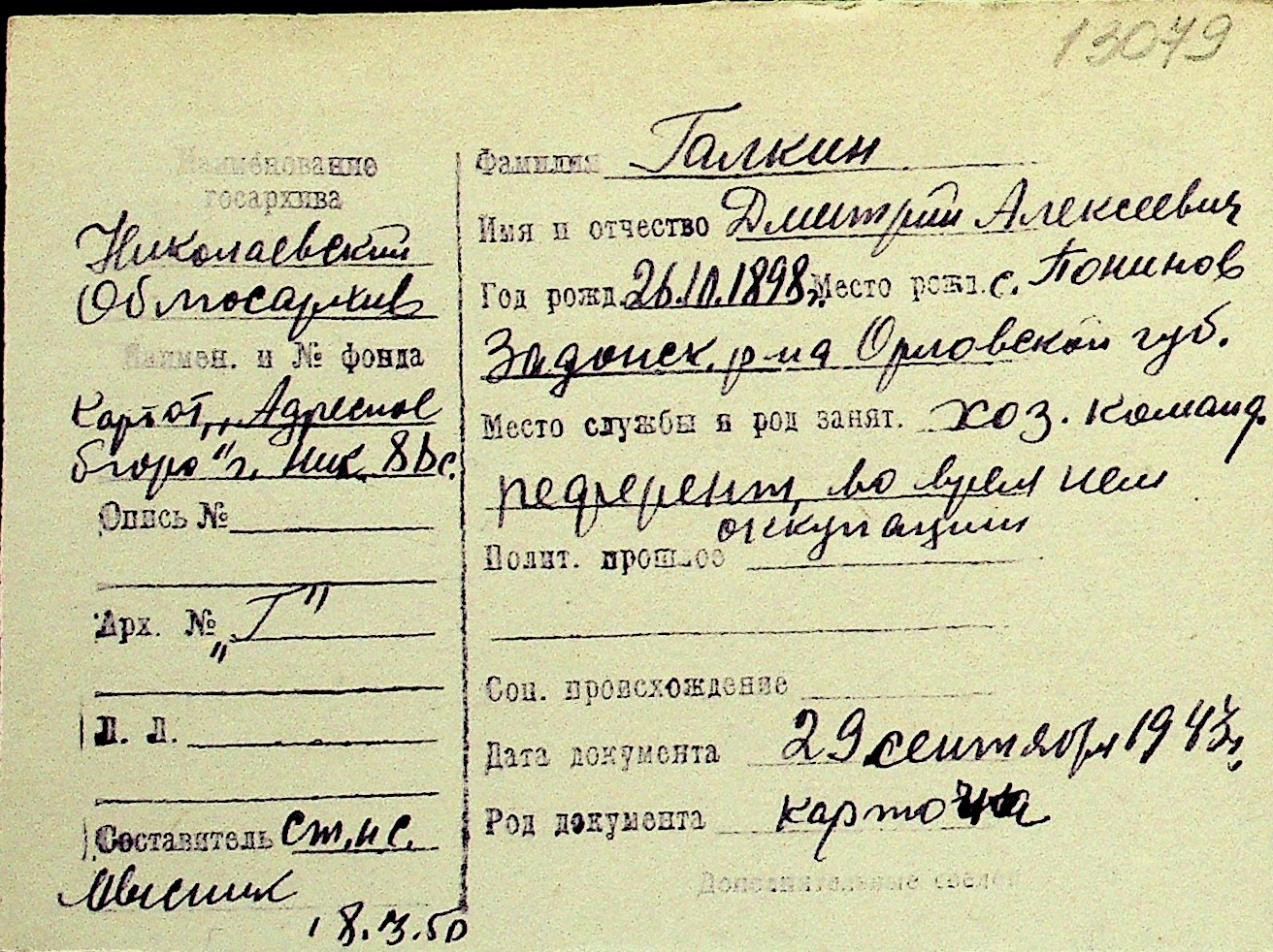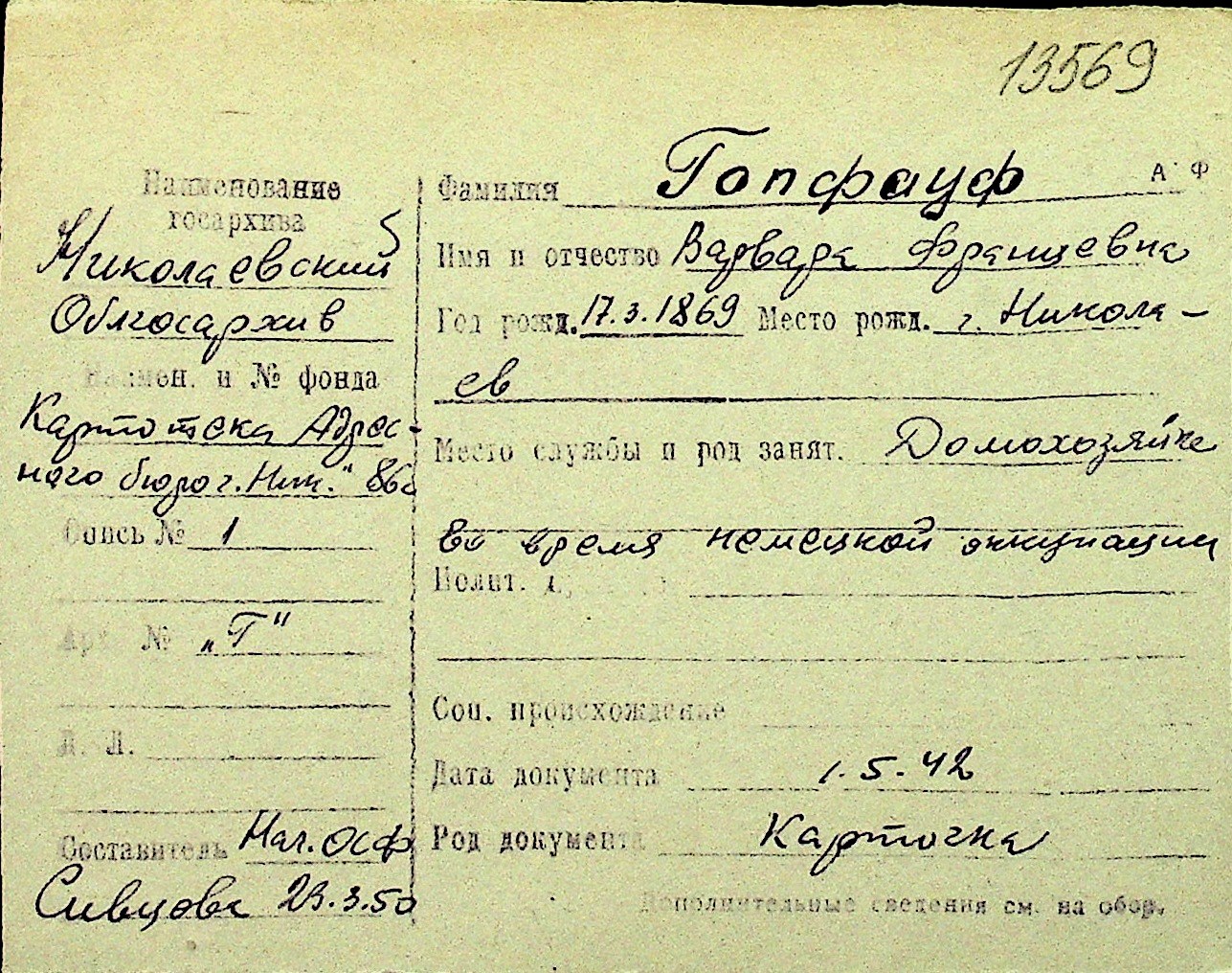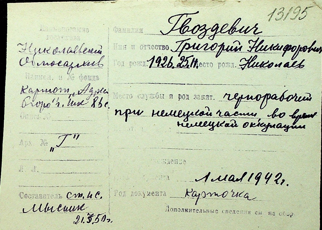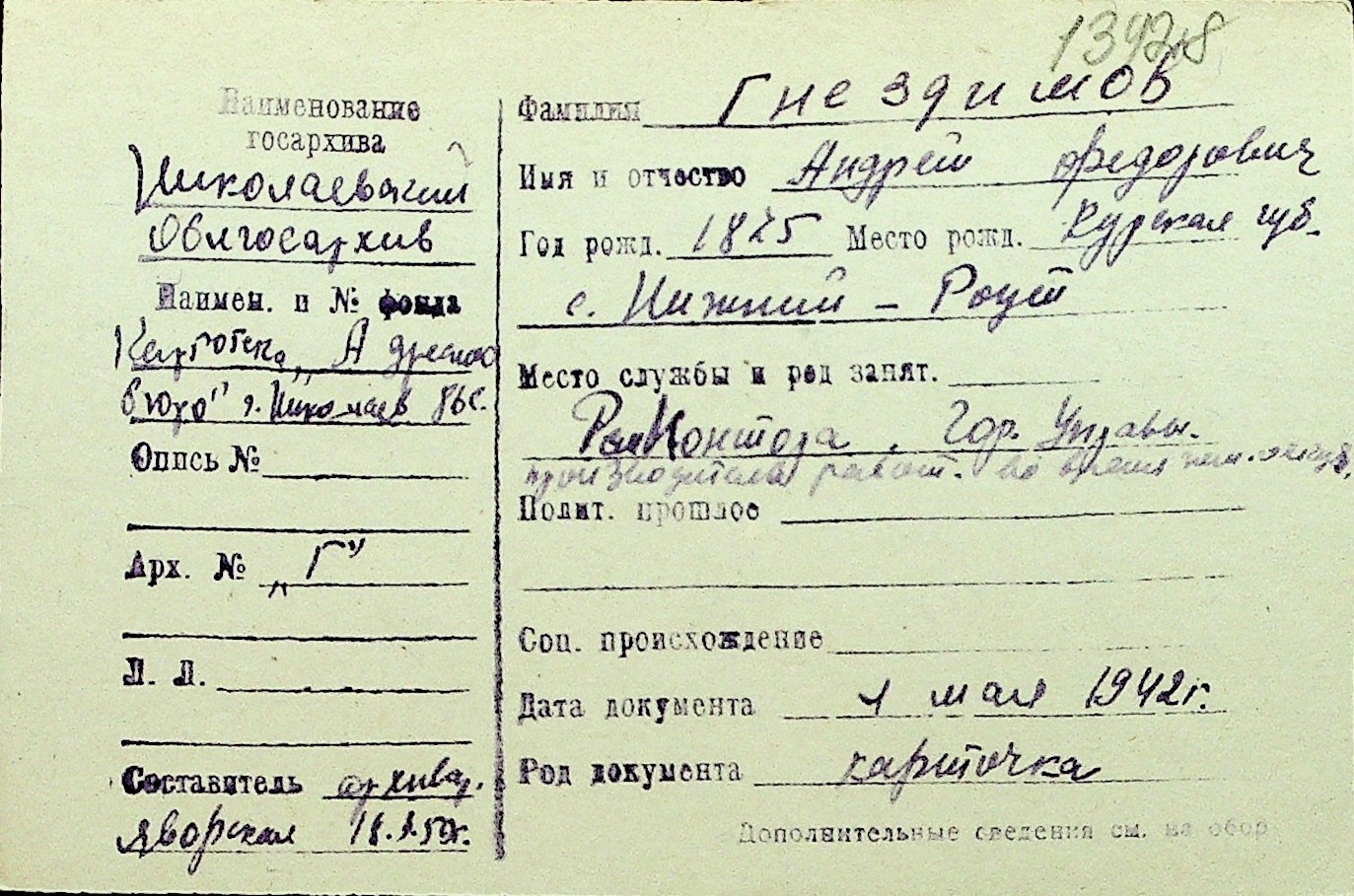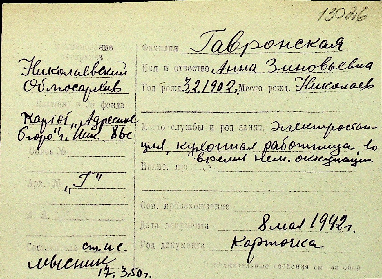 • • Перелік карток до фонду № Н-1016