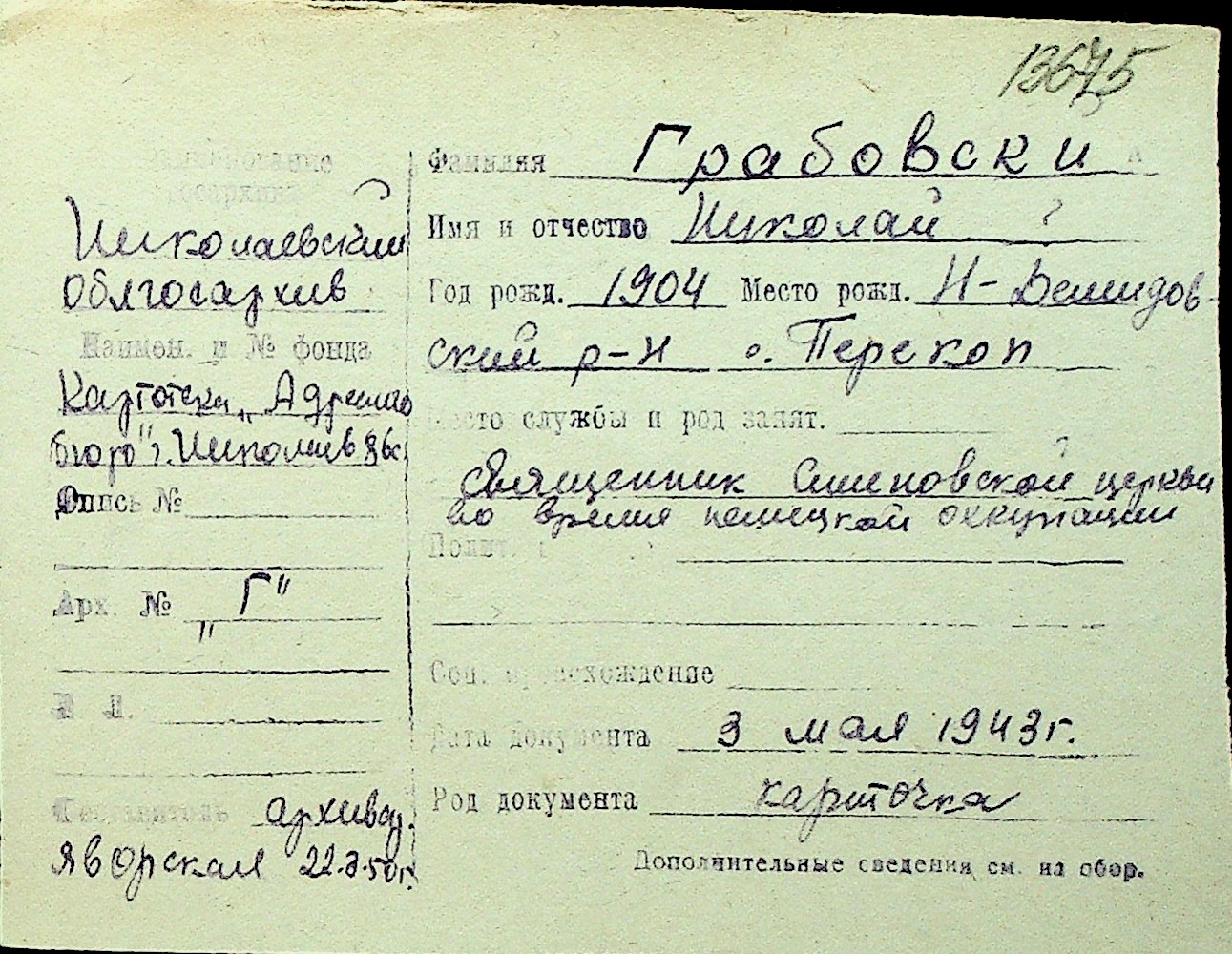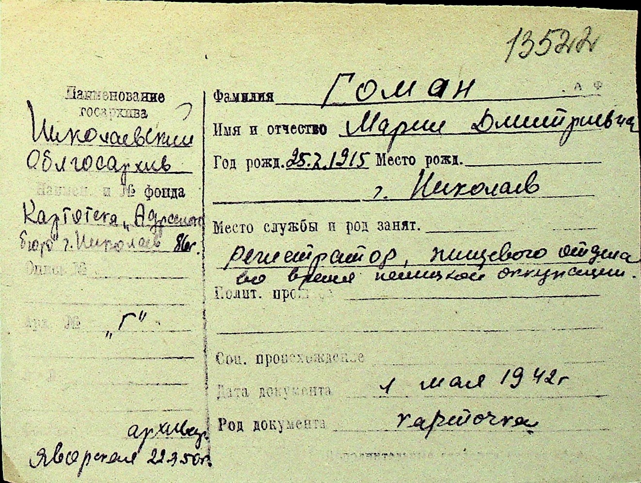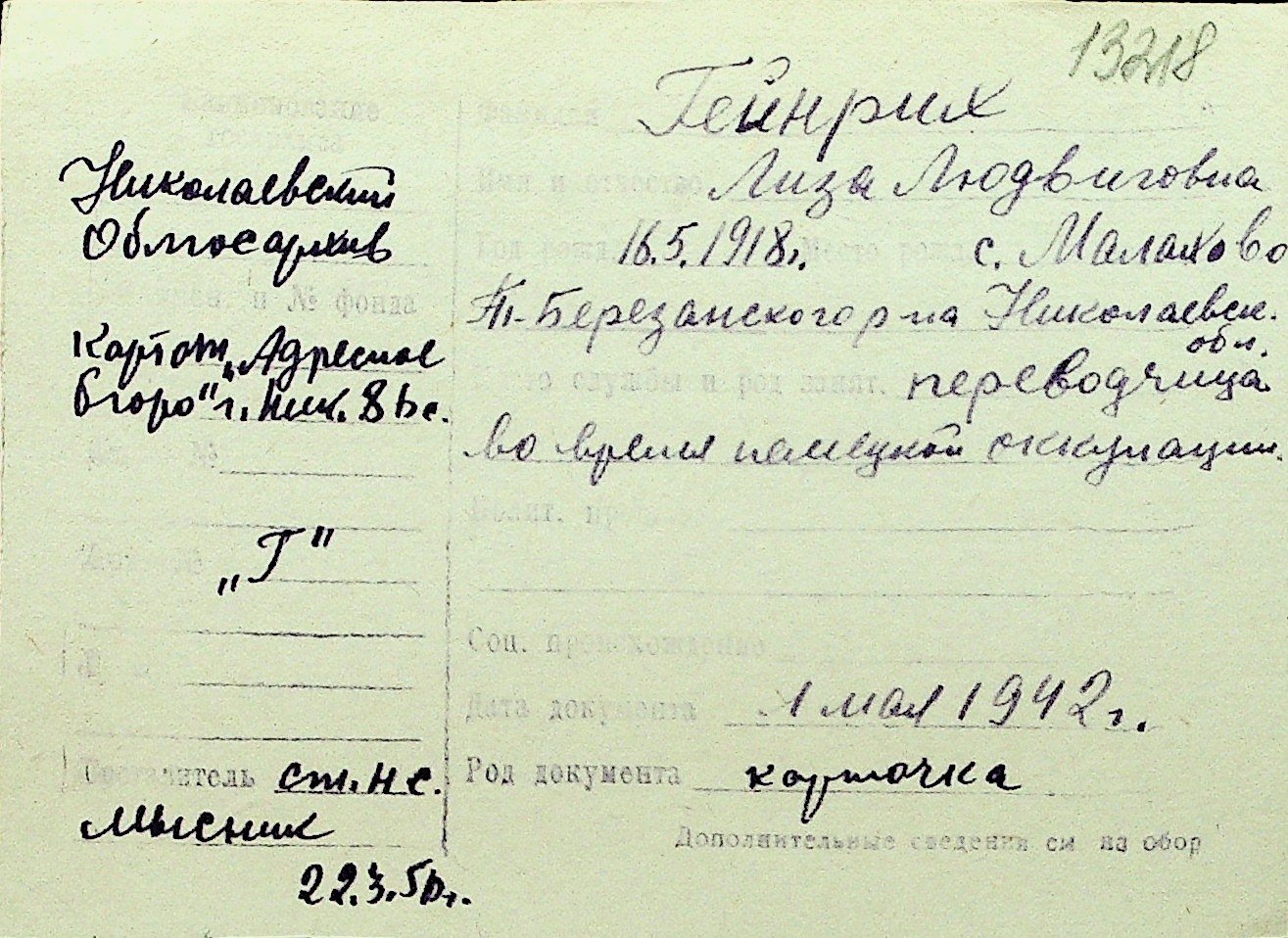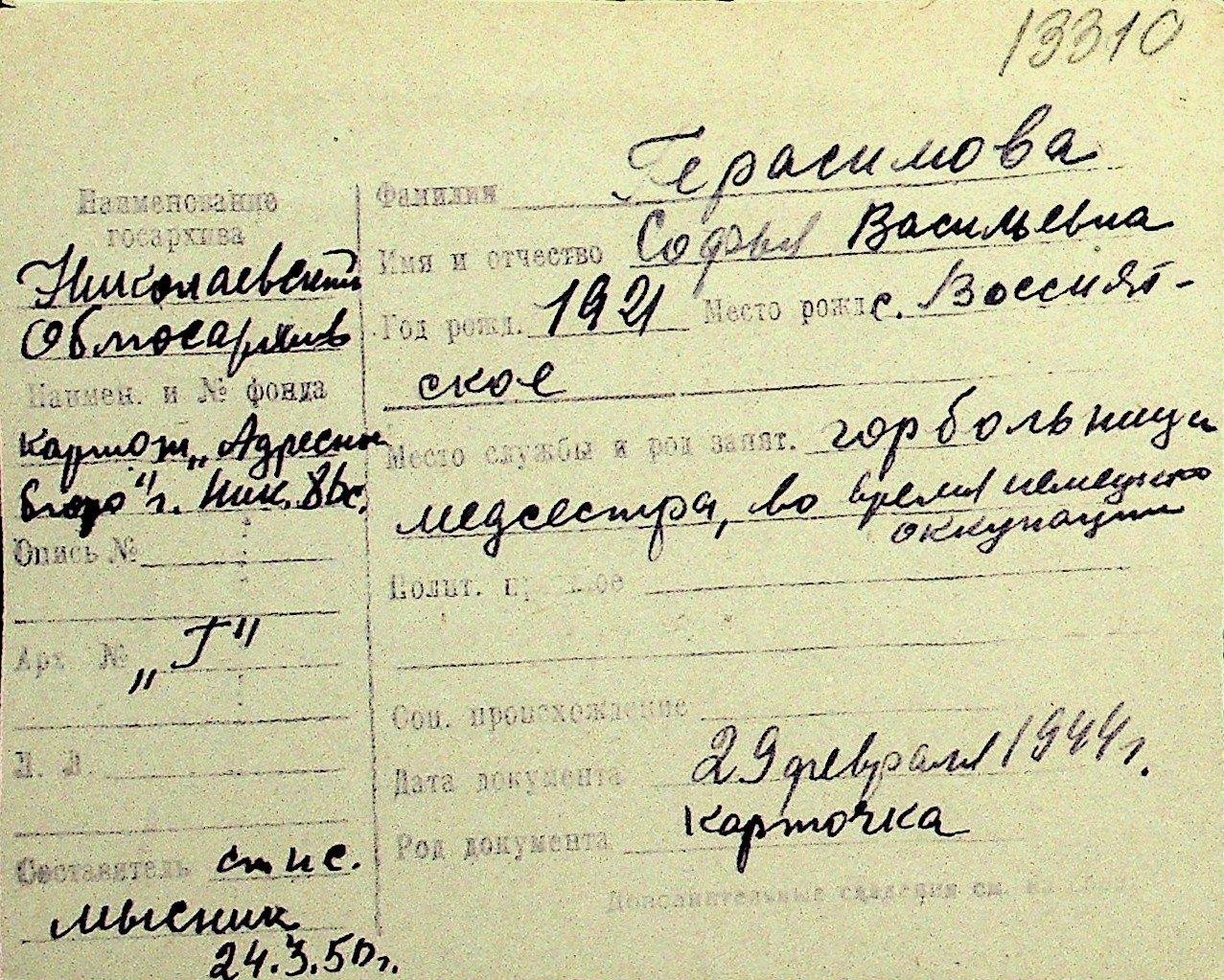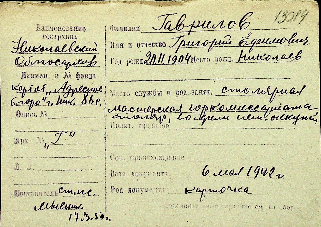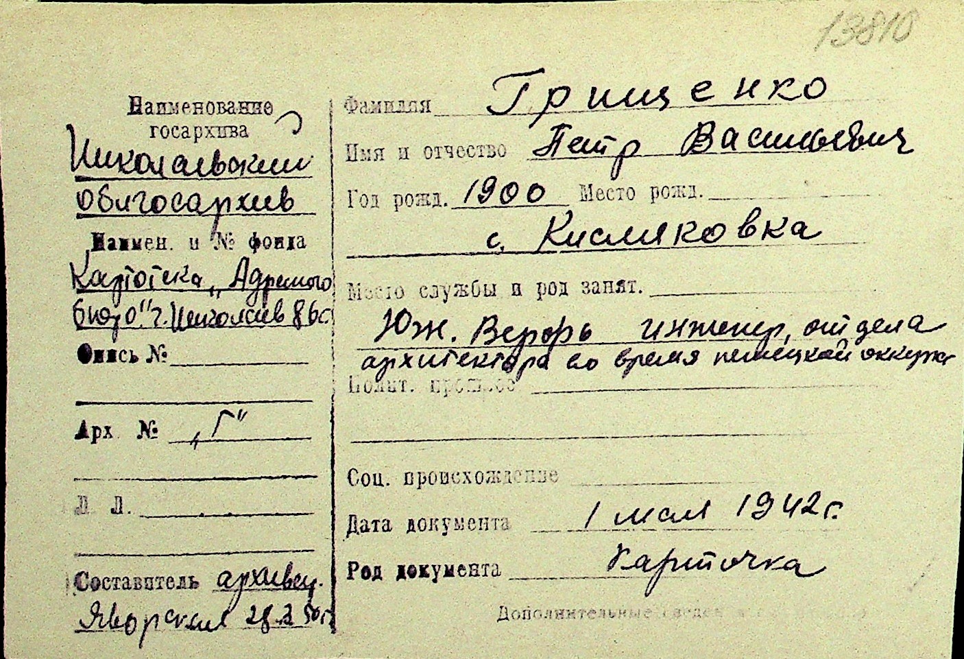 • • Перелік карток до фонду № Н-1016