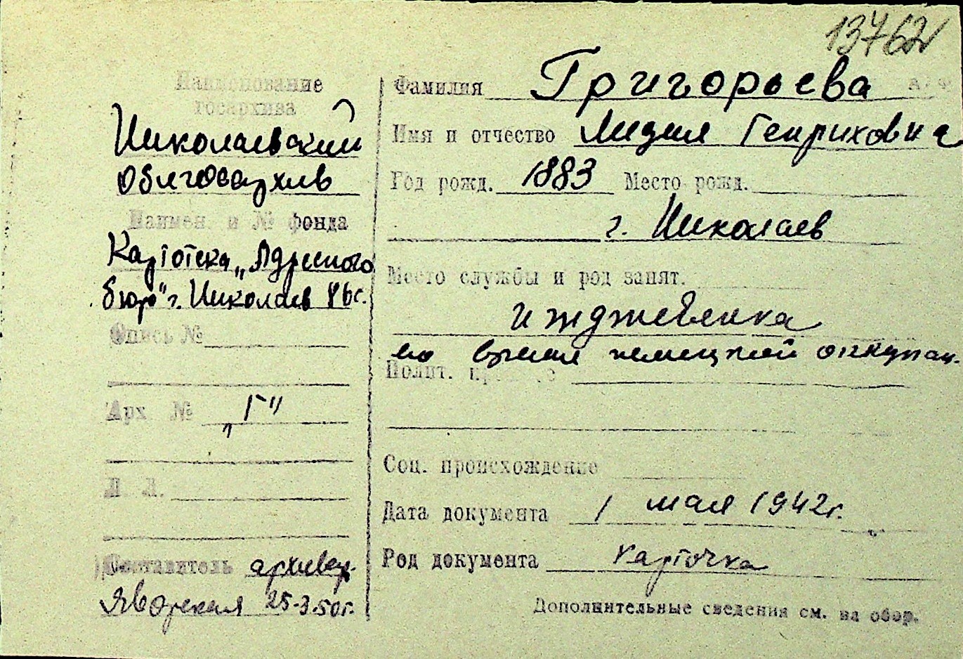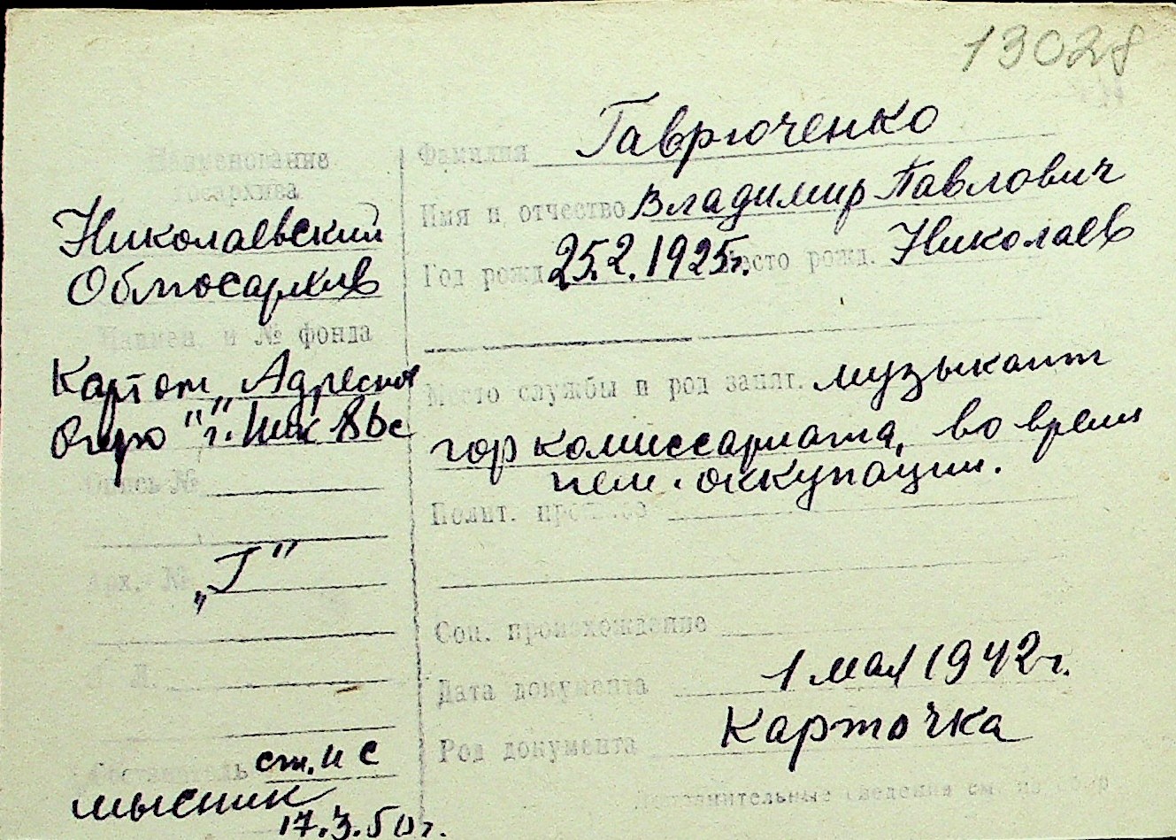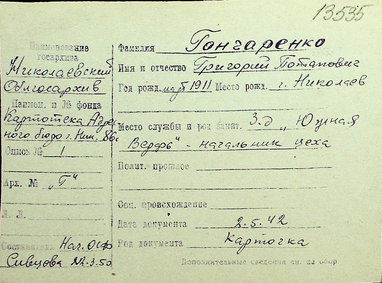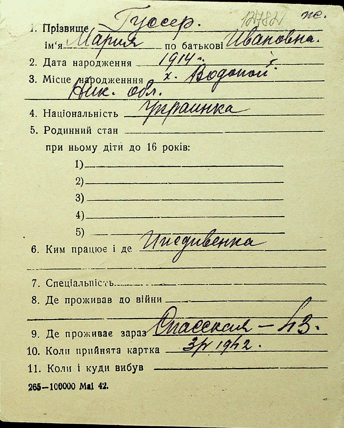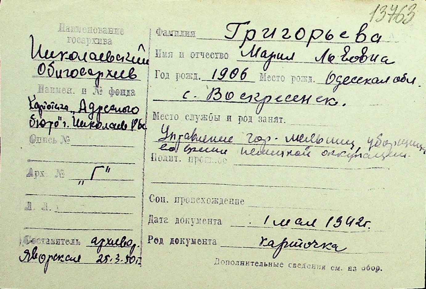 • • Перелік карток до фонду № Н-1016