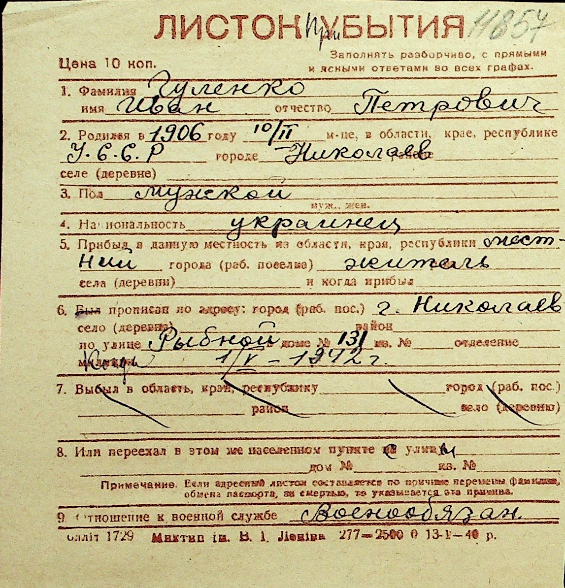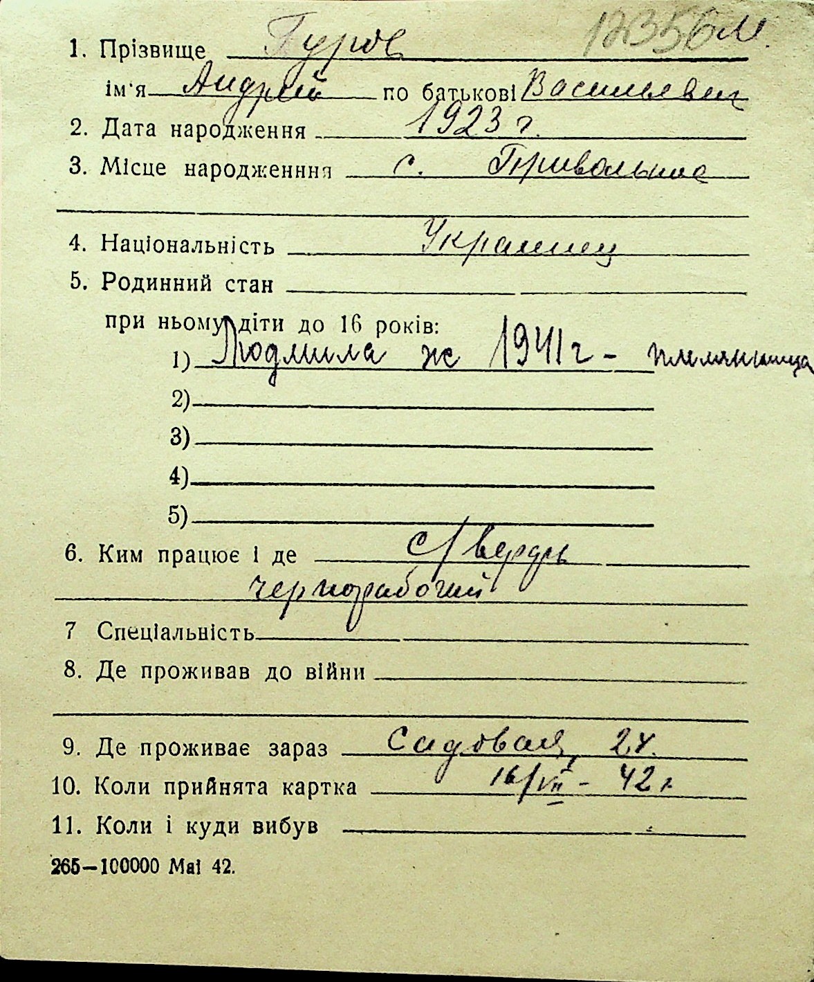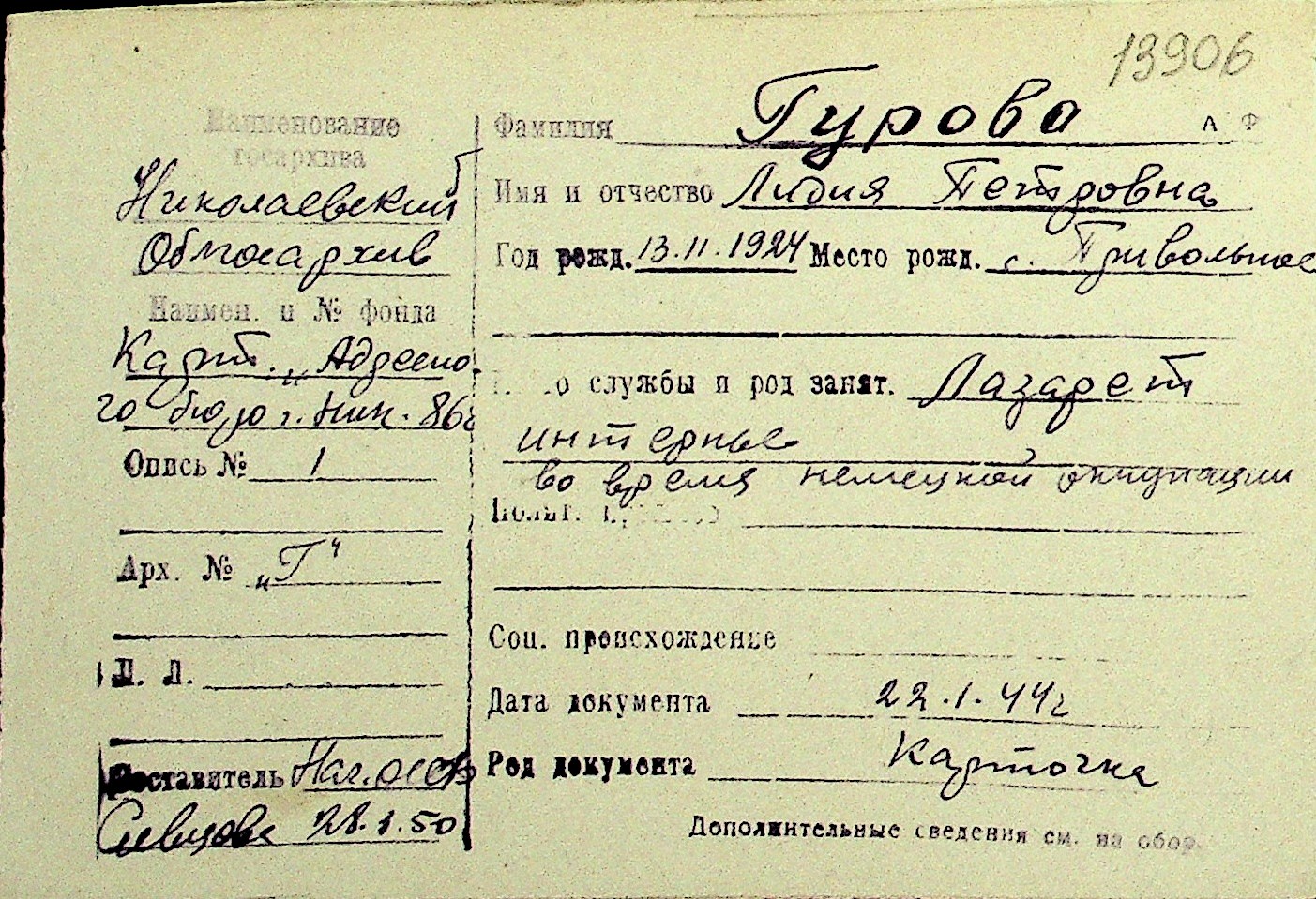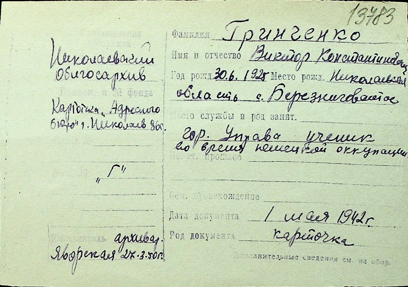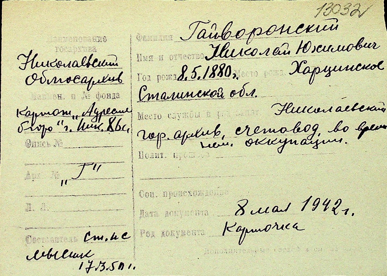 • • Перелік карток до фонду № Н-1016