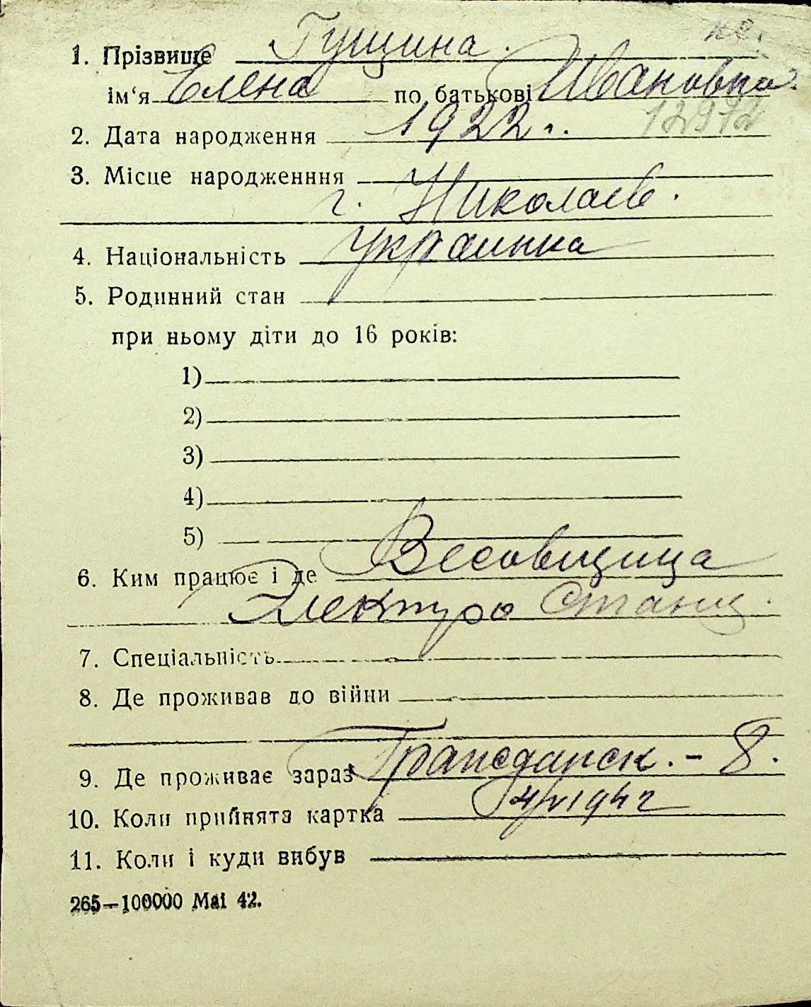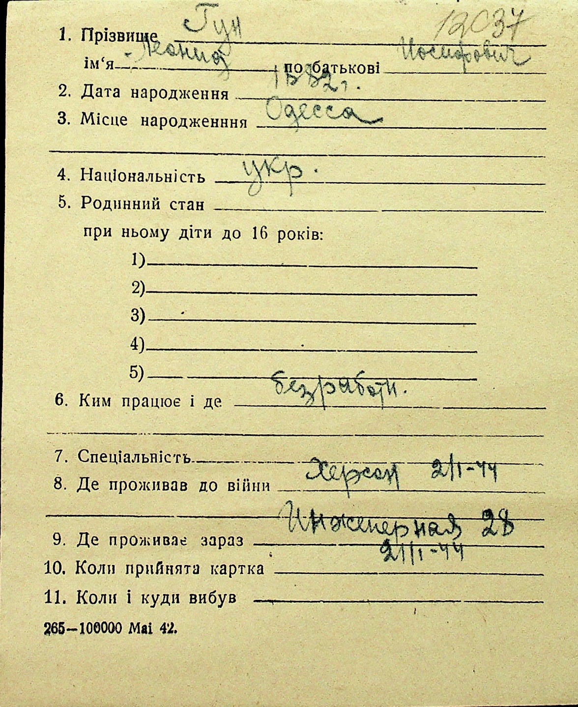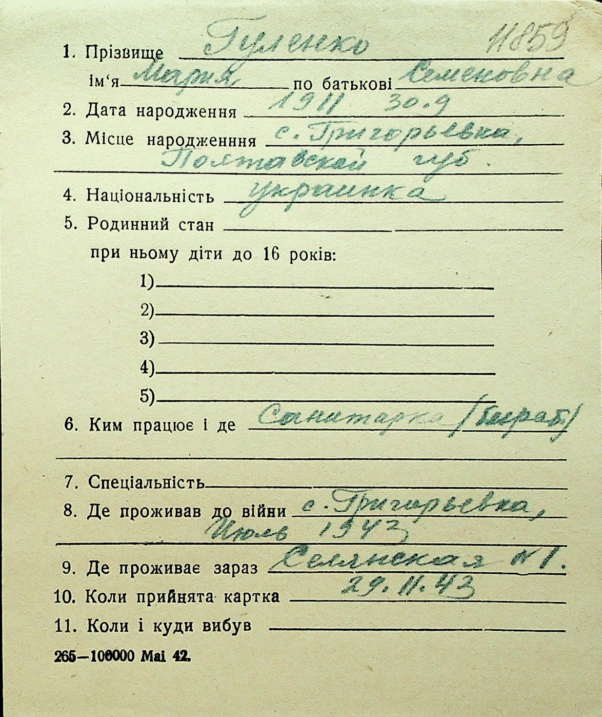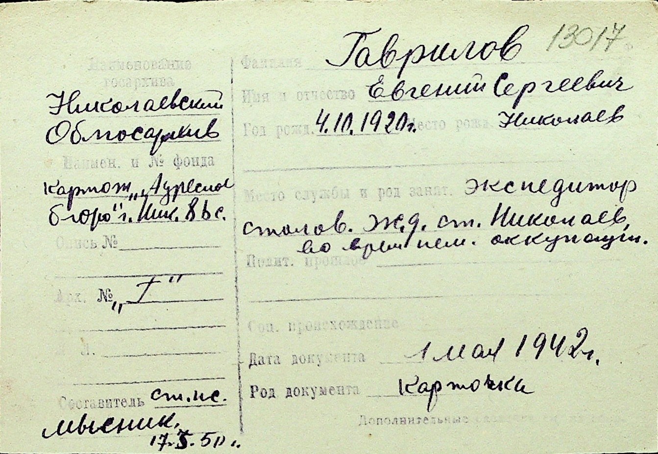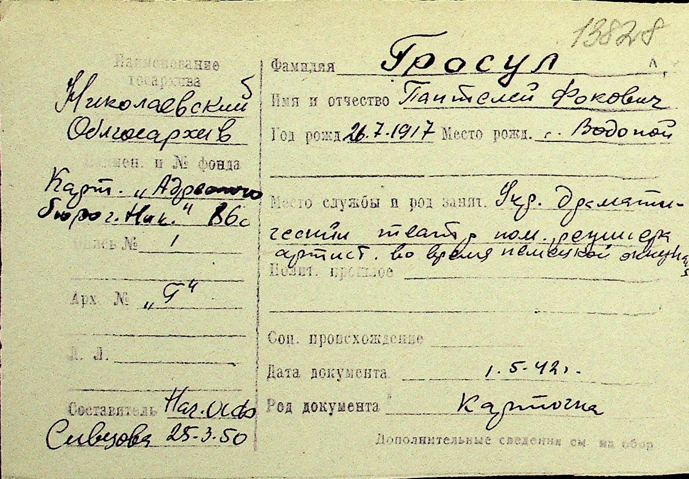 • • Перелік карток до фонду № Н-1016