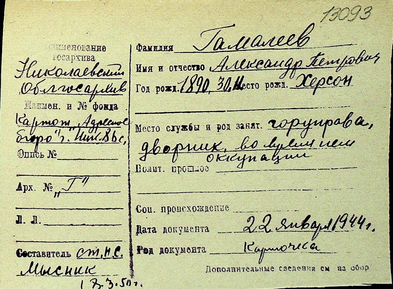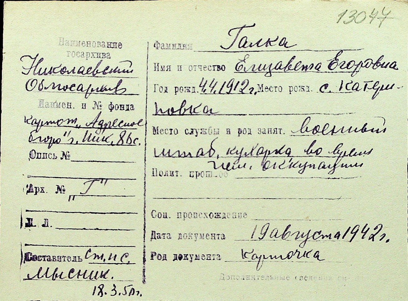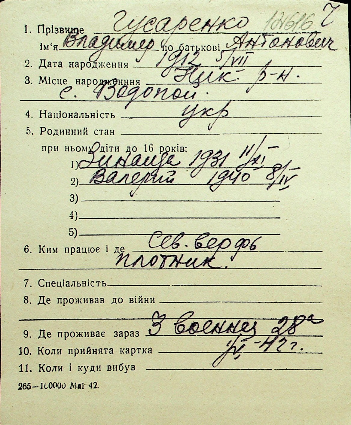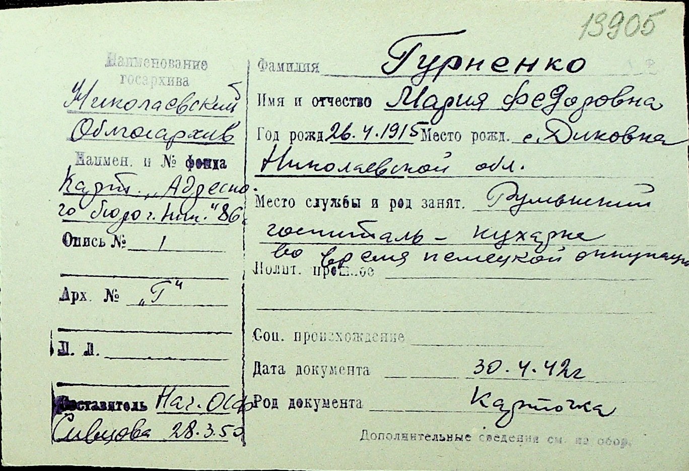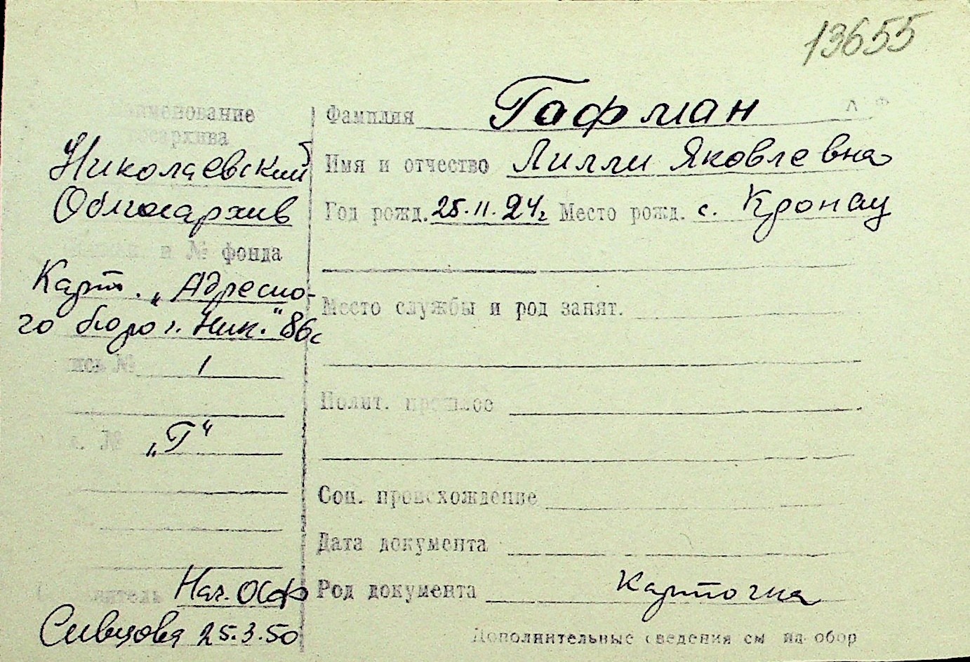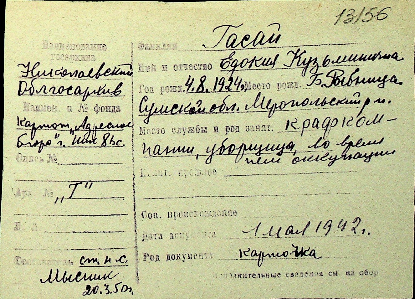• • Перелік карток до фонду № Н-1016
