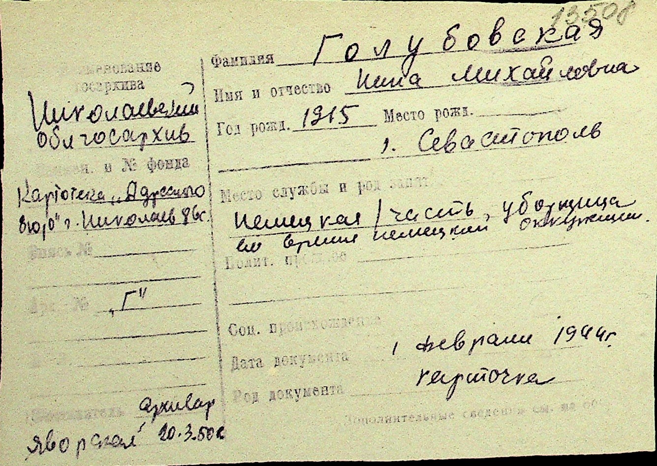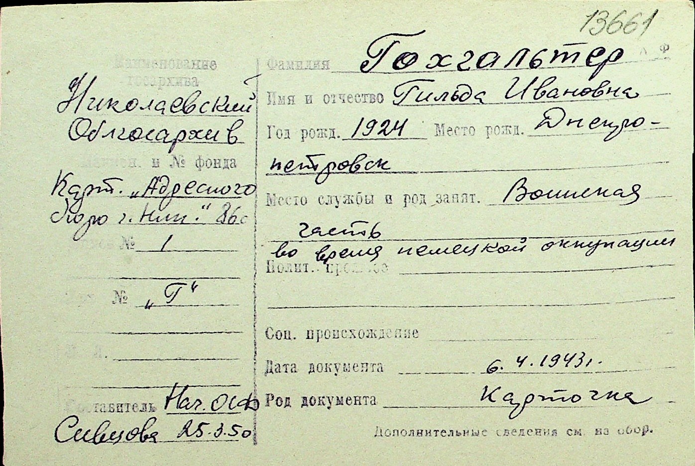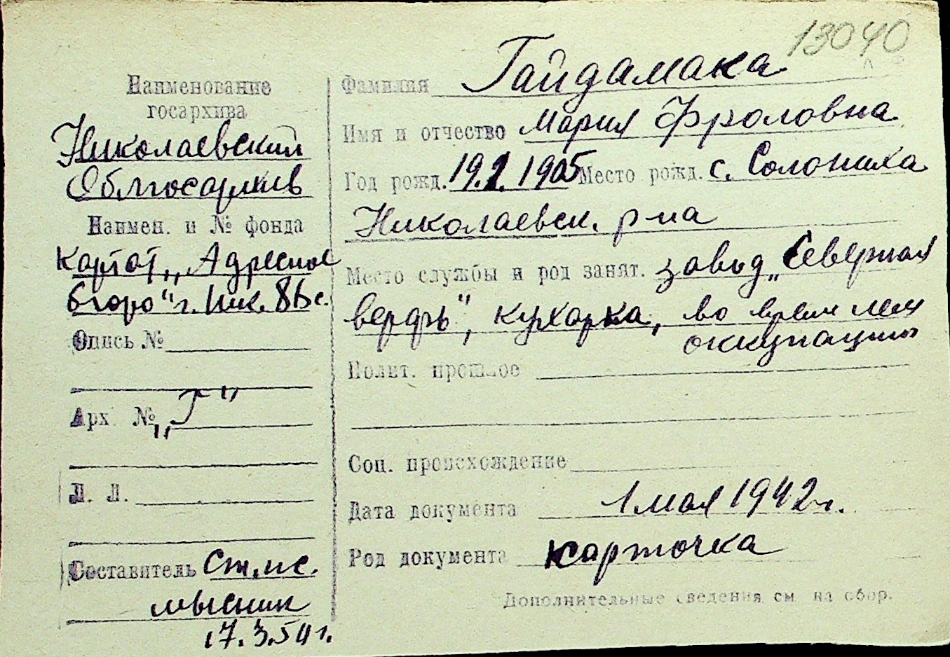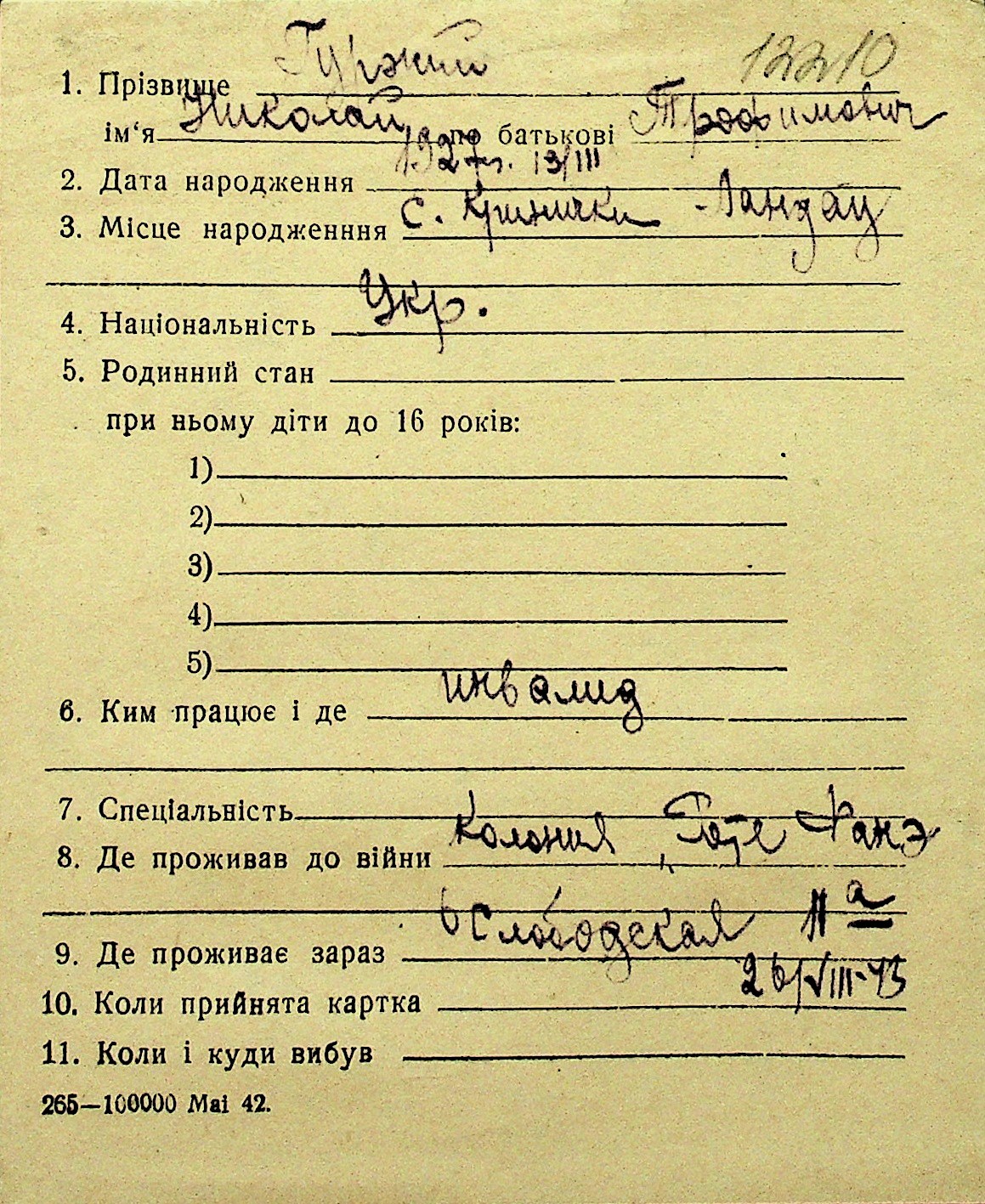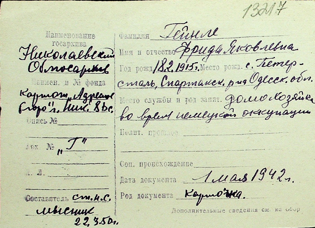 • • Перелік карток до фонду № Н-1016