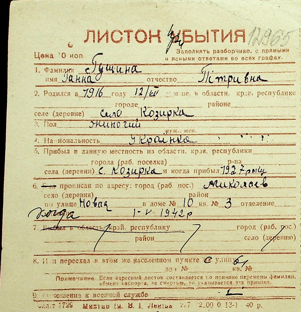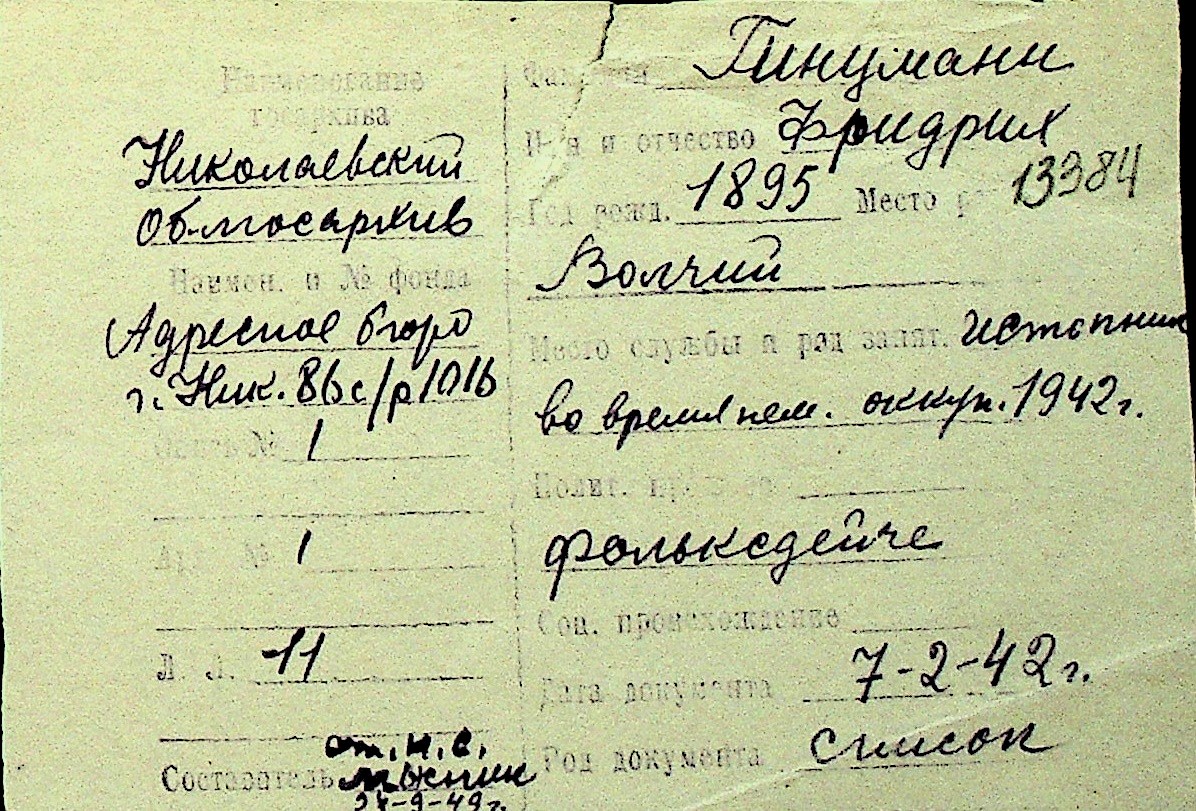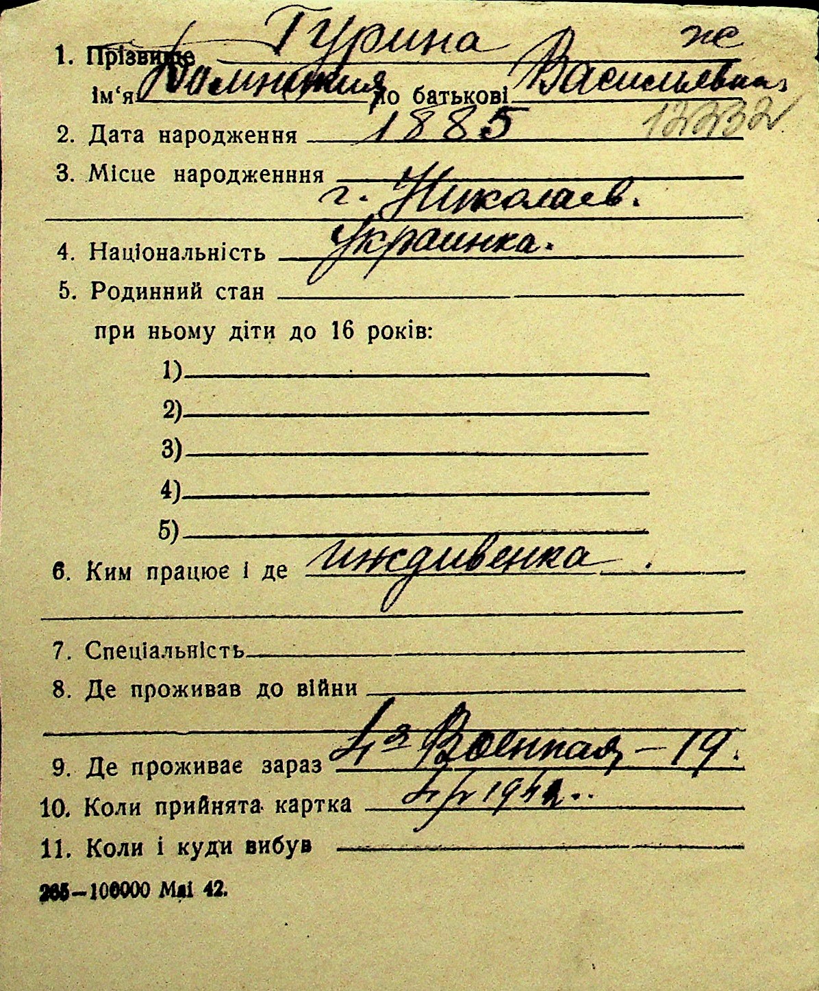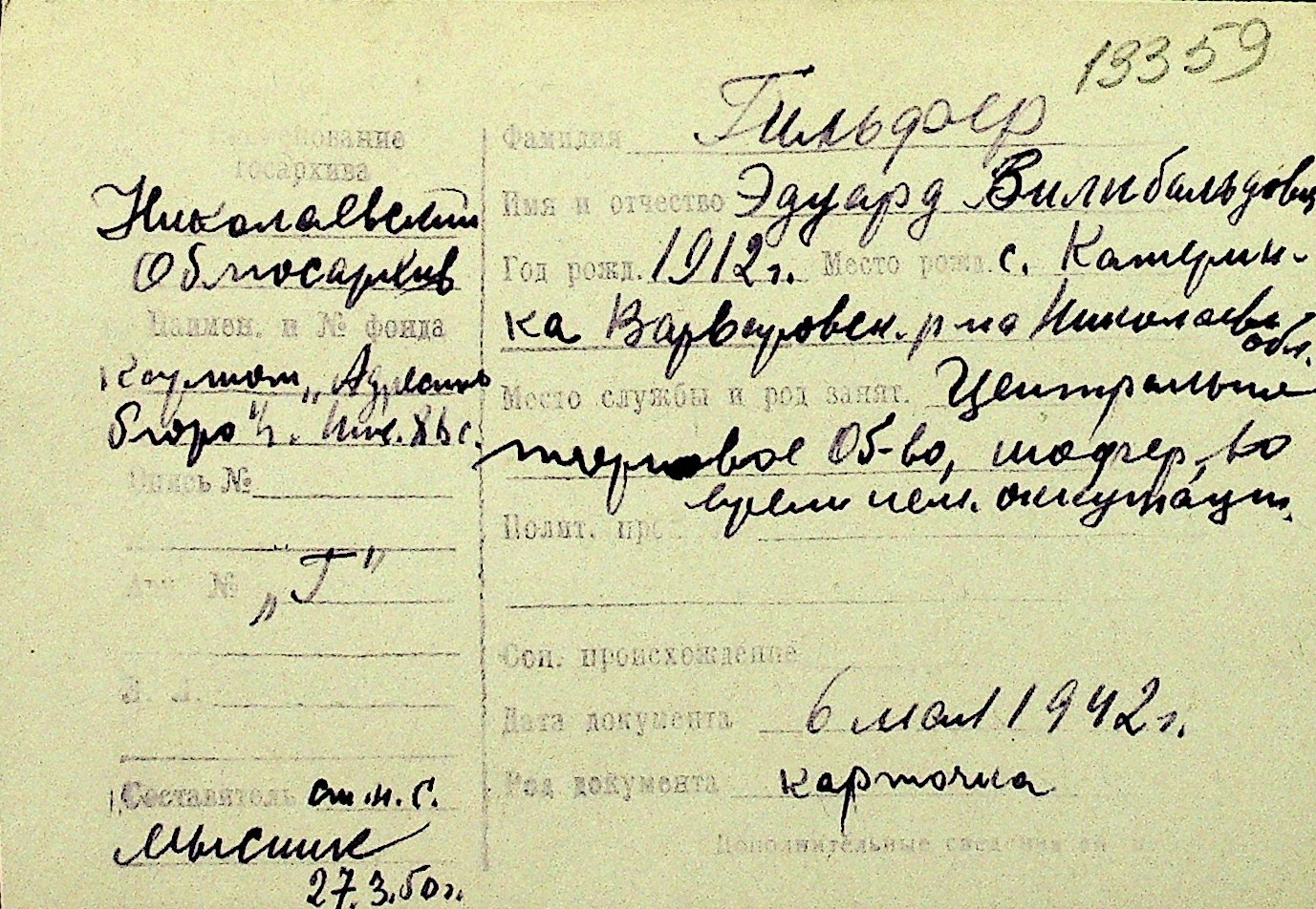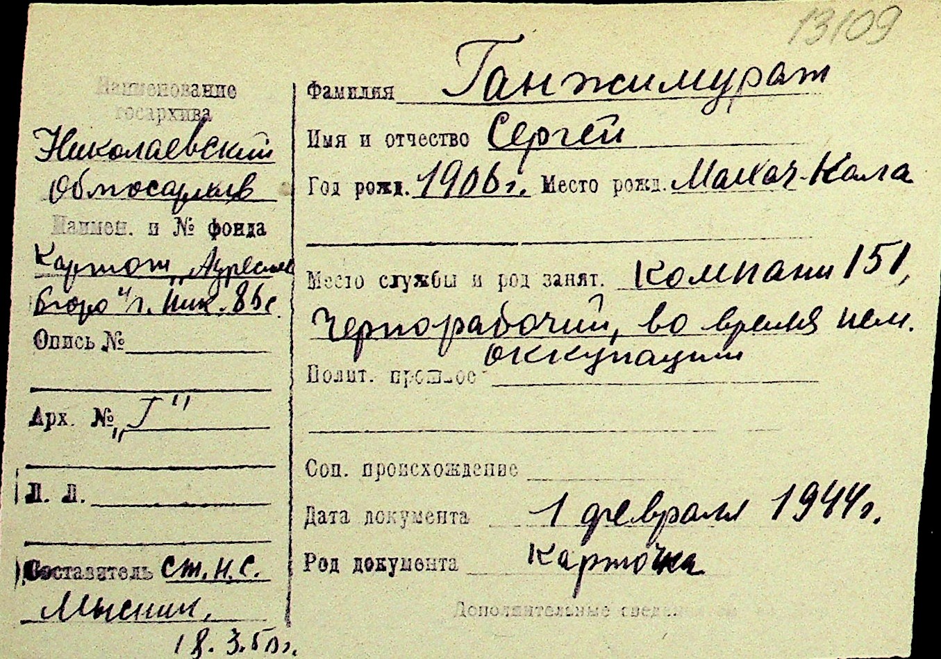 • • Перелік карток до фонду № Н-1016