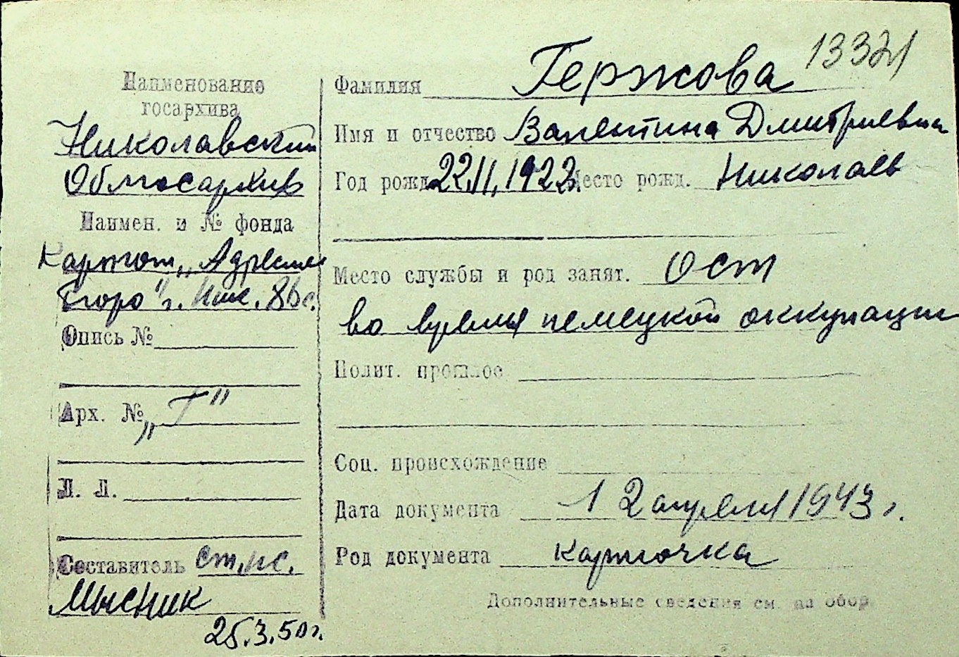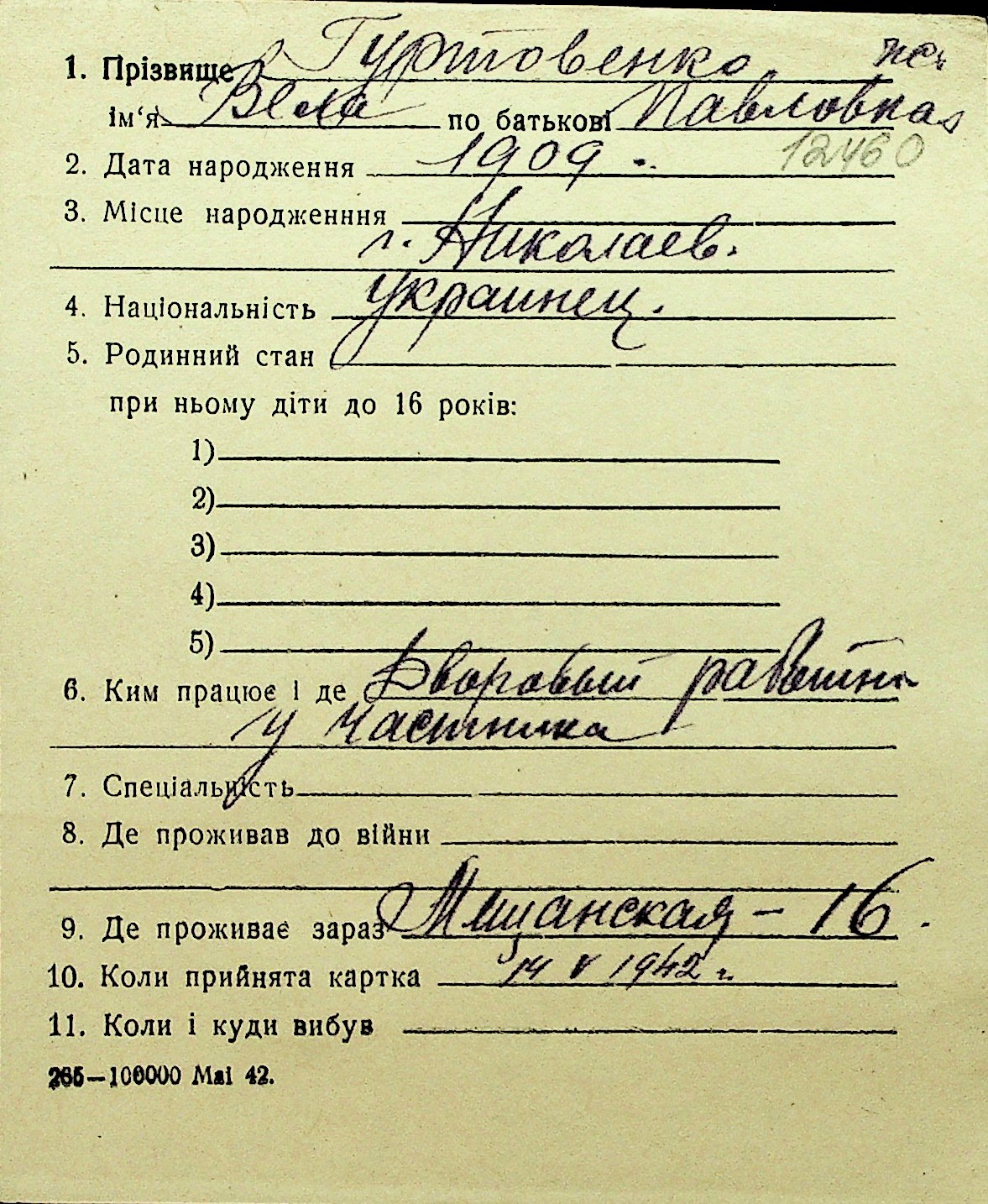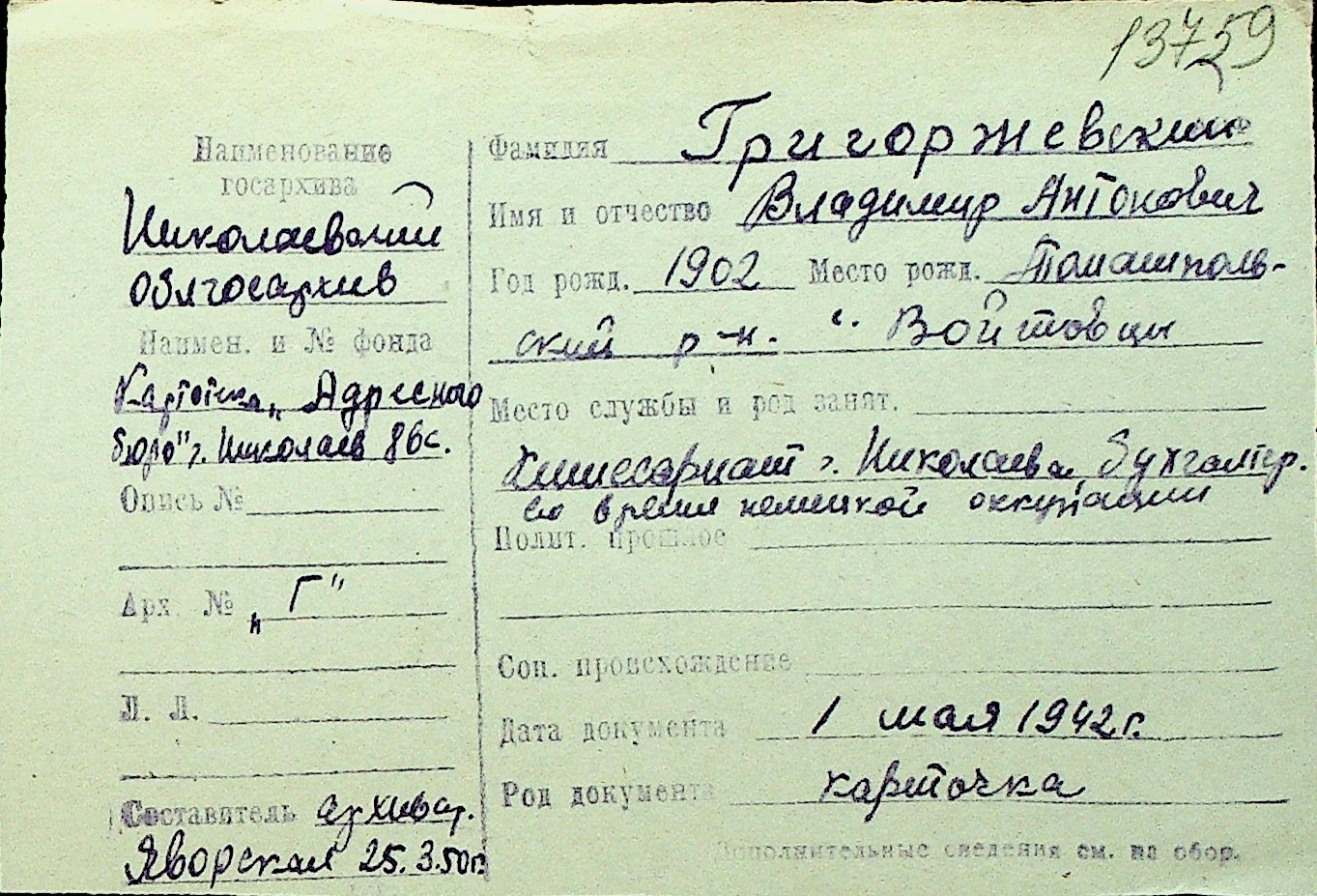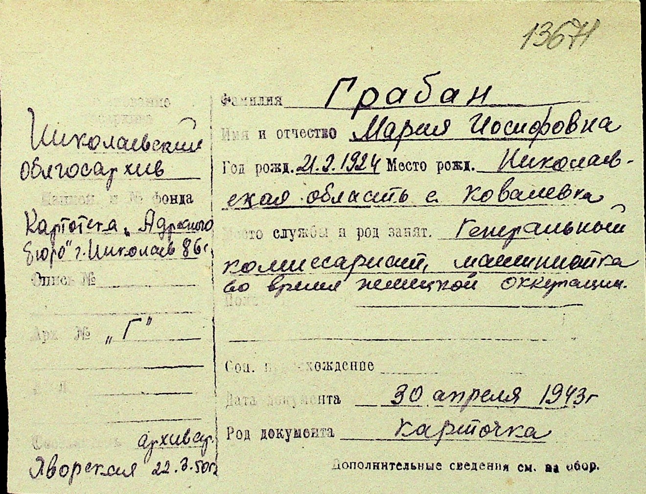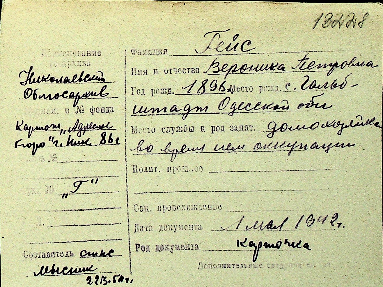 • • Перелік карток до фонду № Н-1016