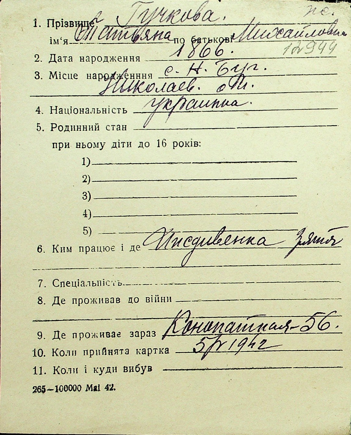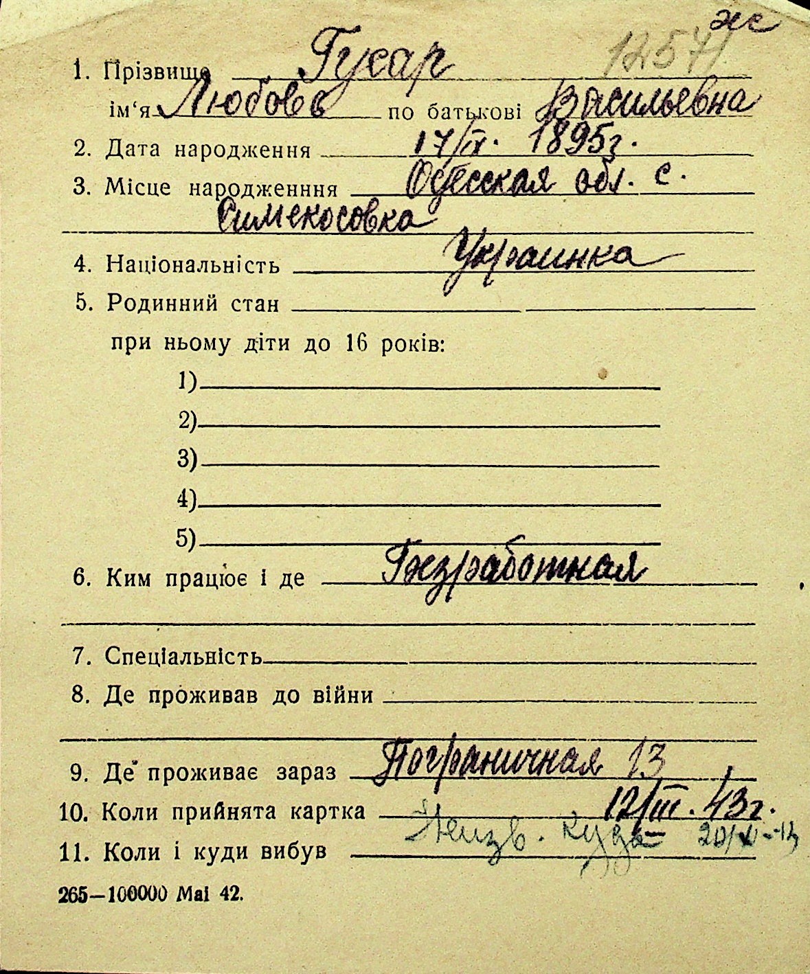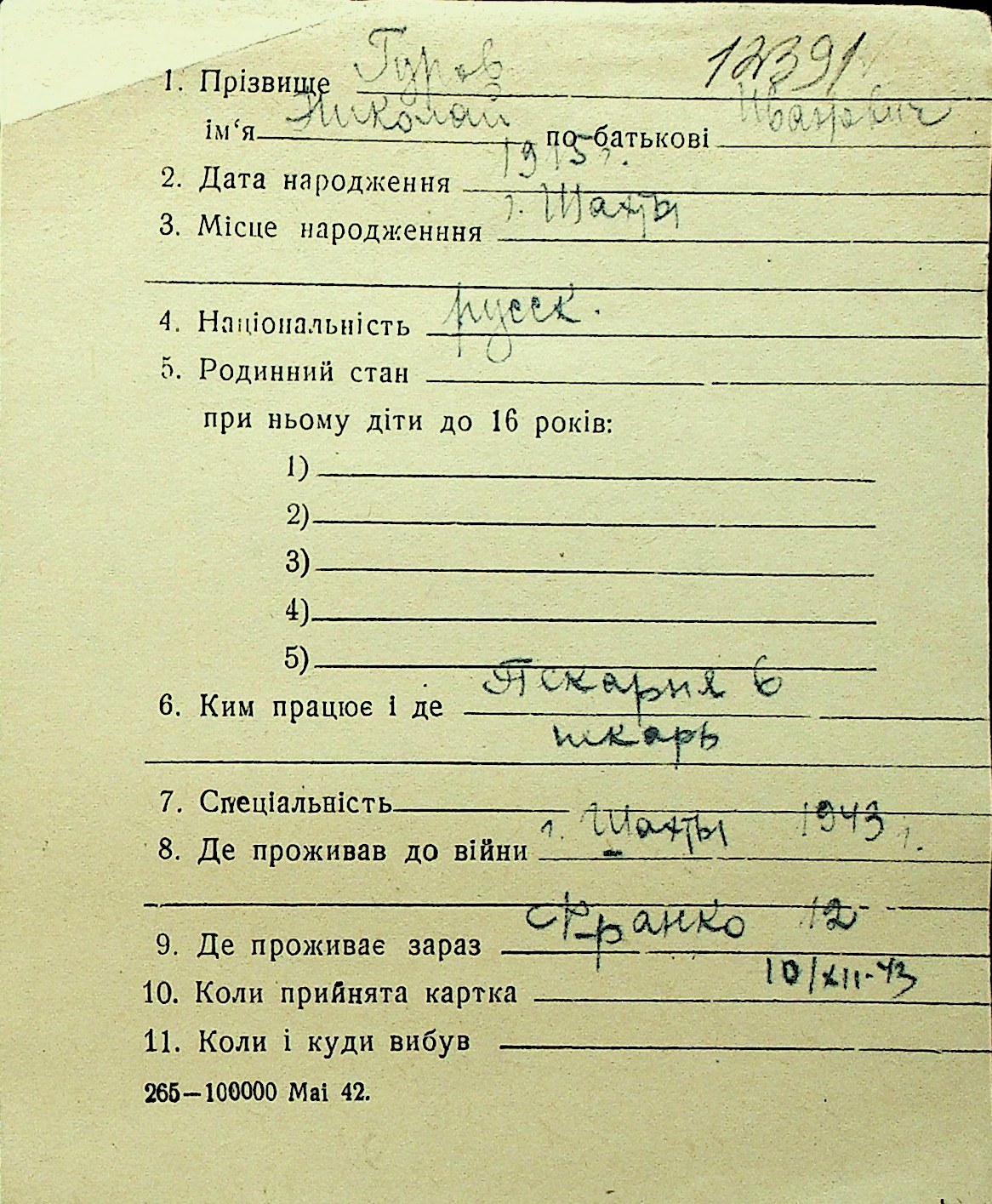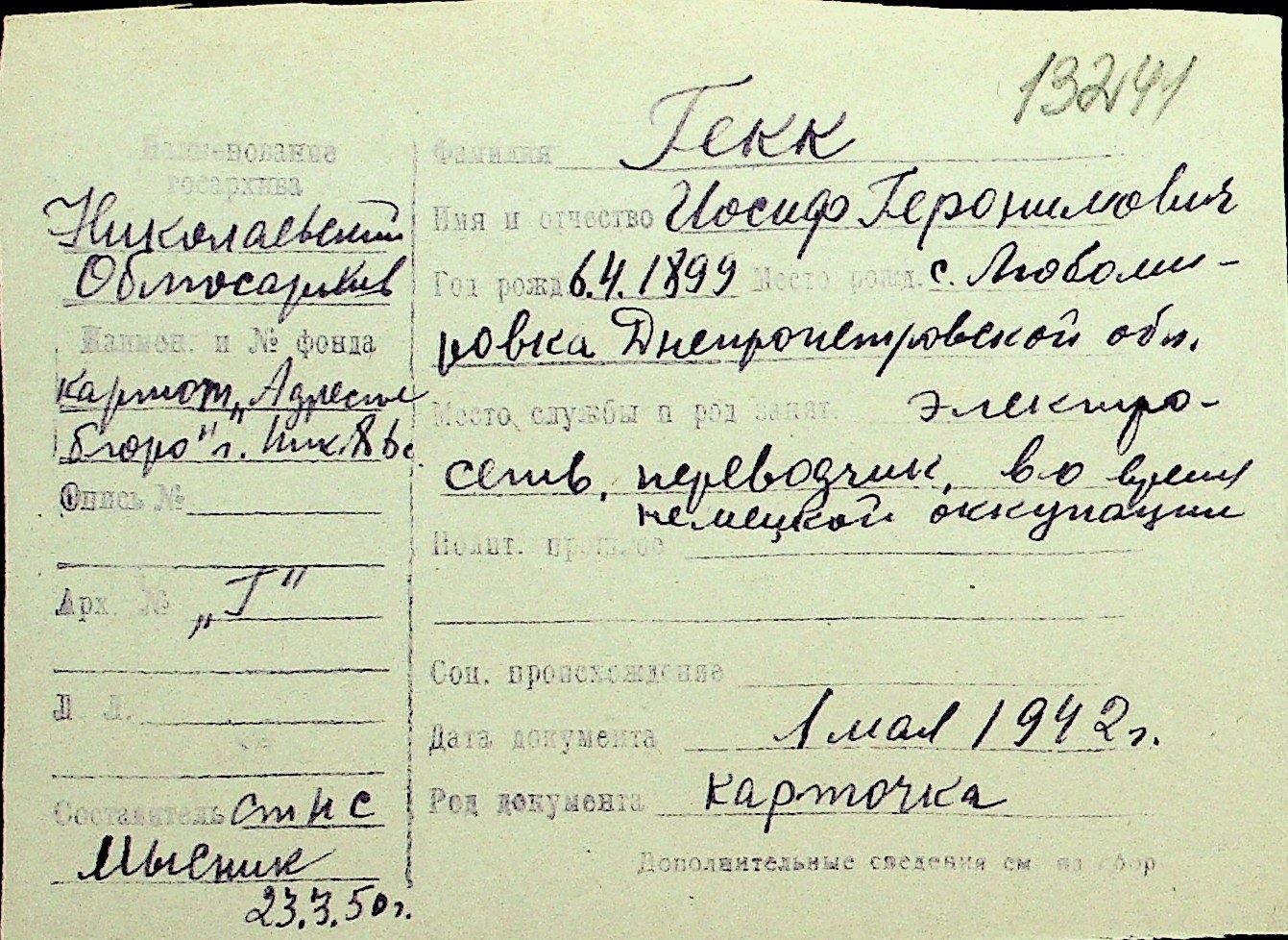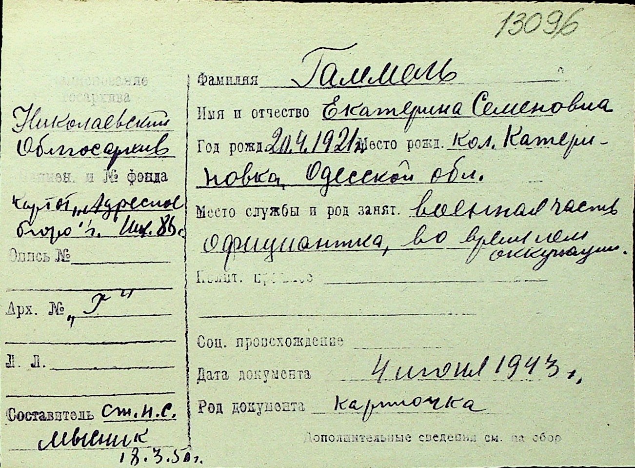 • • Перелік карток до фонду № Н-1016