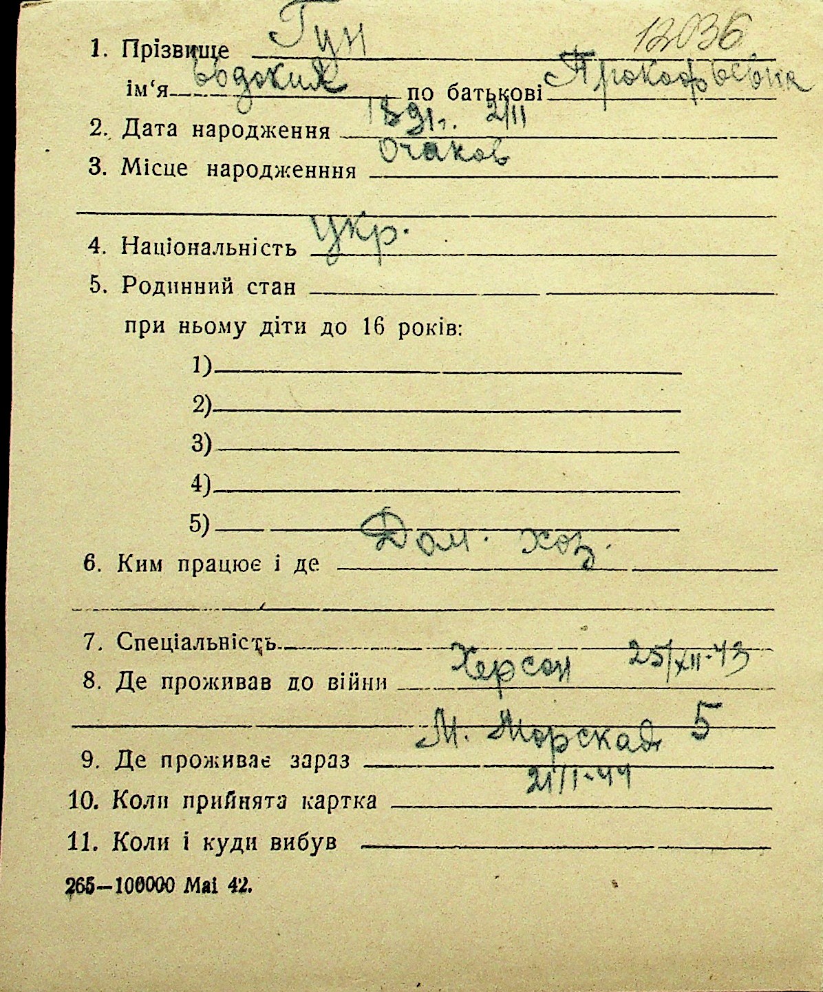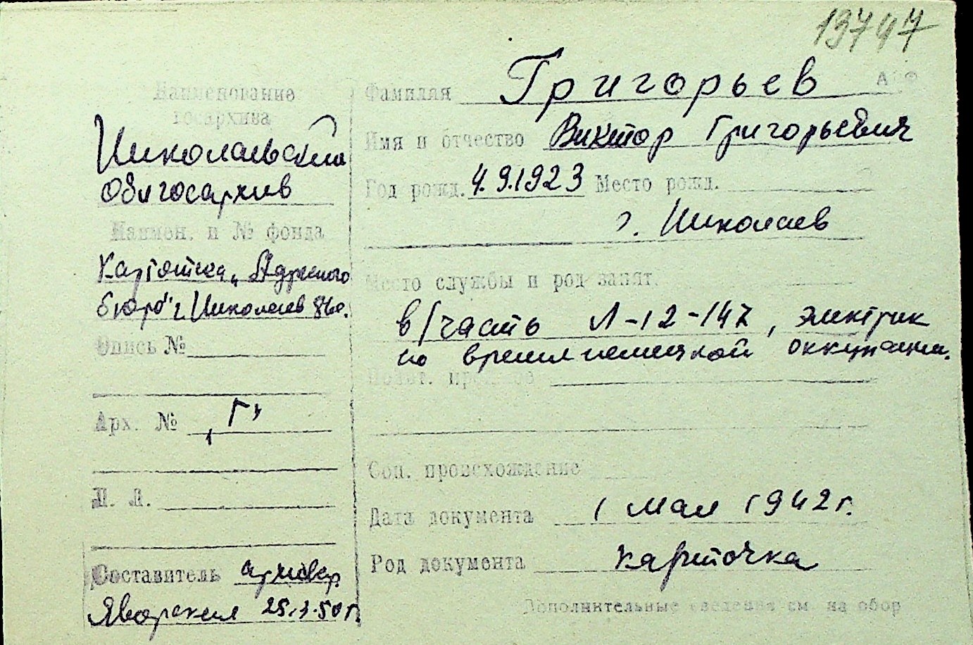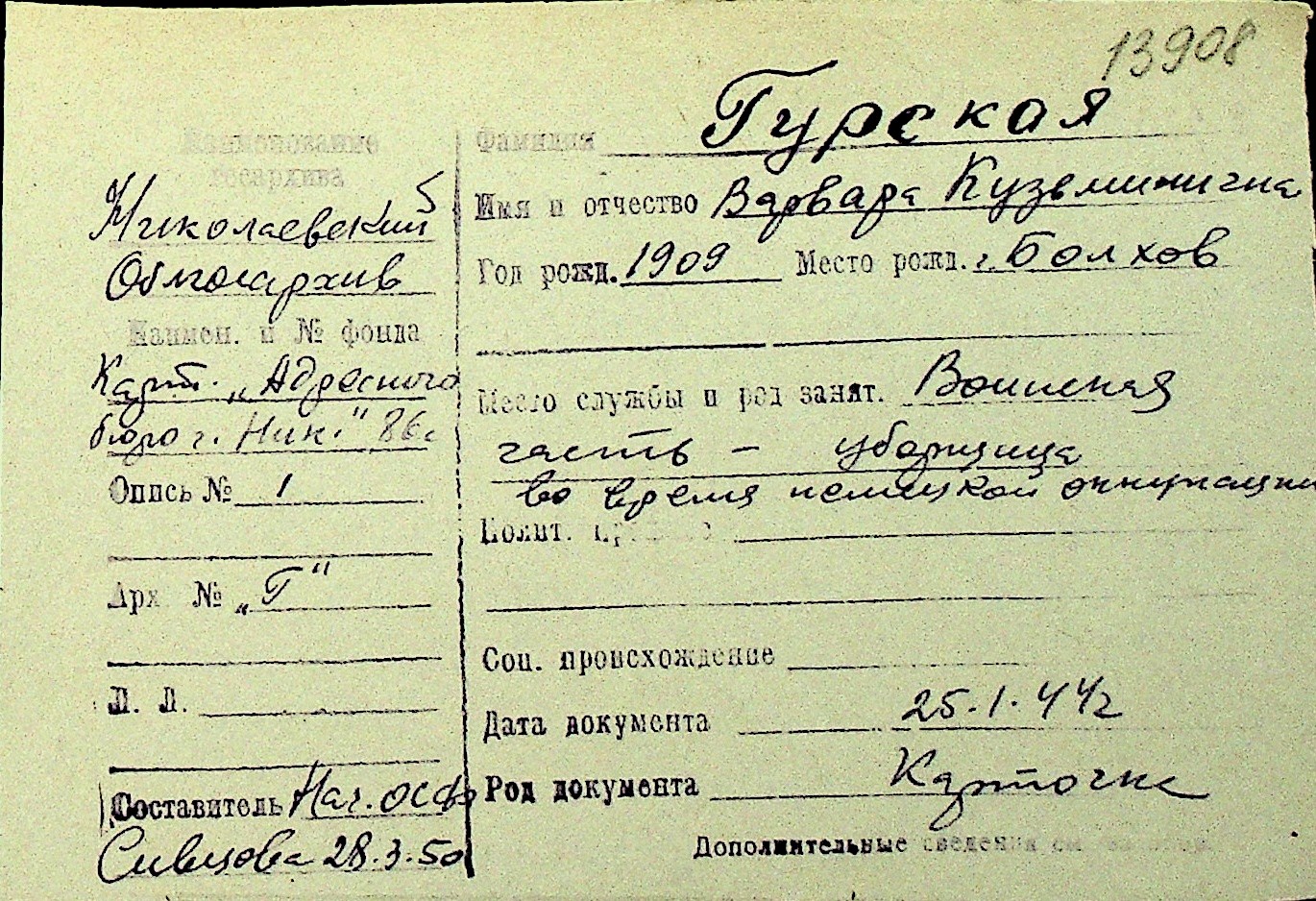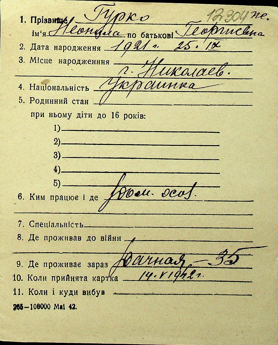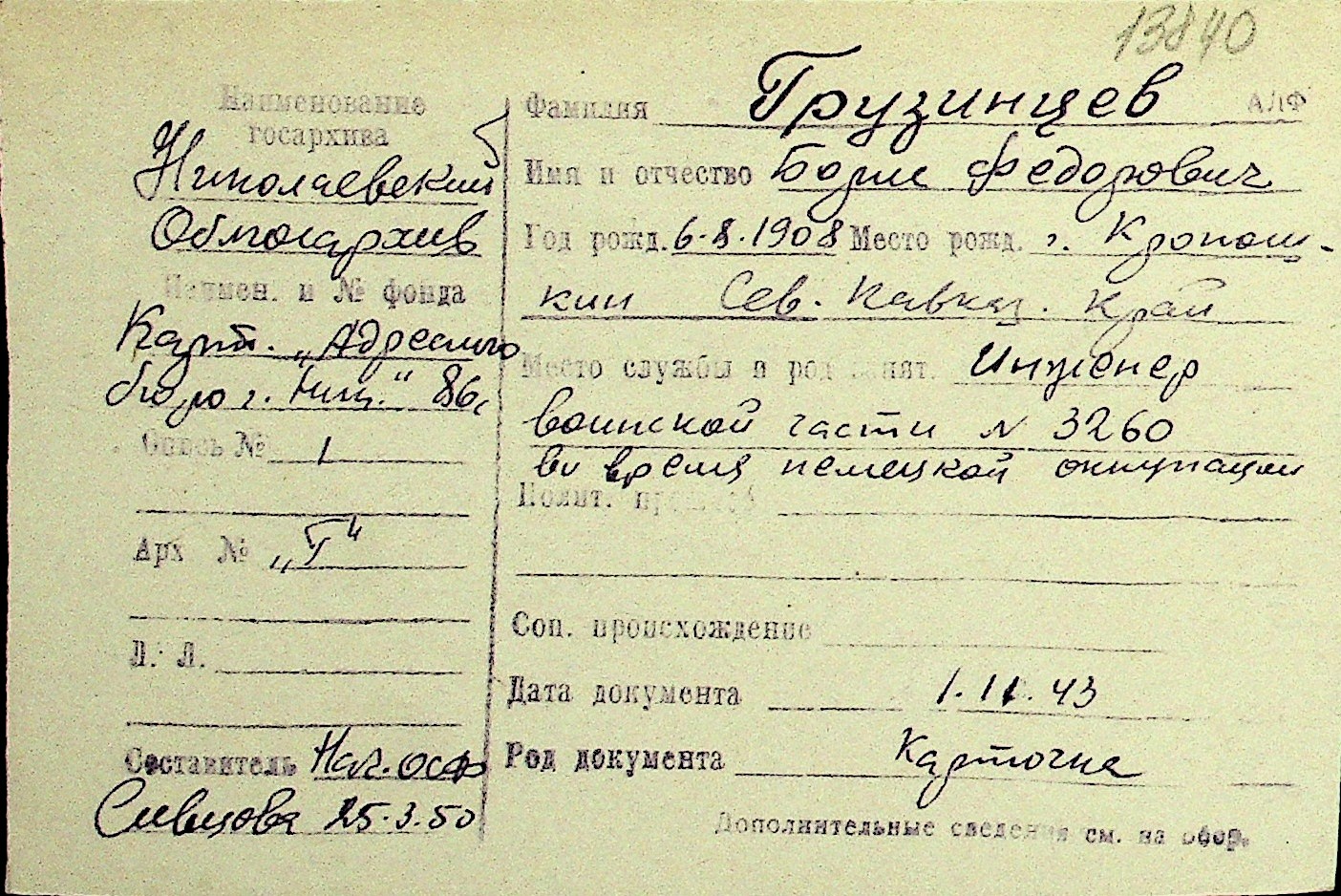 • • Перелік карток до фонду № Н-1016