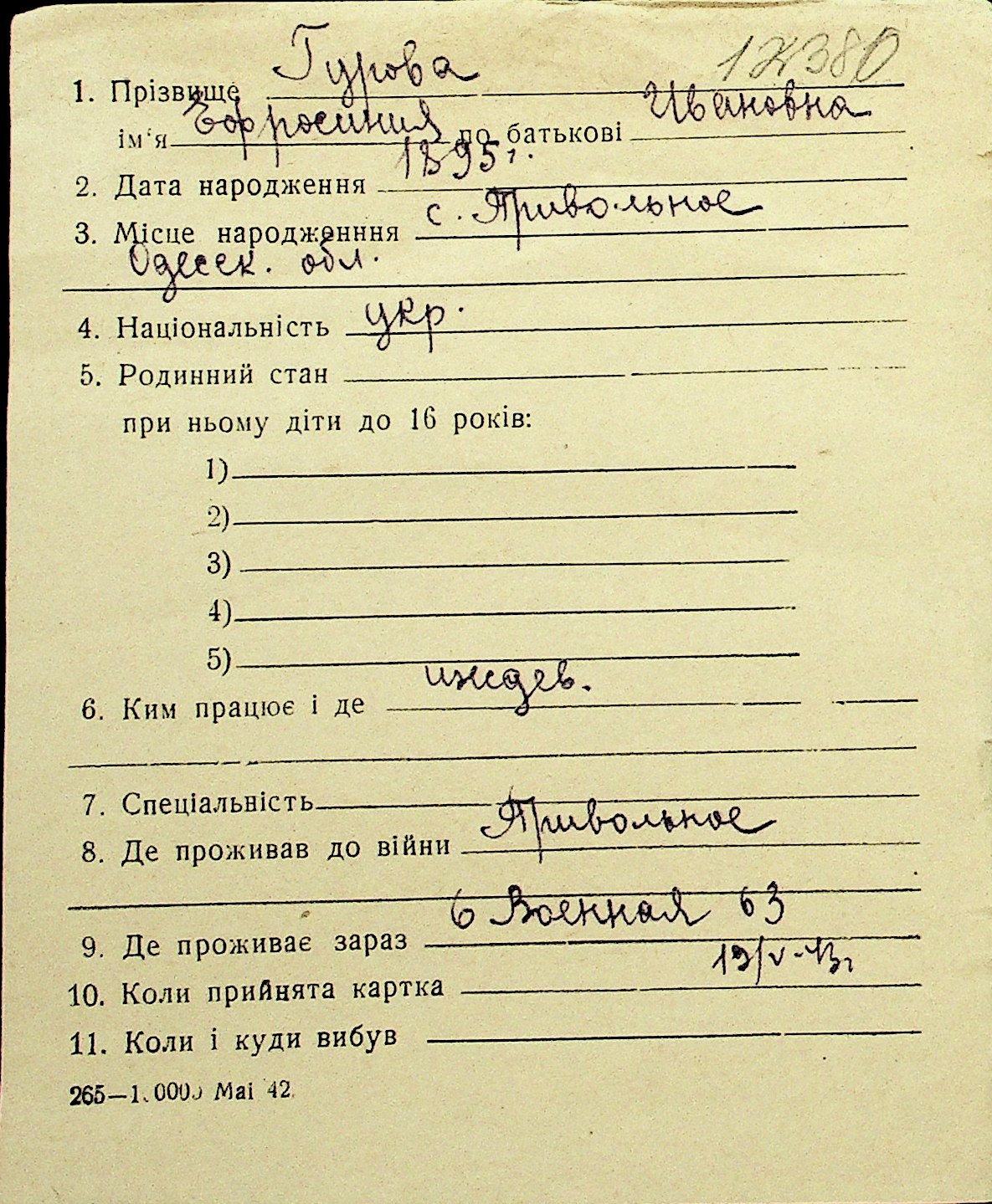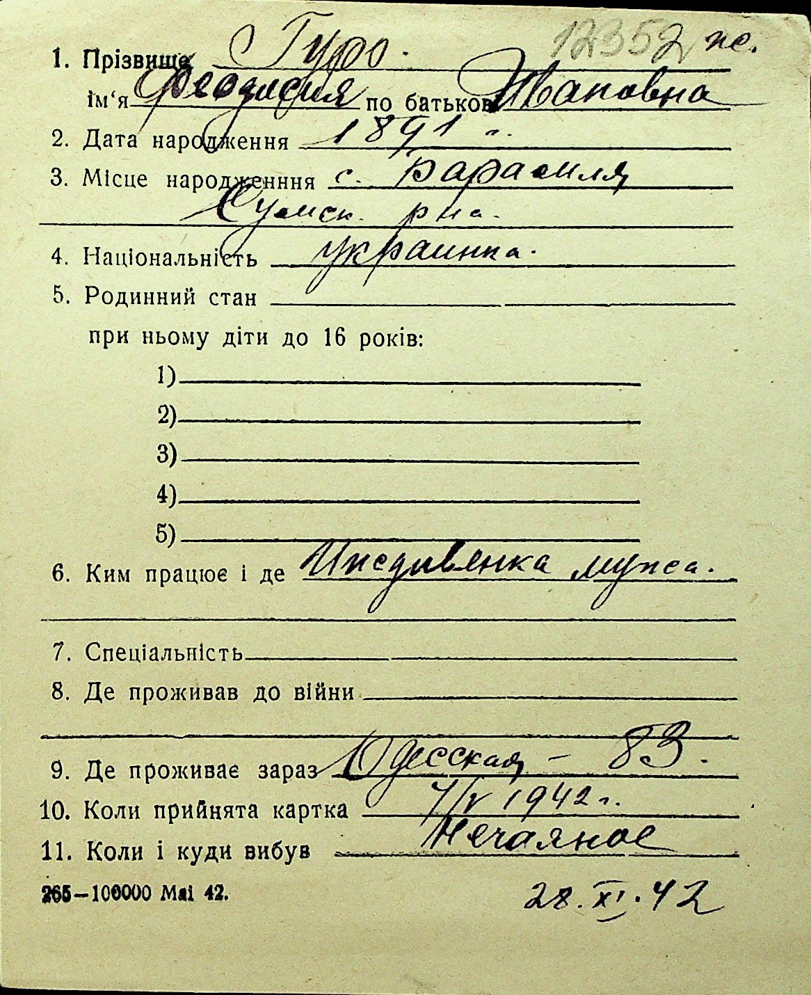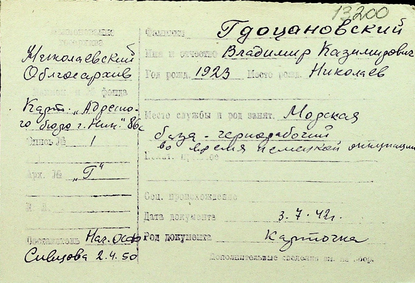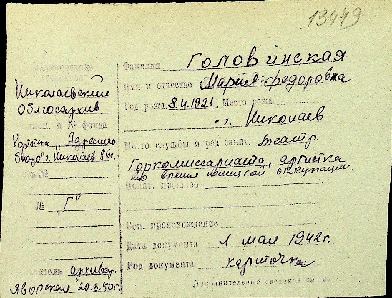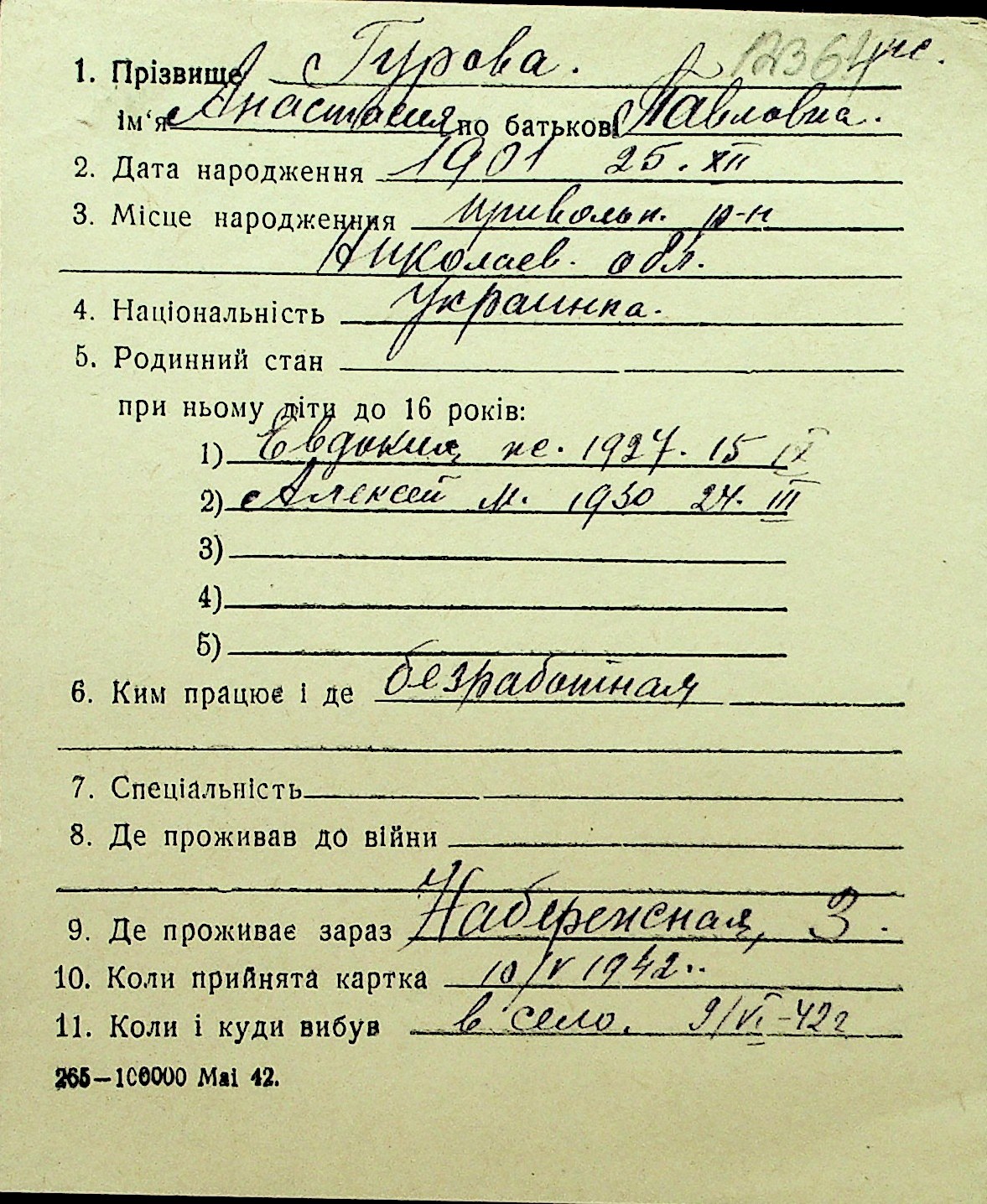 • • Перелік карток до фонду № Н-1016