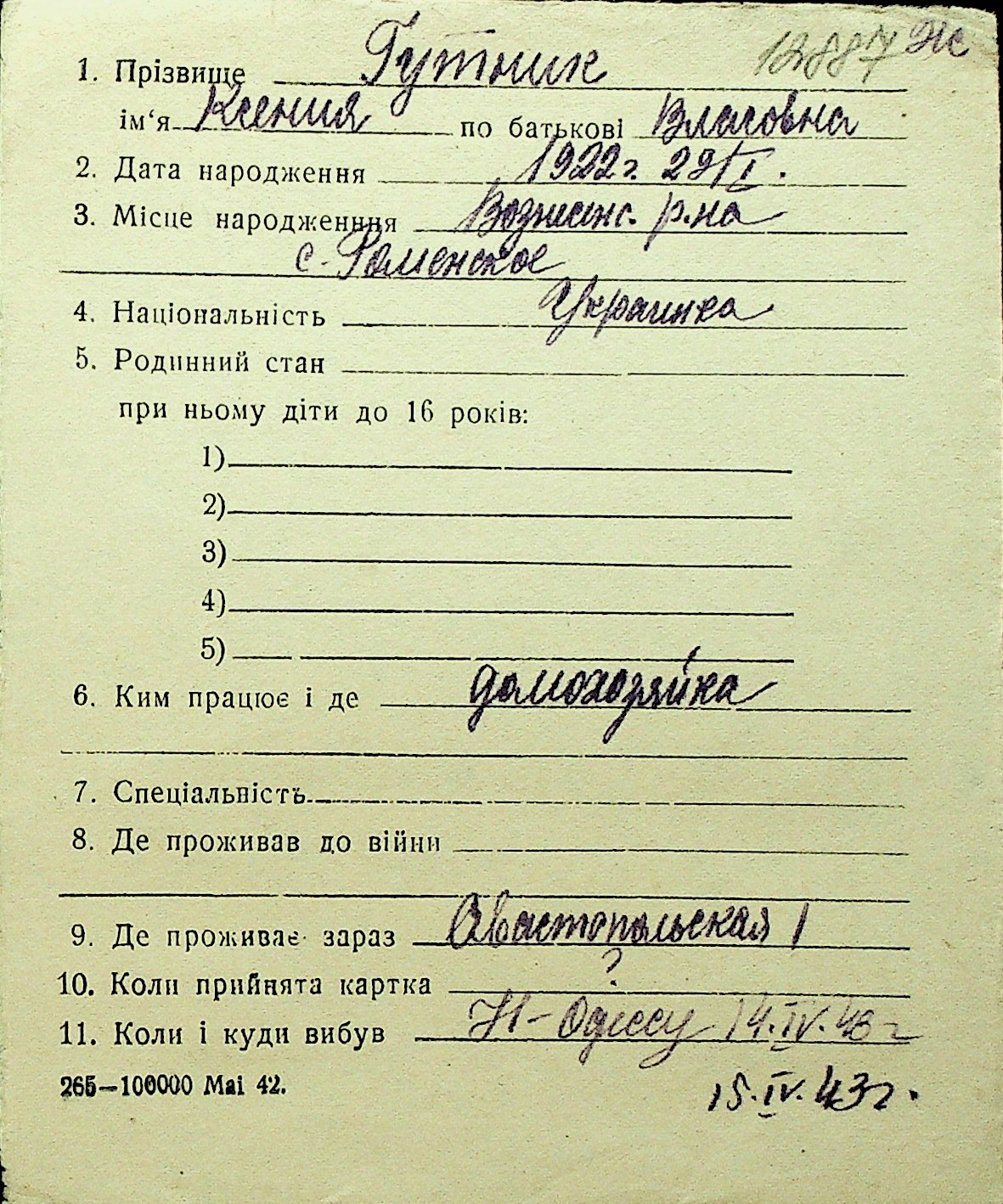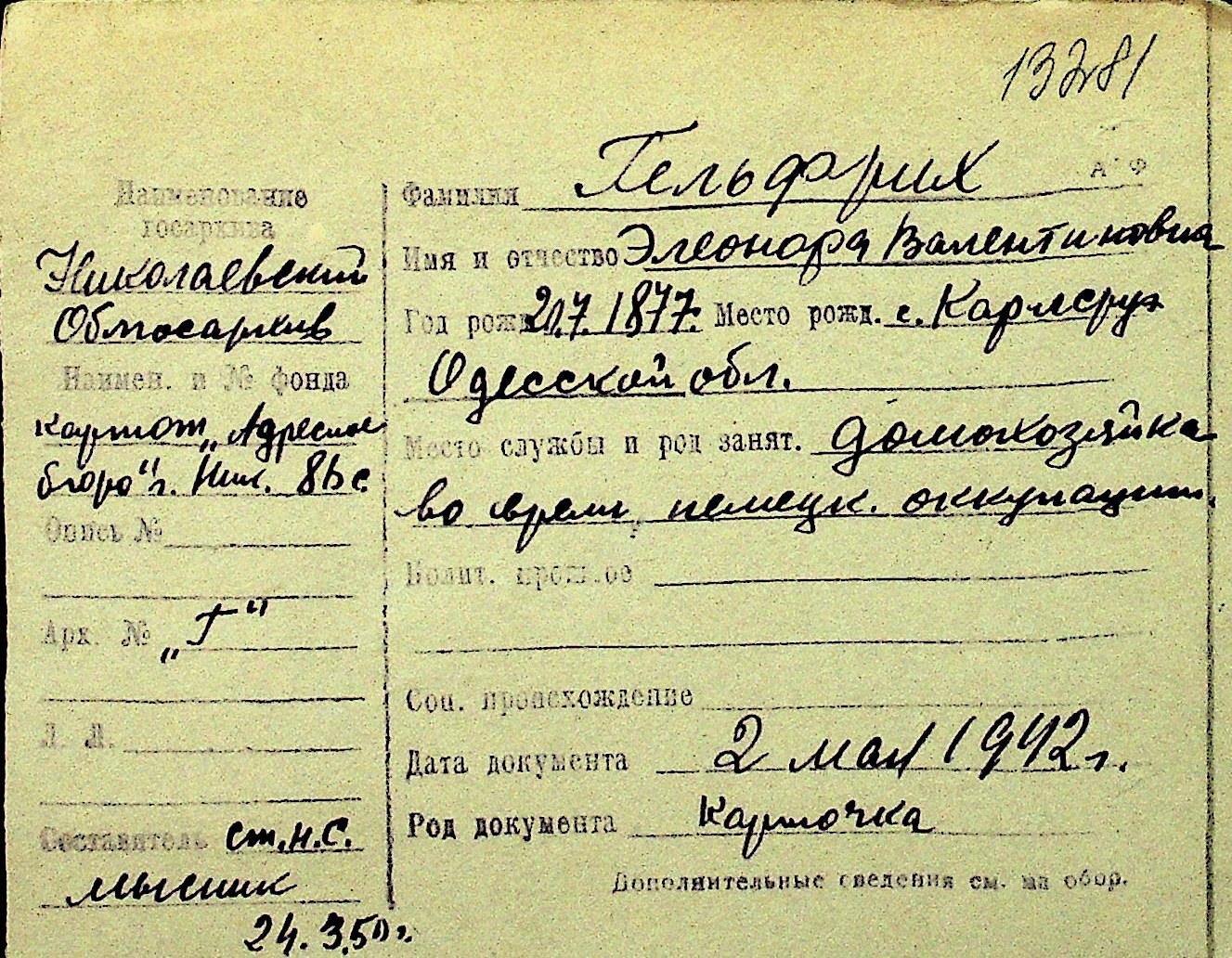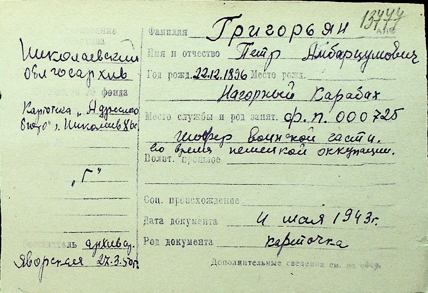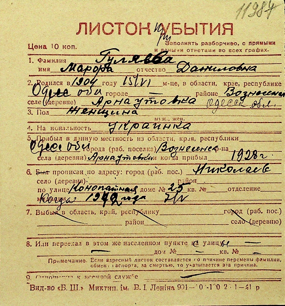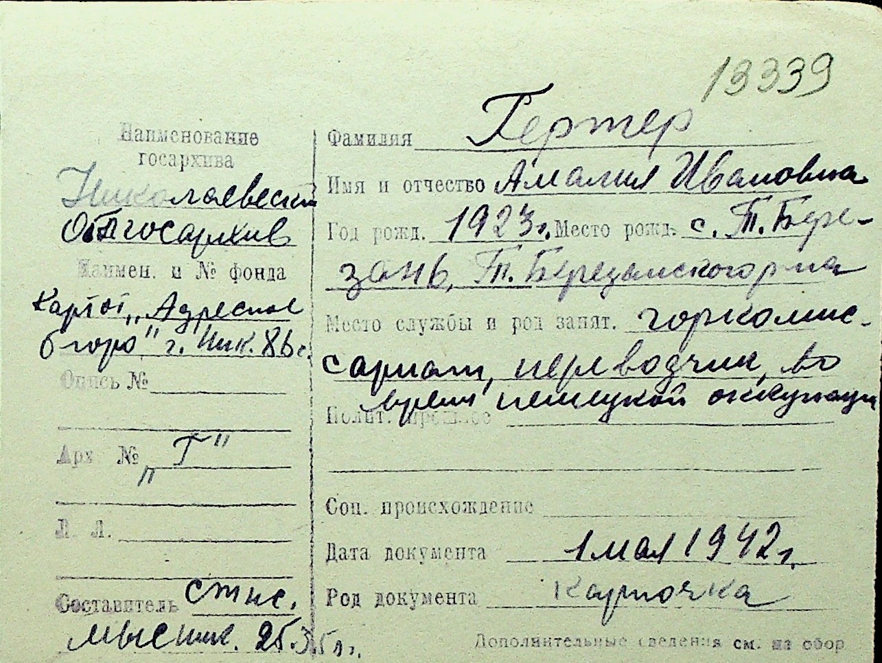 • • Перелік карток до фонду № Н-1016