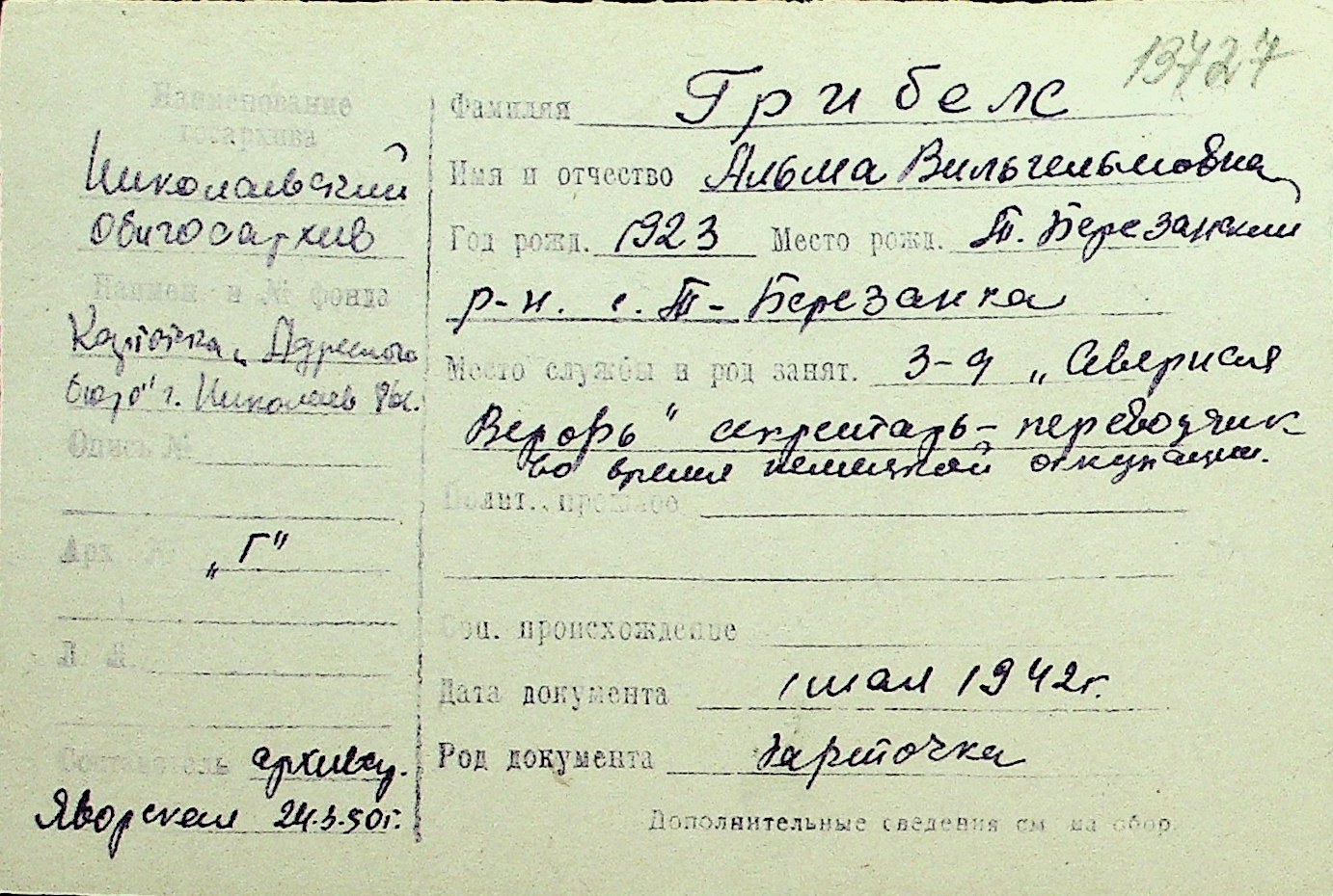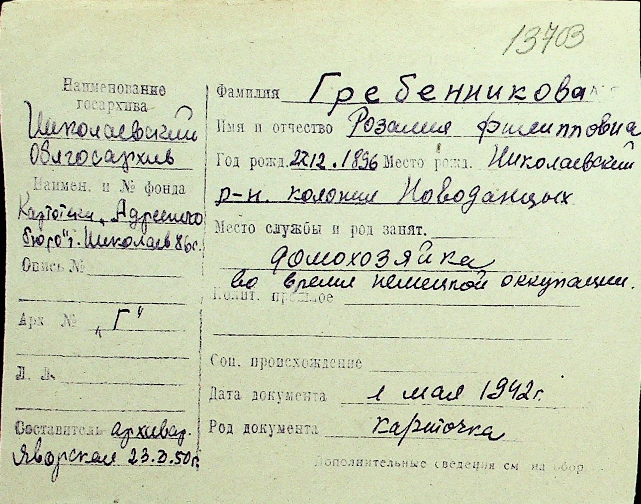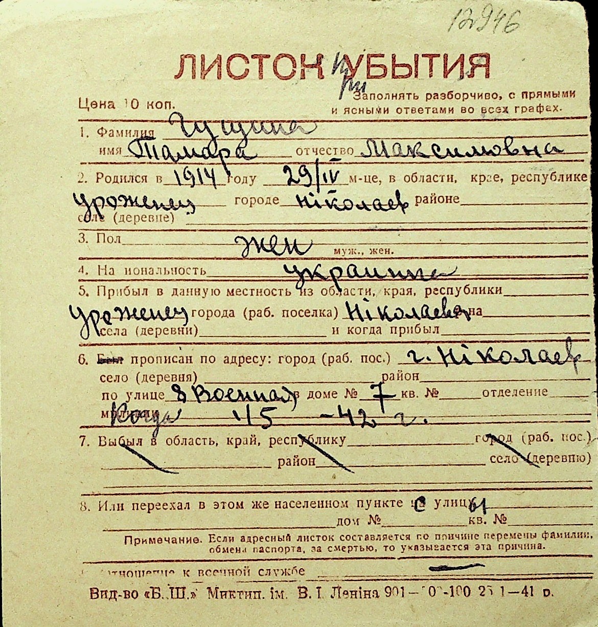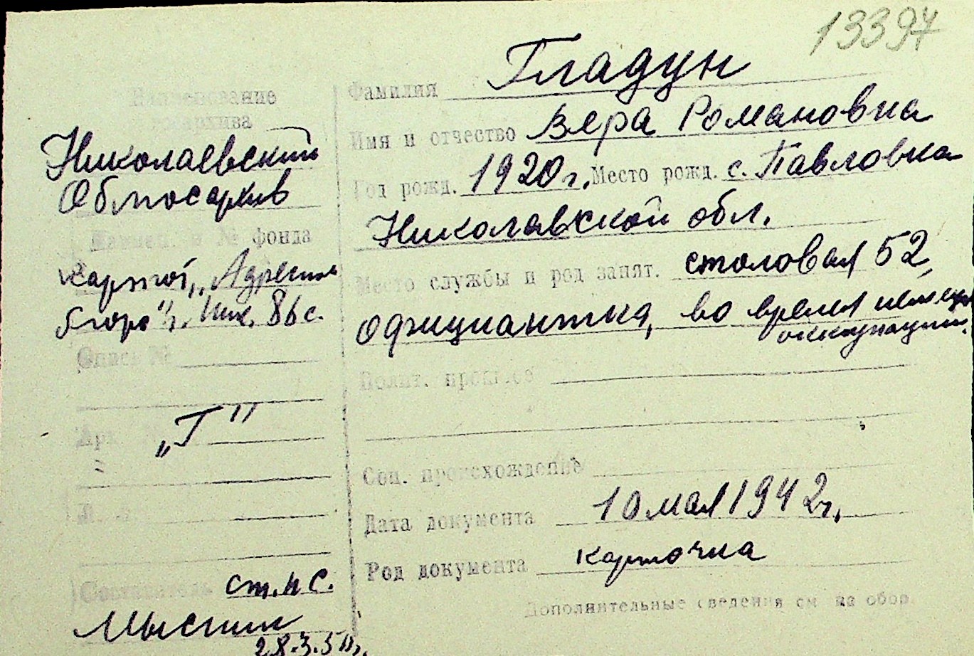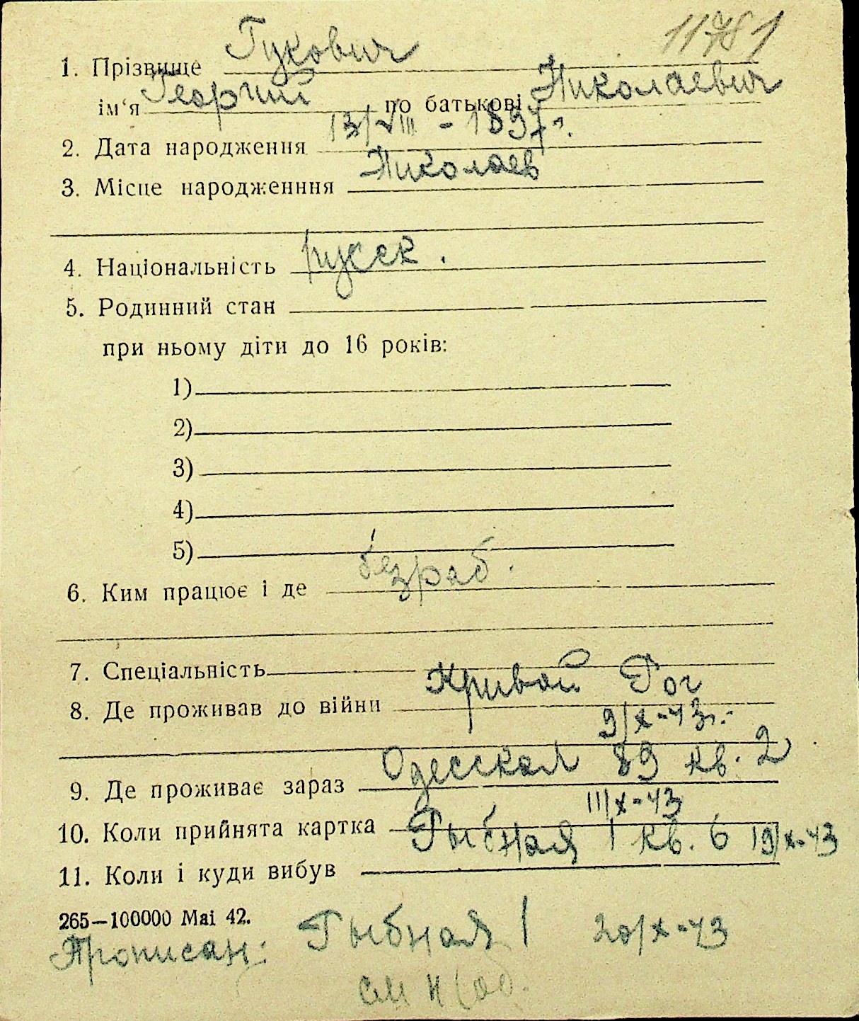 • • Перелік карток до фонду № Н-1016