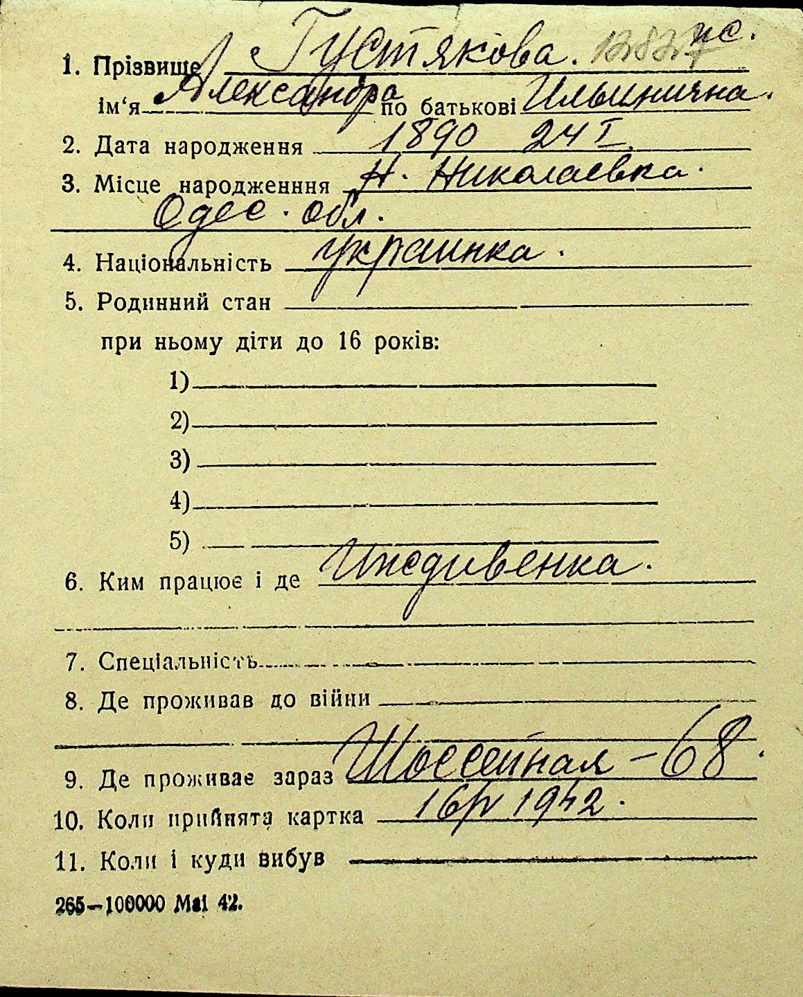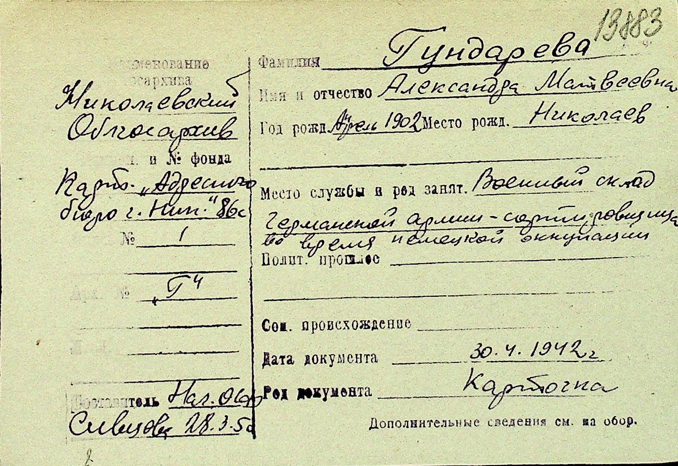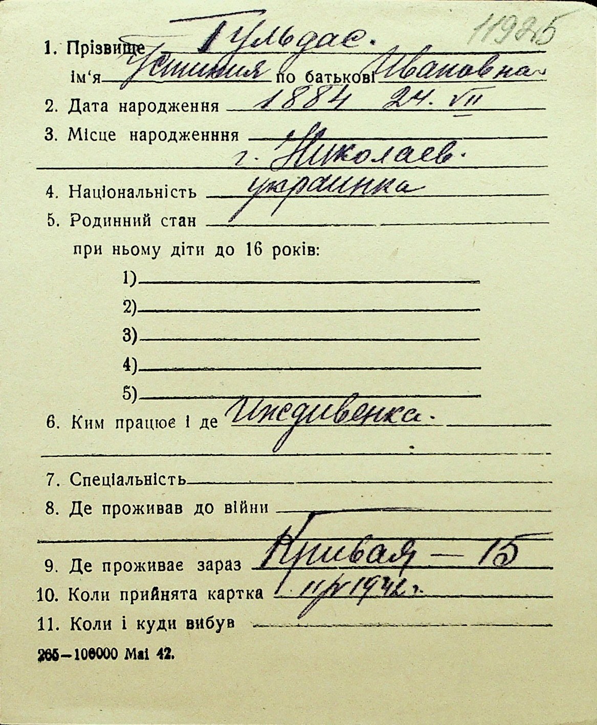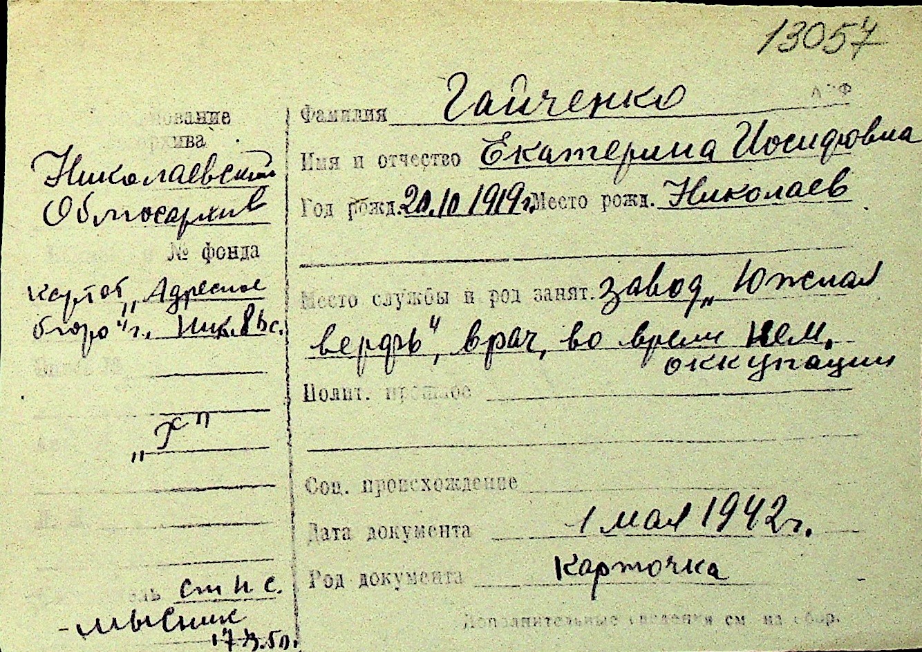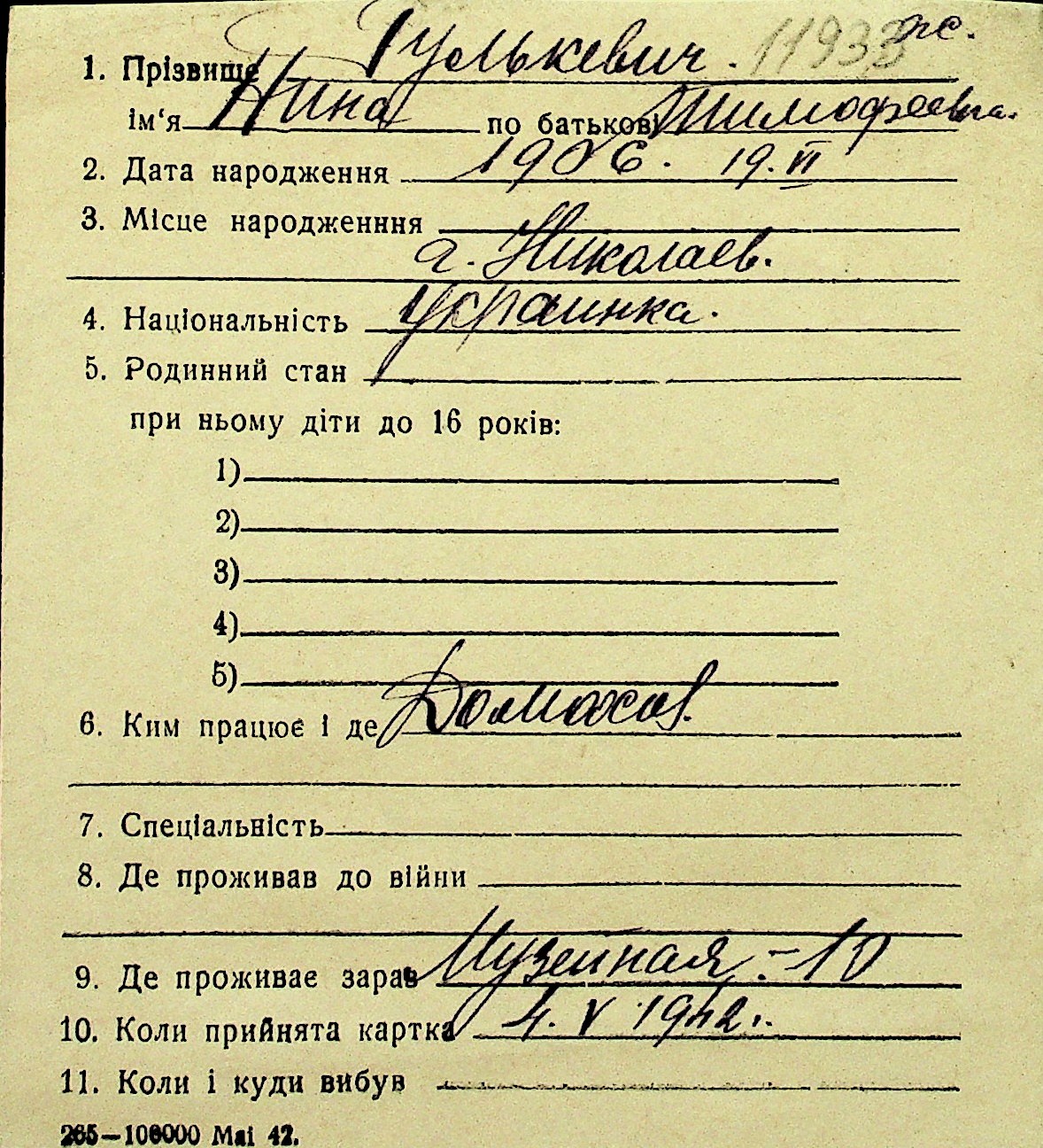 • • Перелік карток до фонду № Н-1016