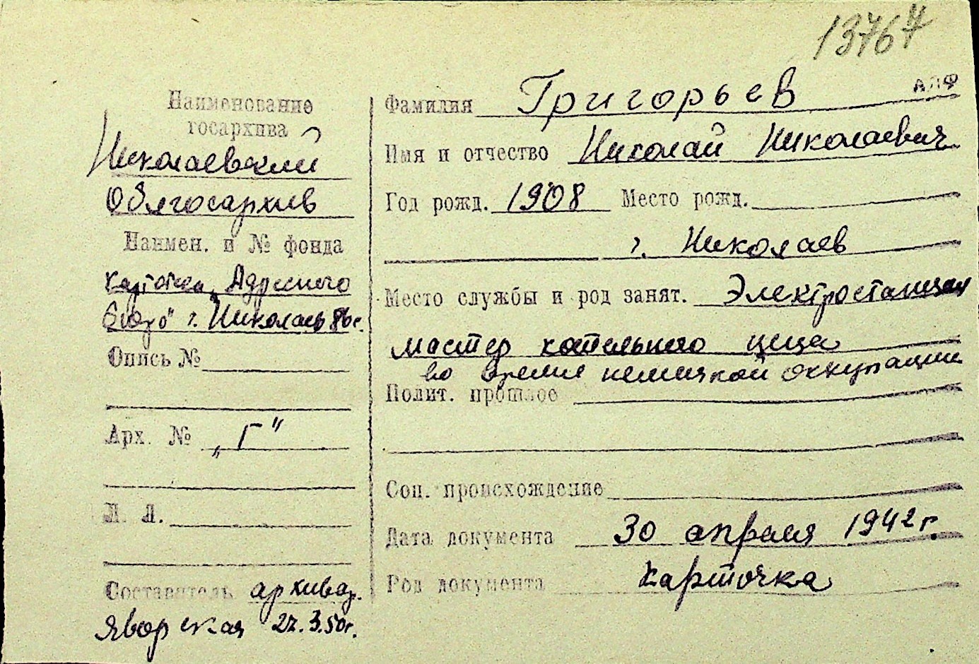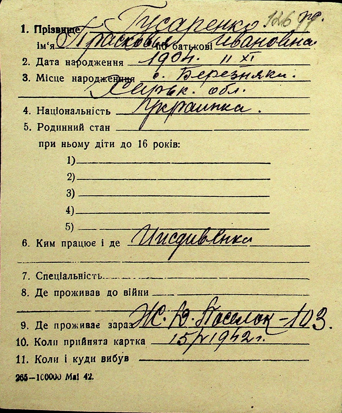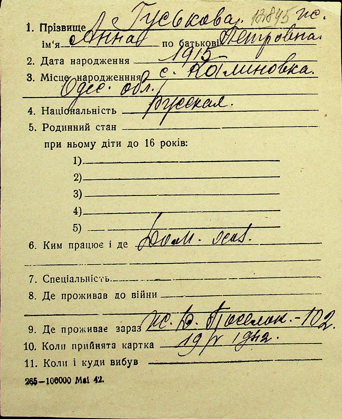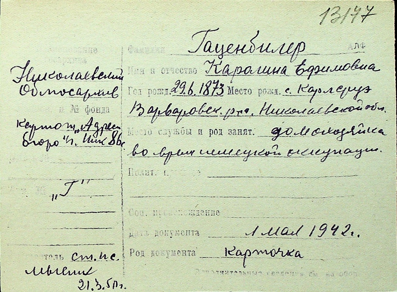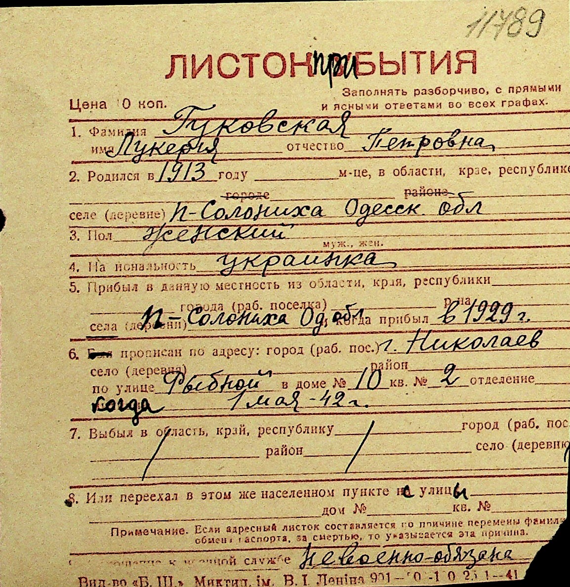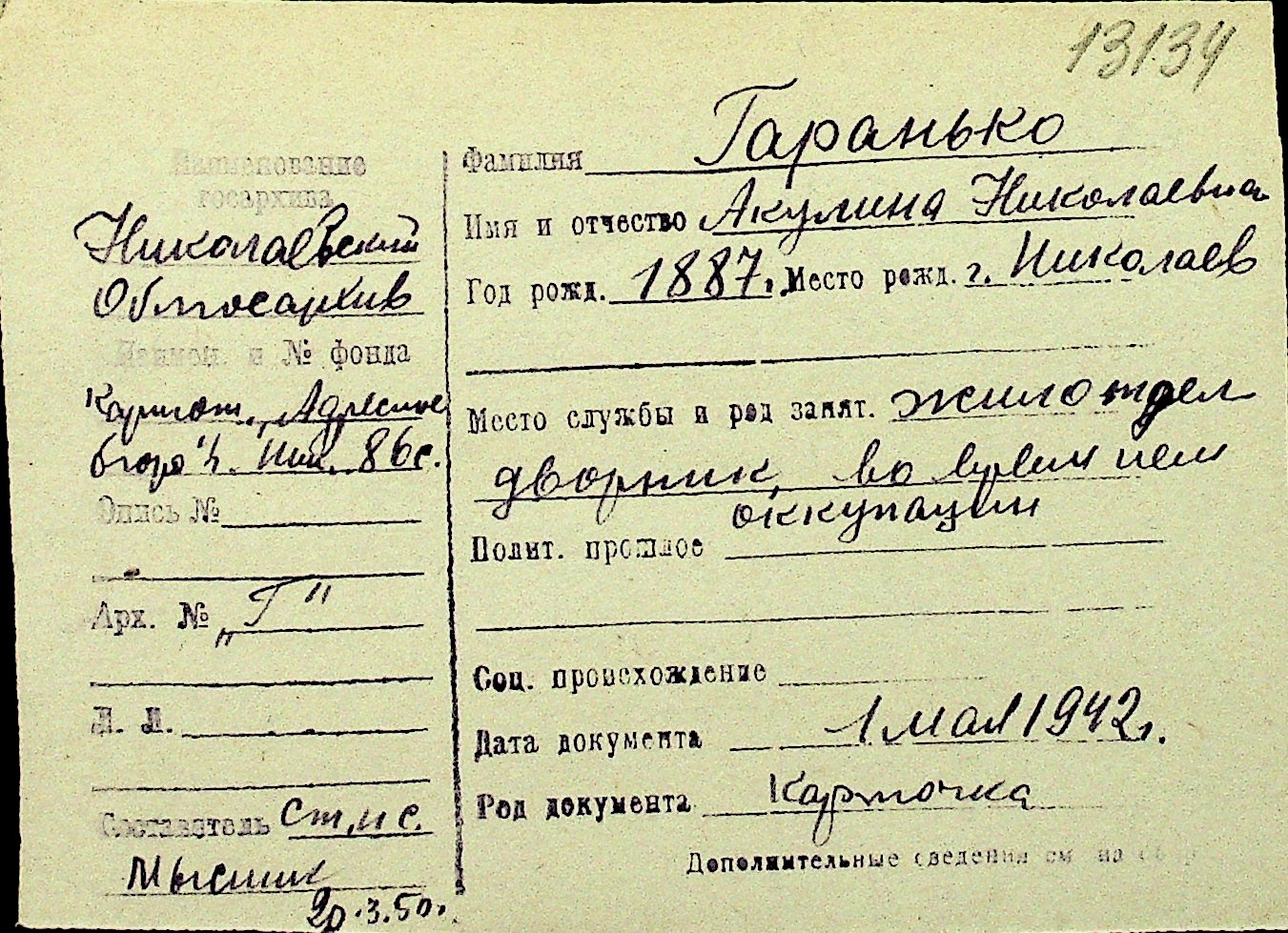 • • Перелік карток до фонду № Н-1016