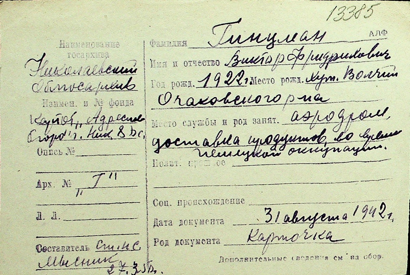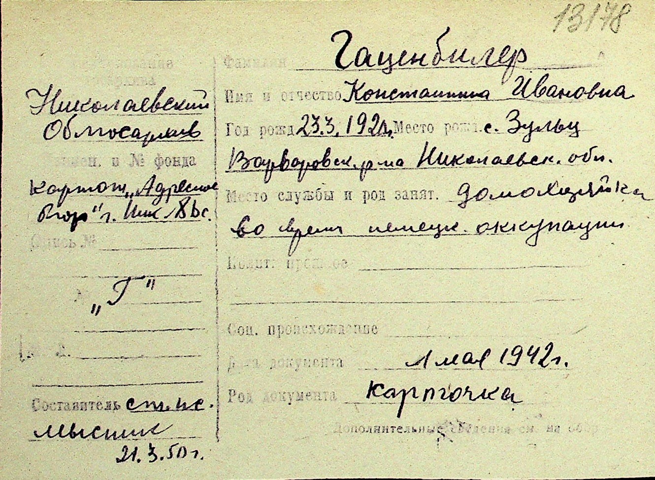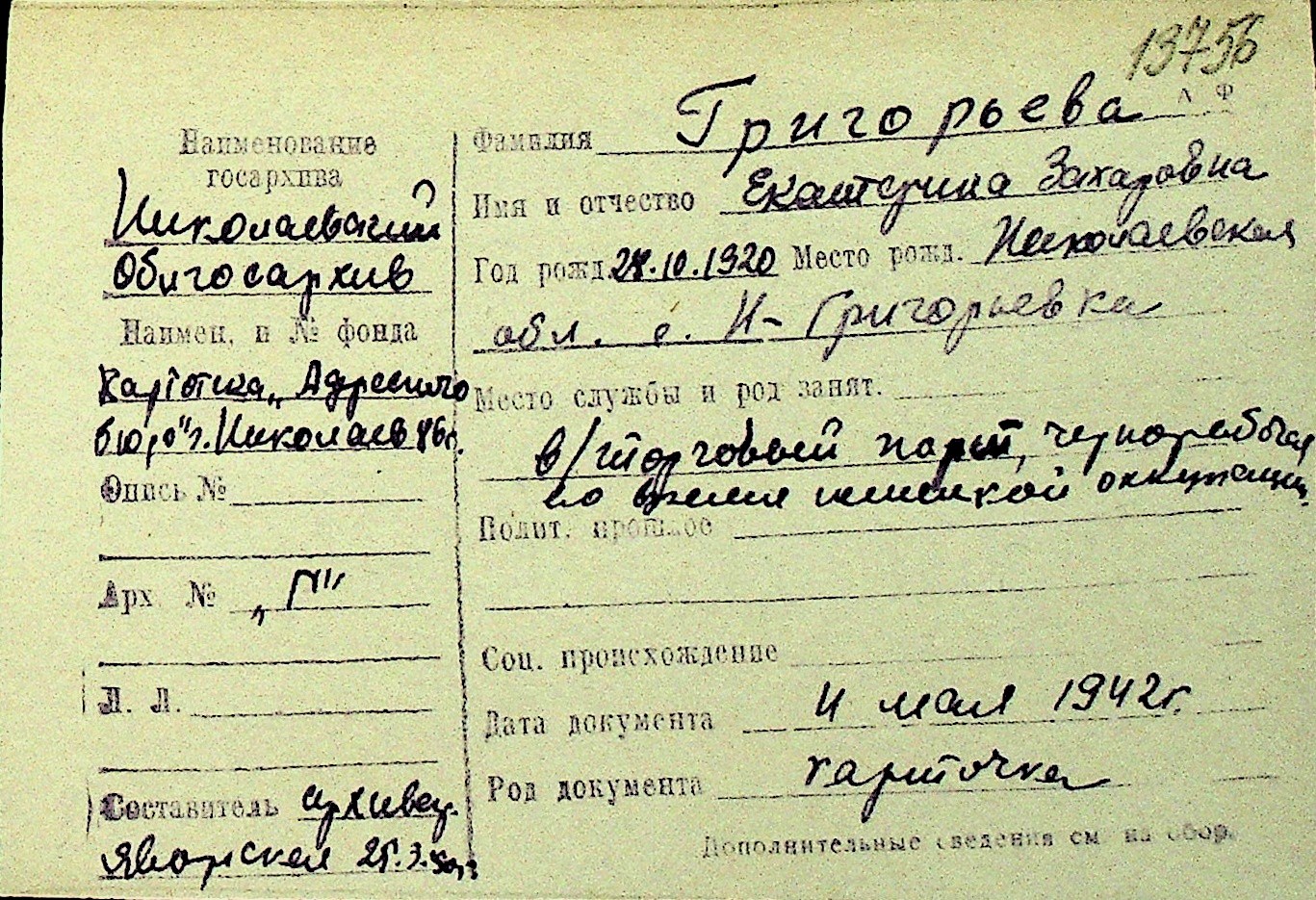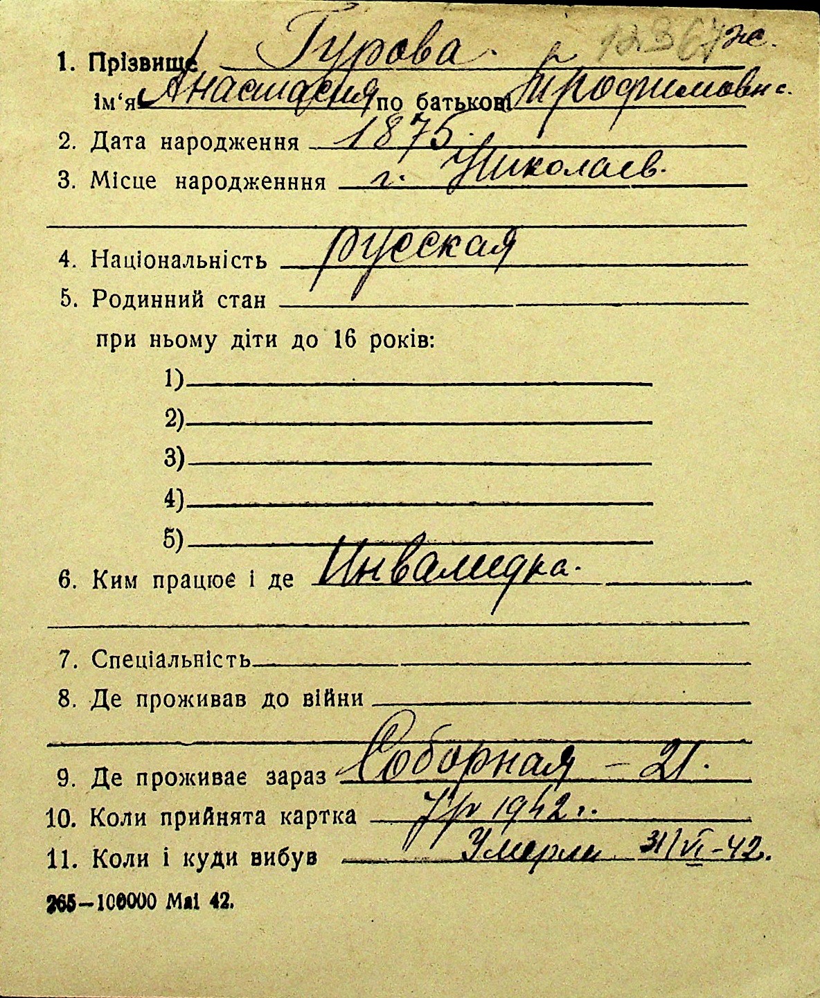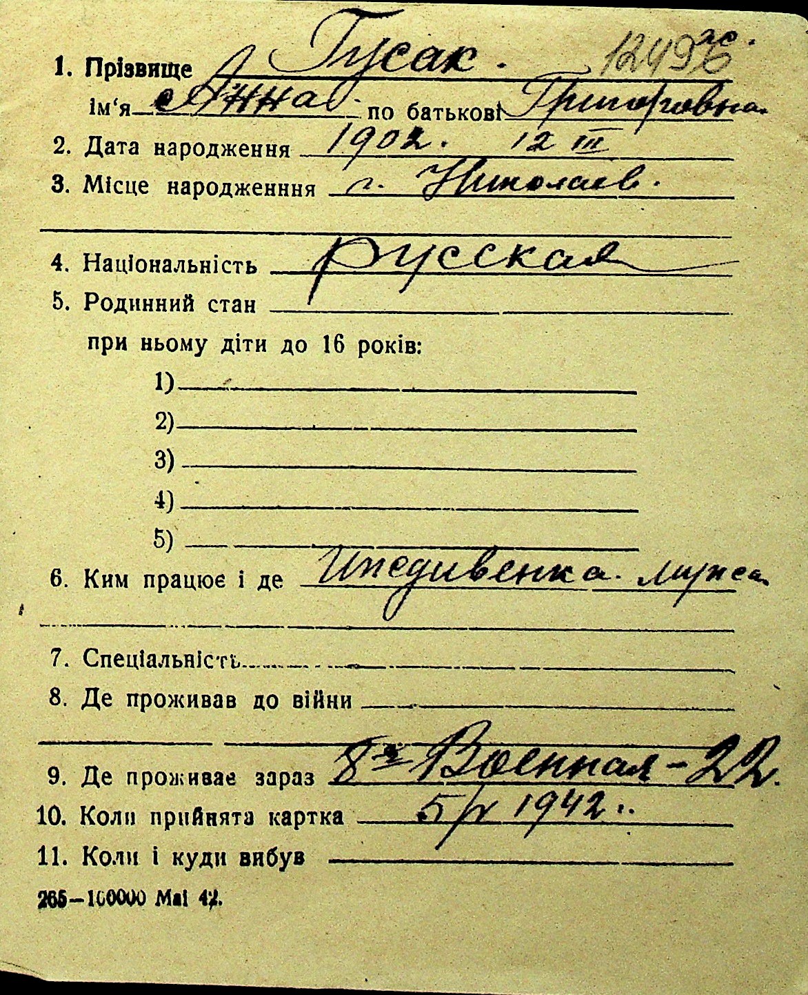 • • Перелік карток до фонду № Н-1016