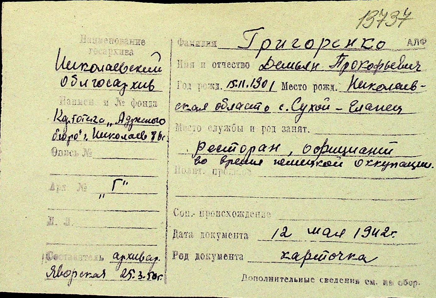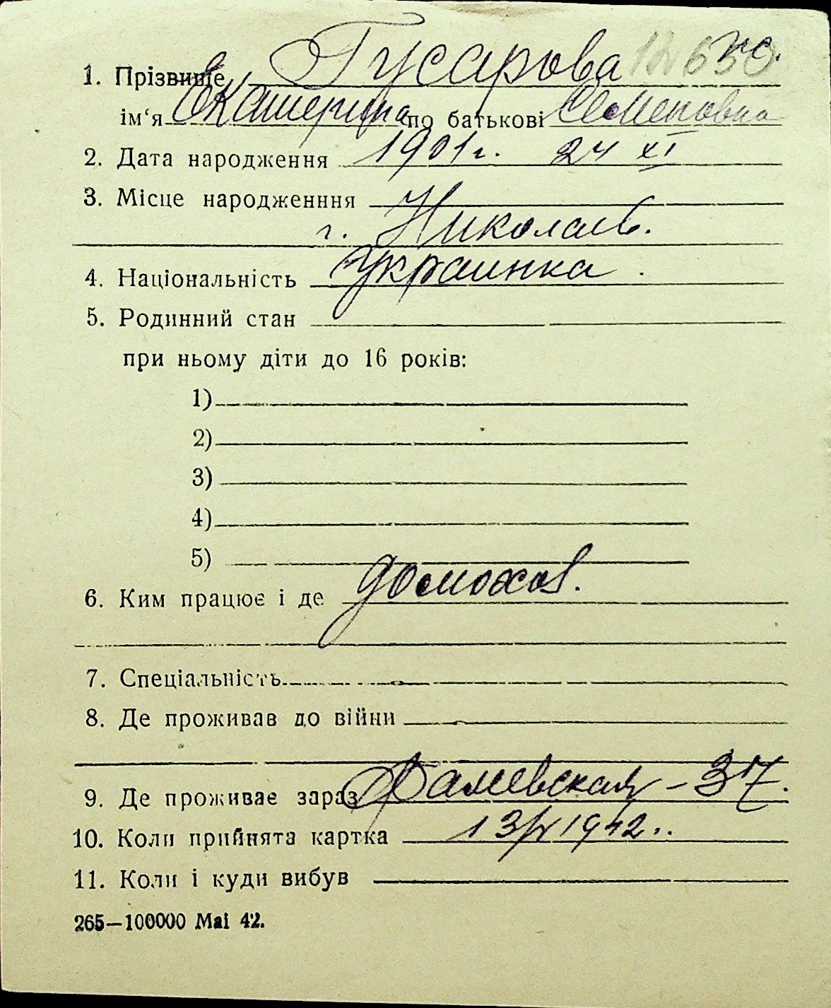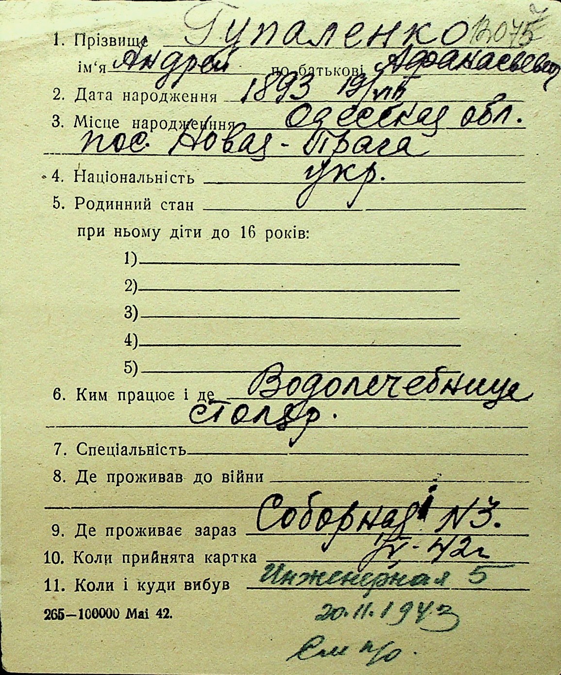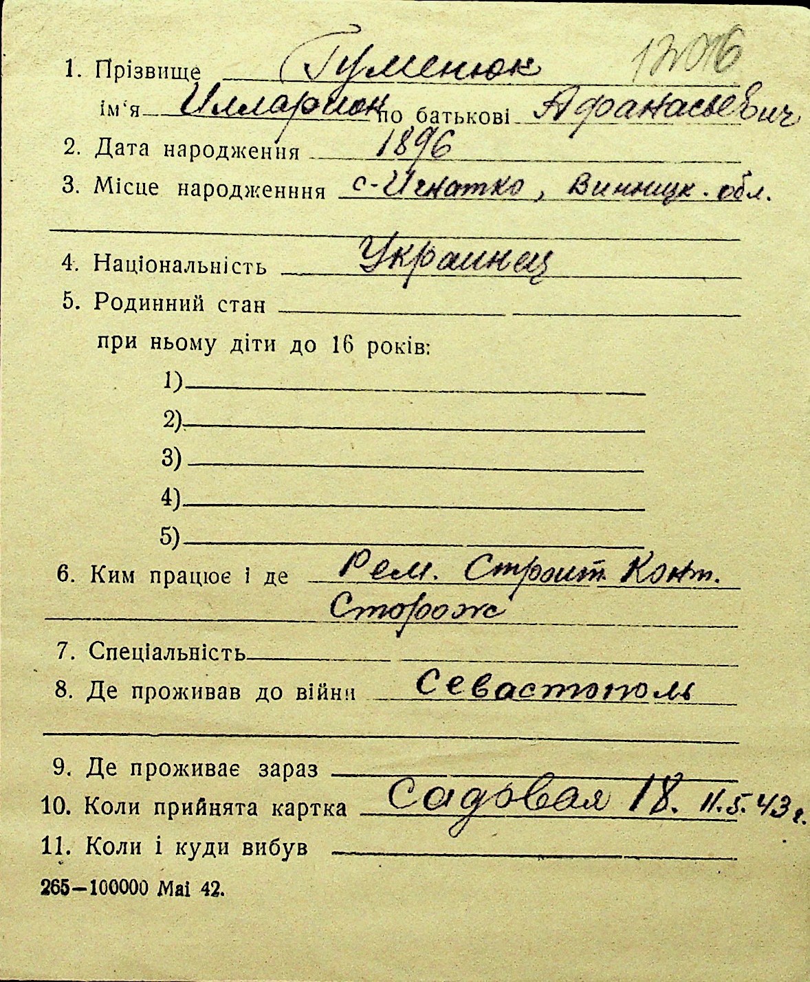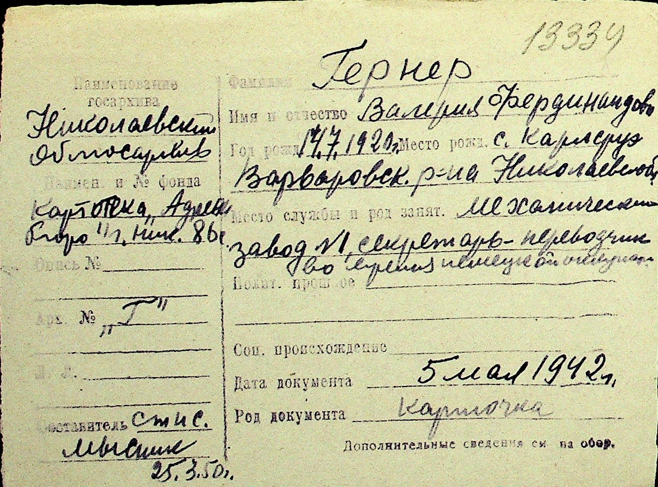 • • Перелік карток до фонду № Н-1016