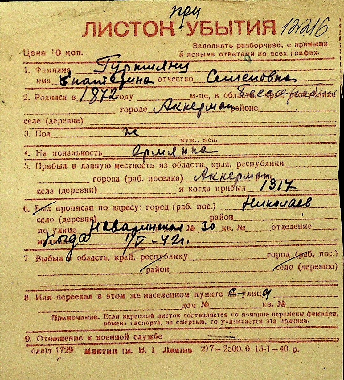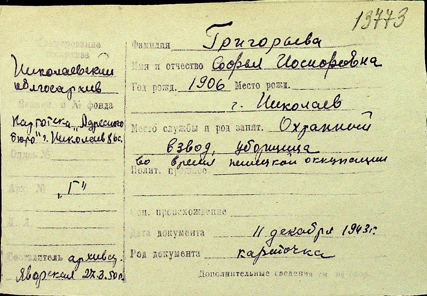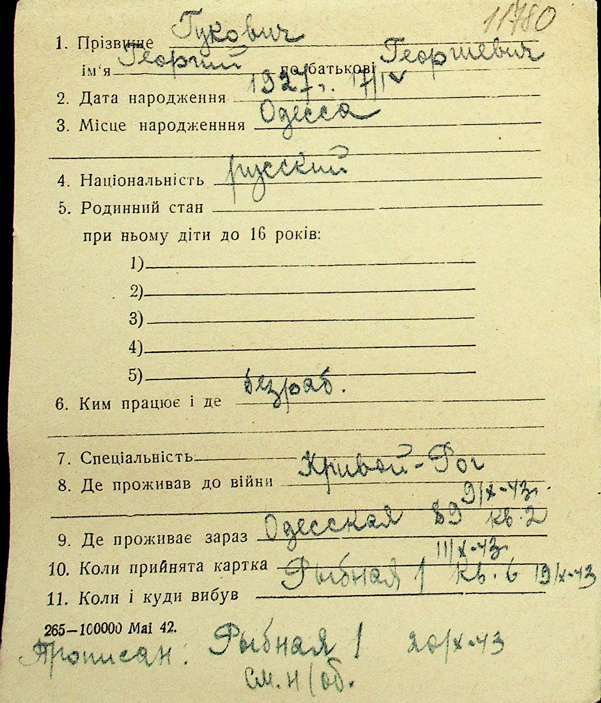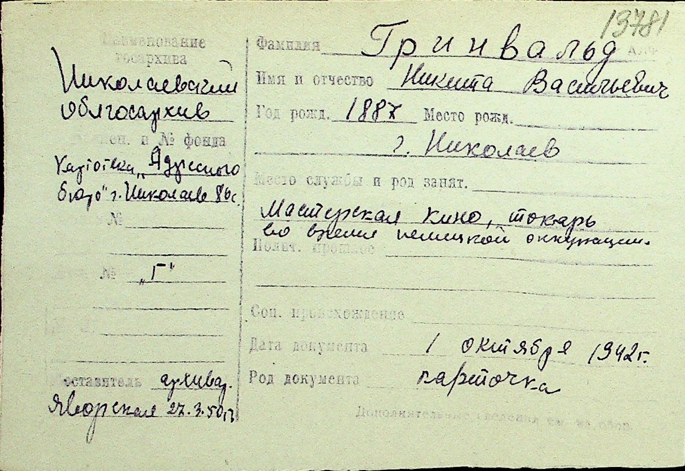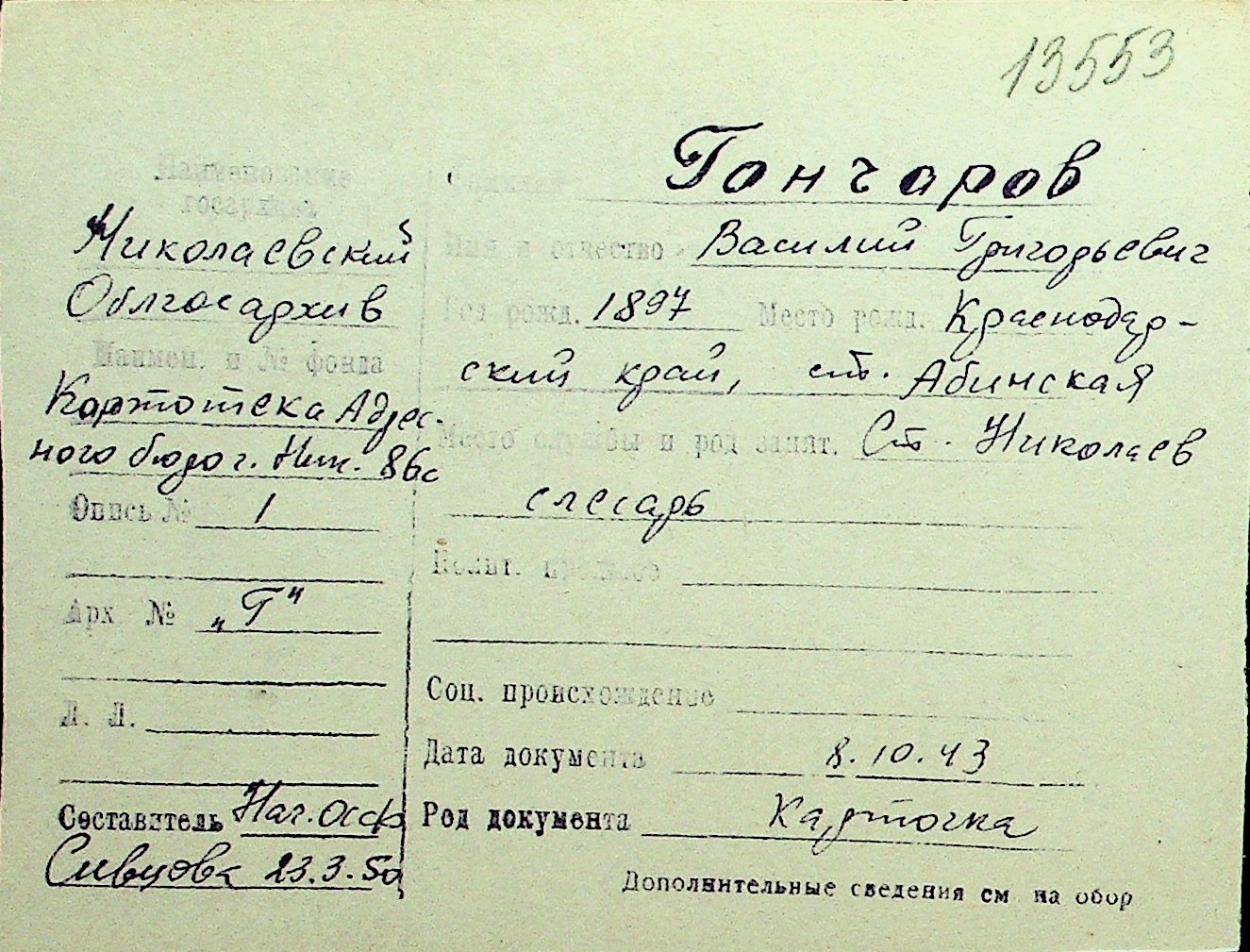 • • Перелік карток до фонду № Н-1016