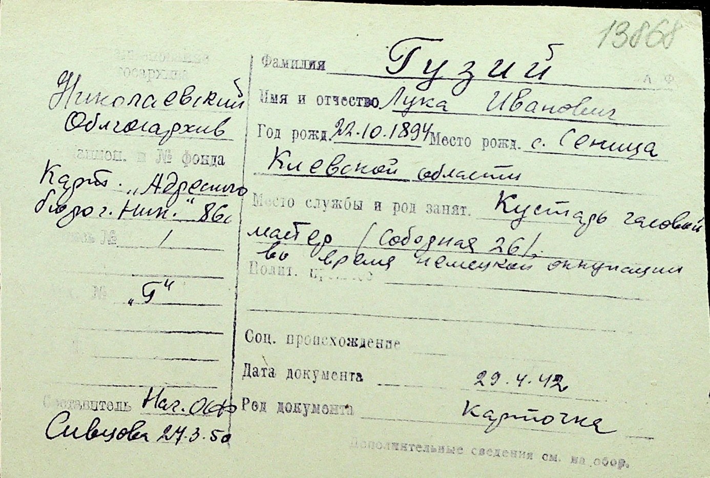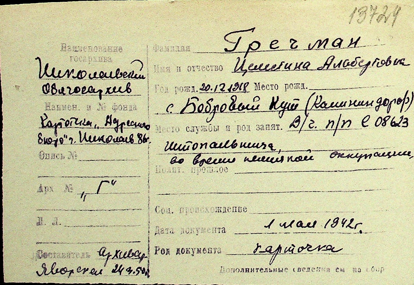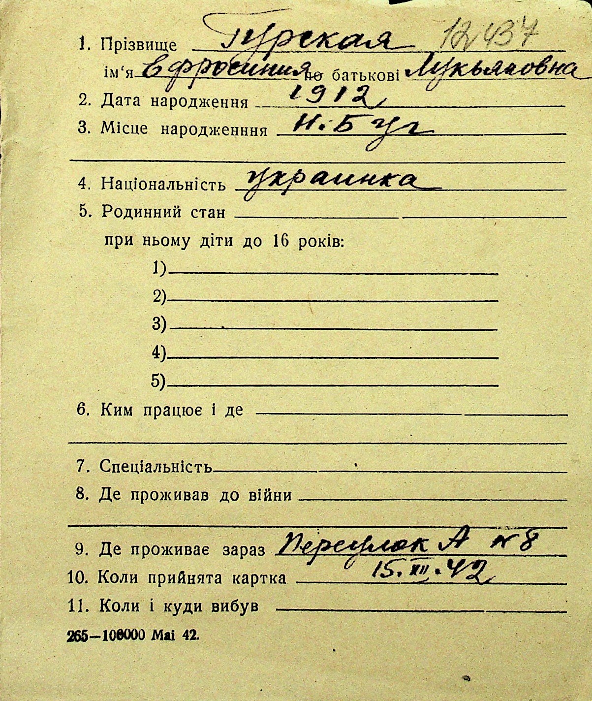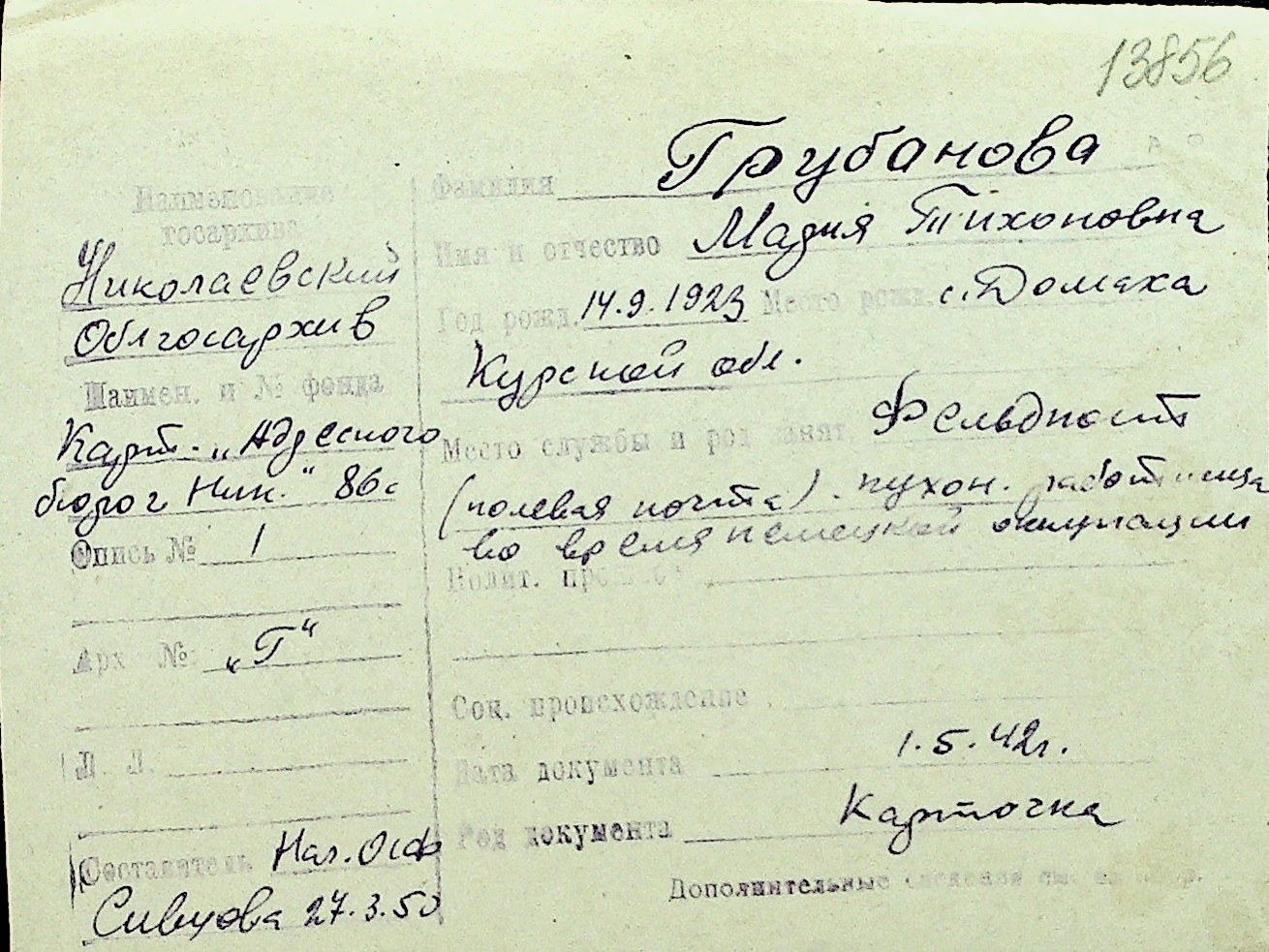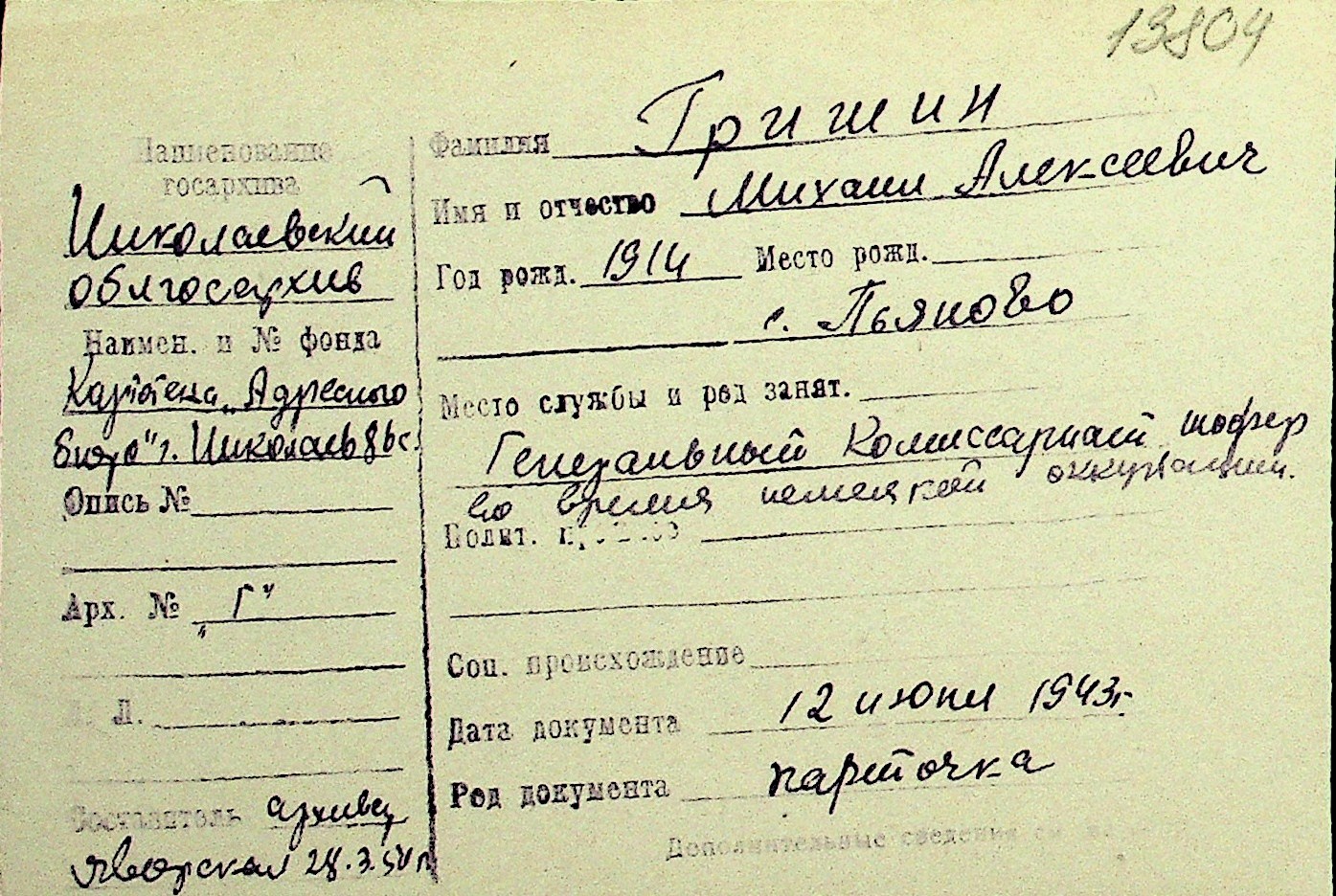 • • Перелік карток до фонду № Н-1016
