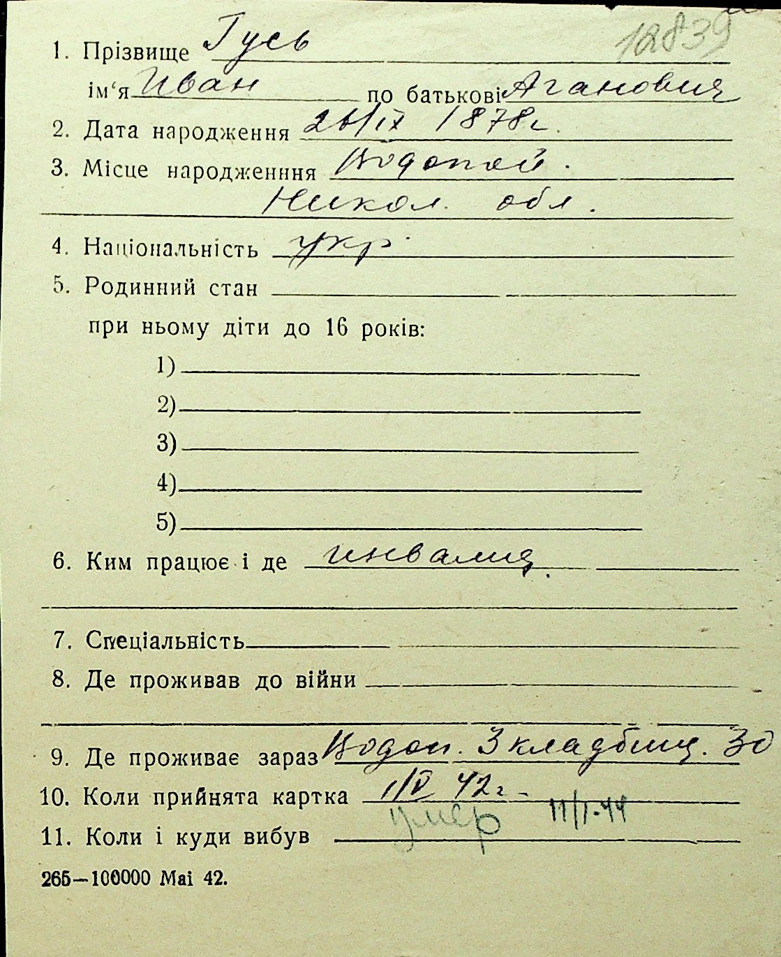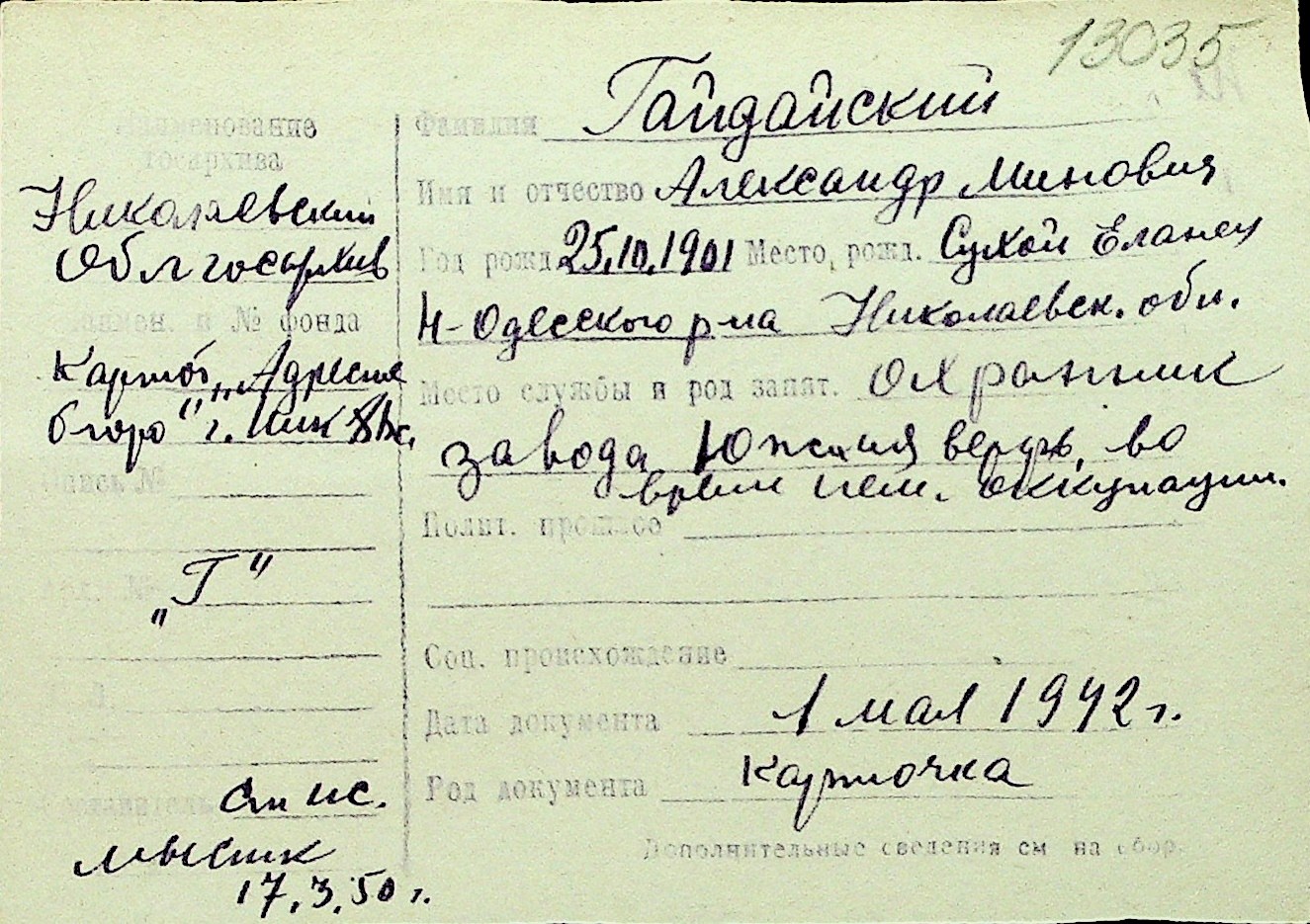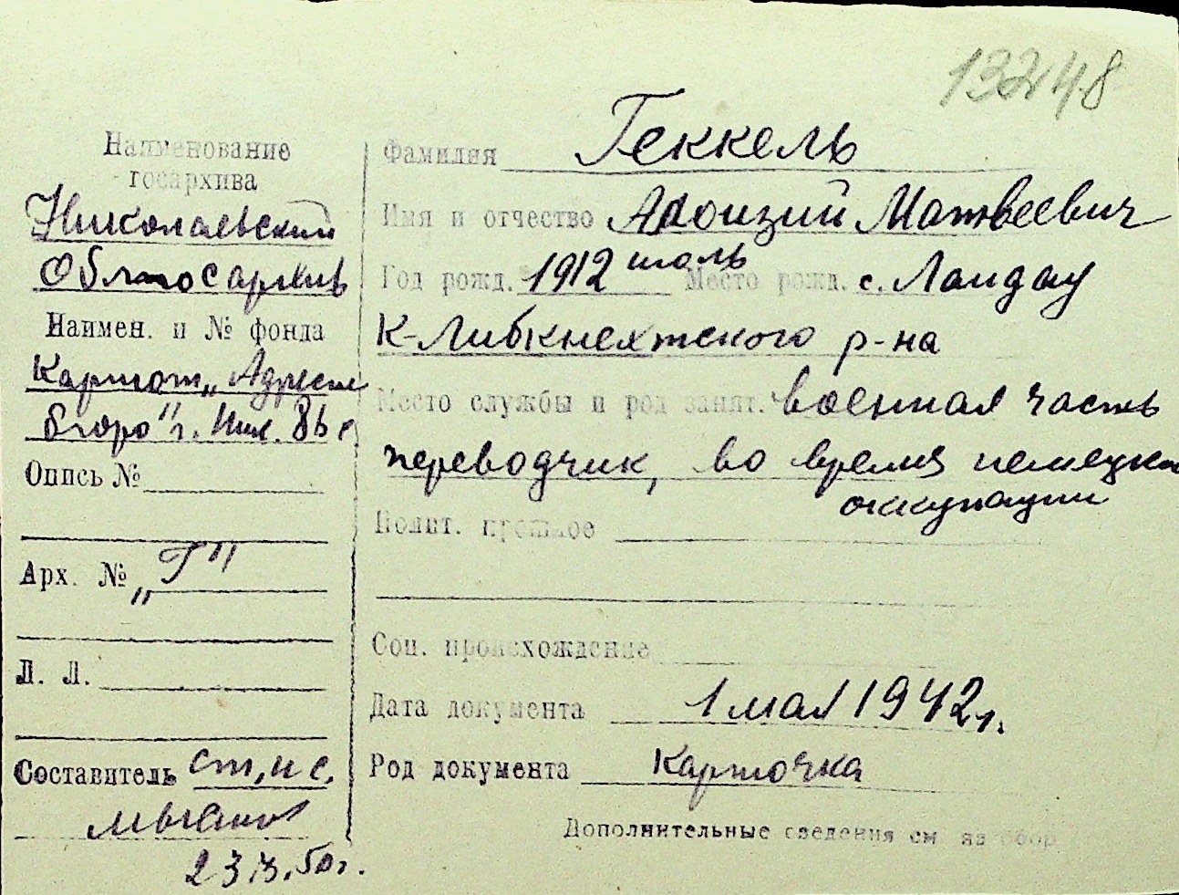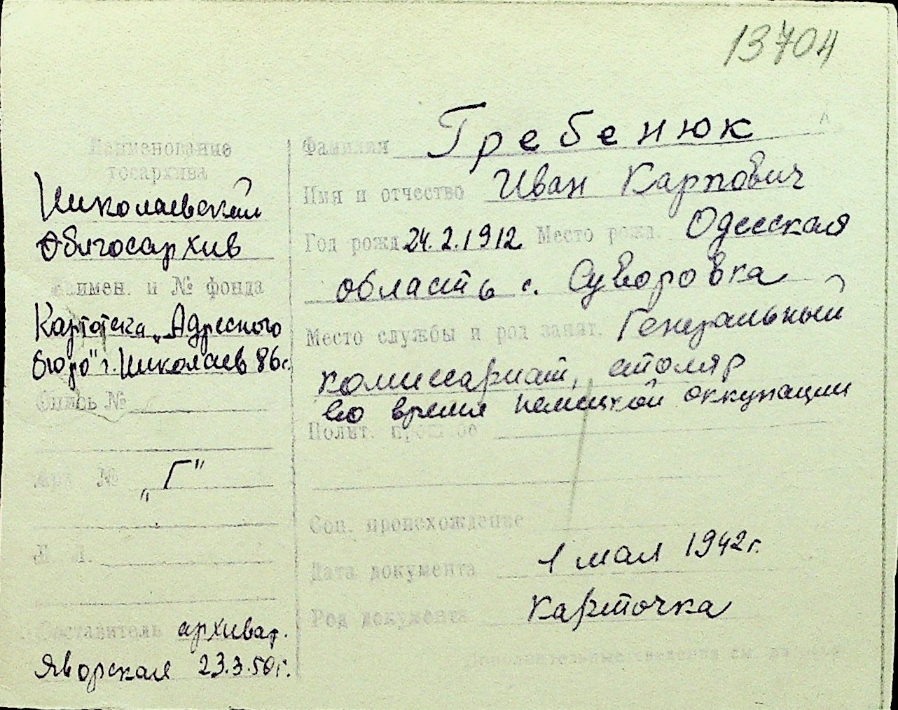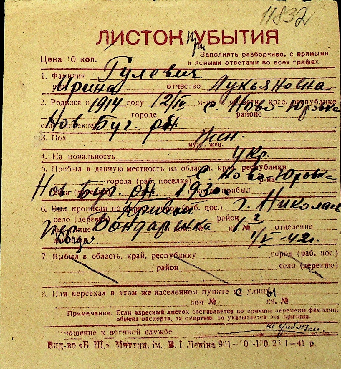 • • Перелік карток до фонду № Н-1016