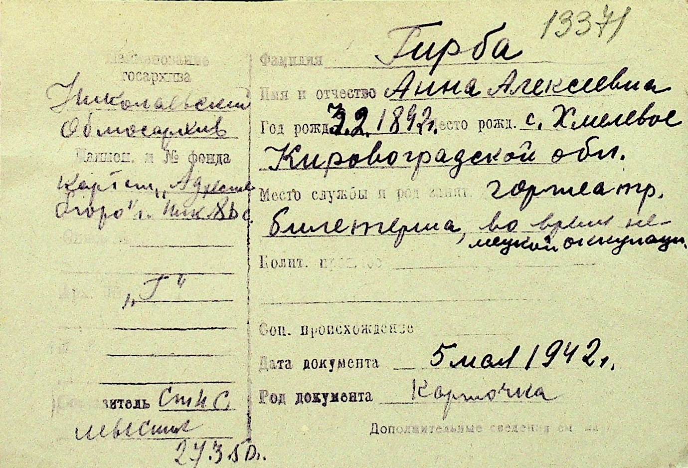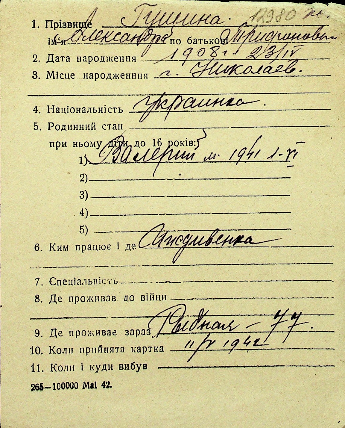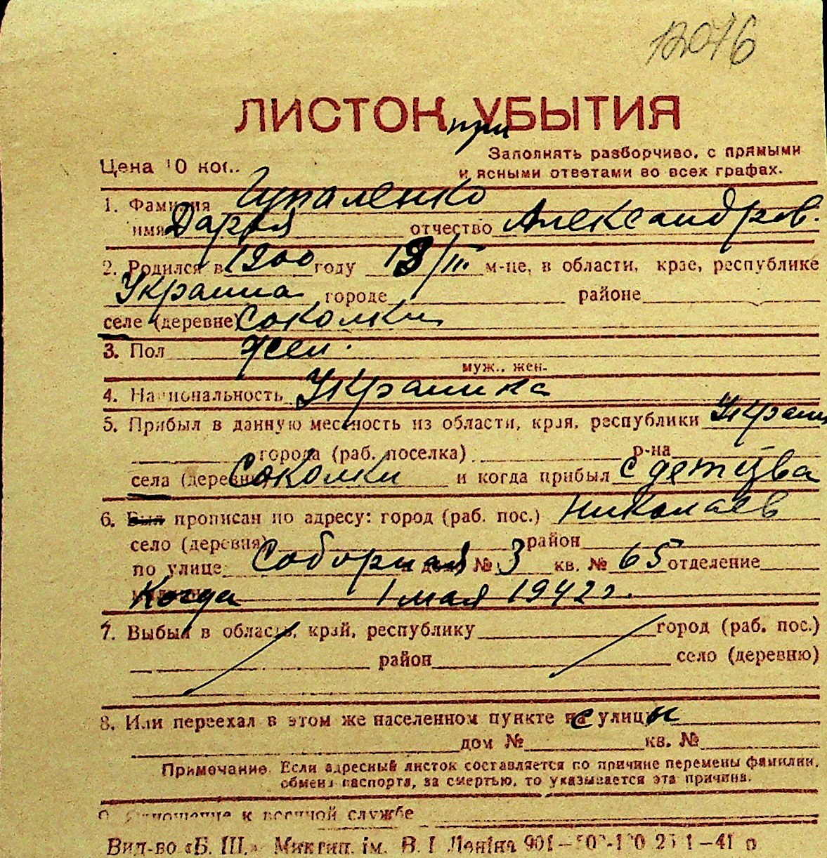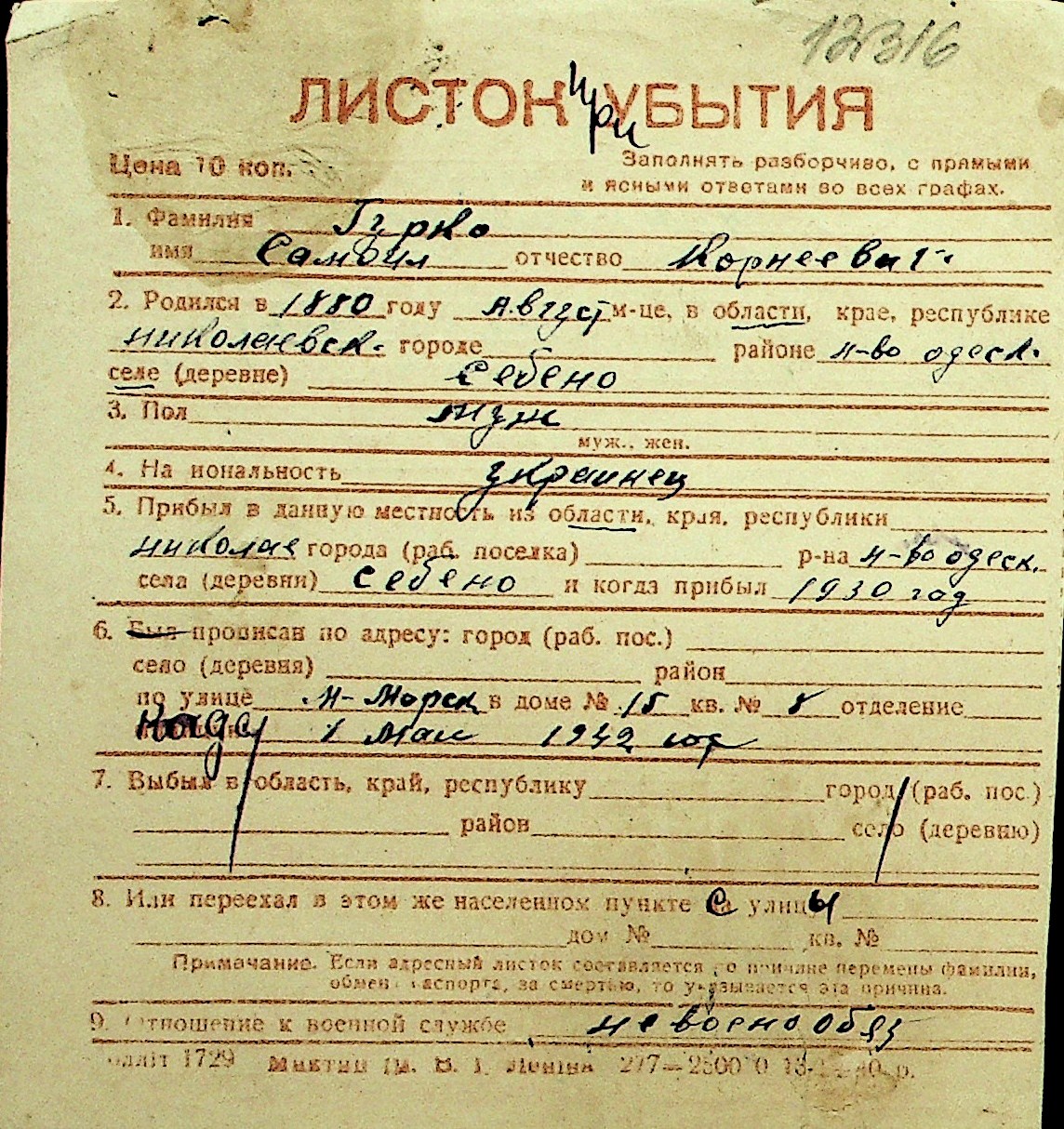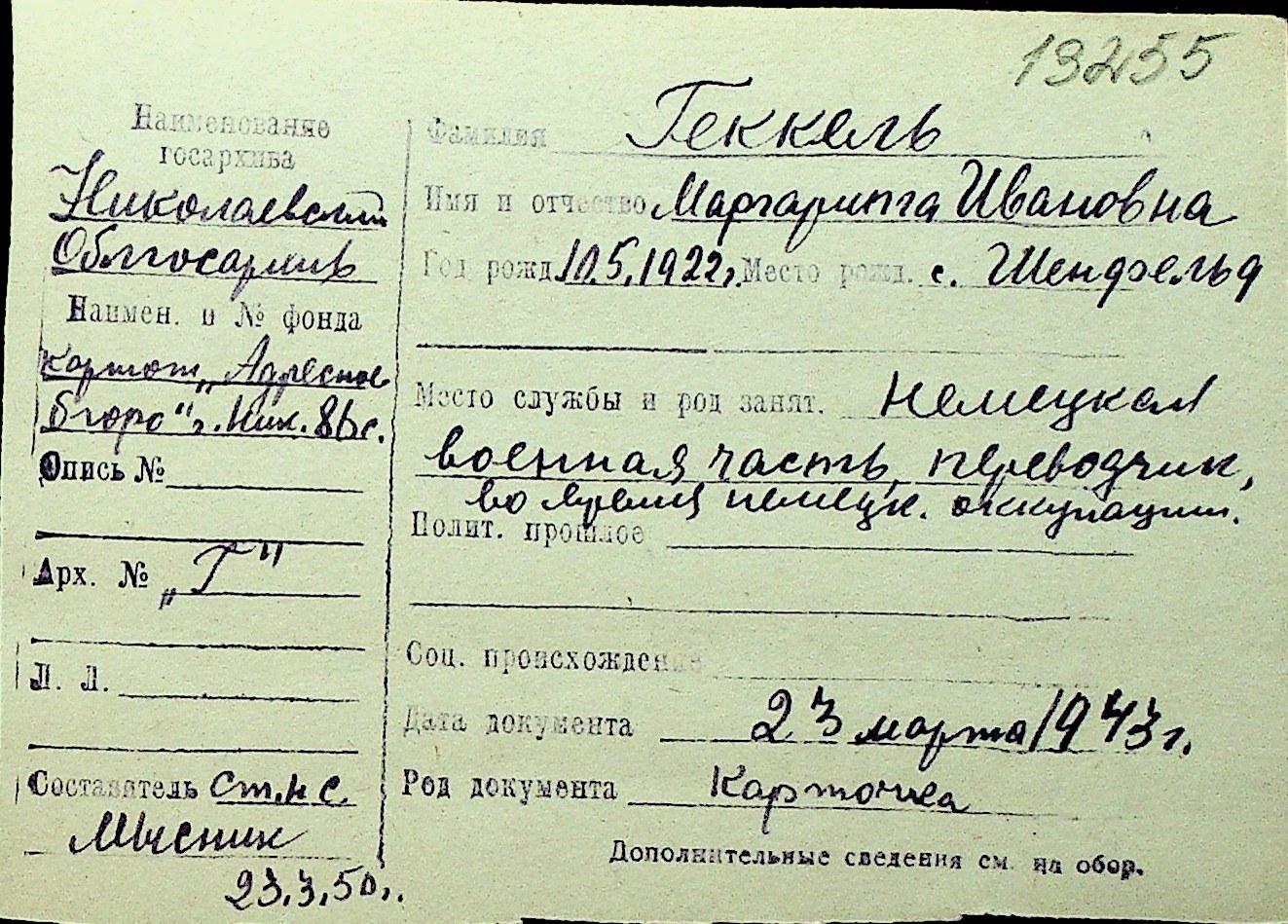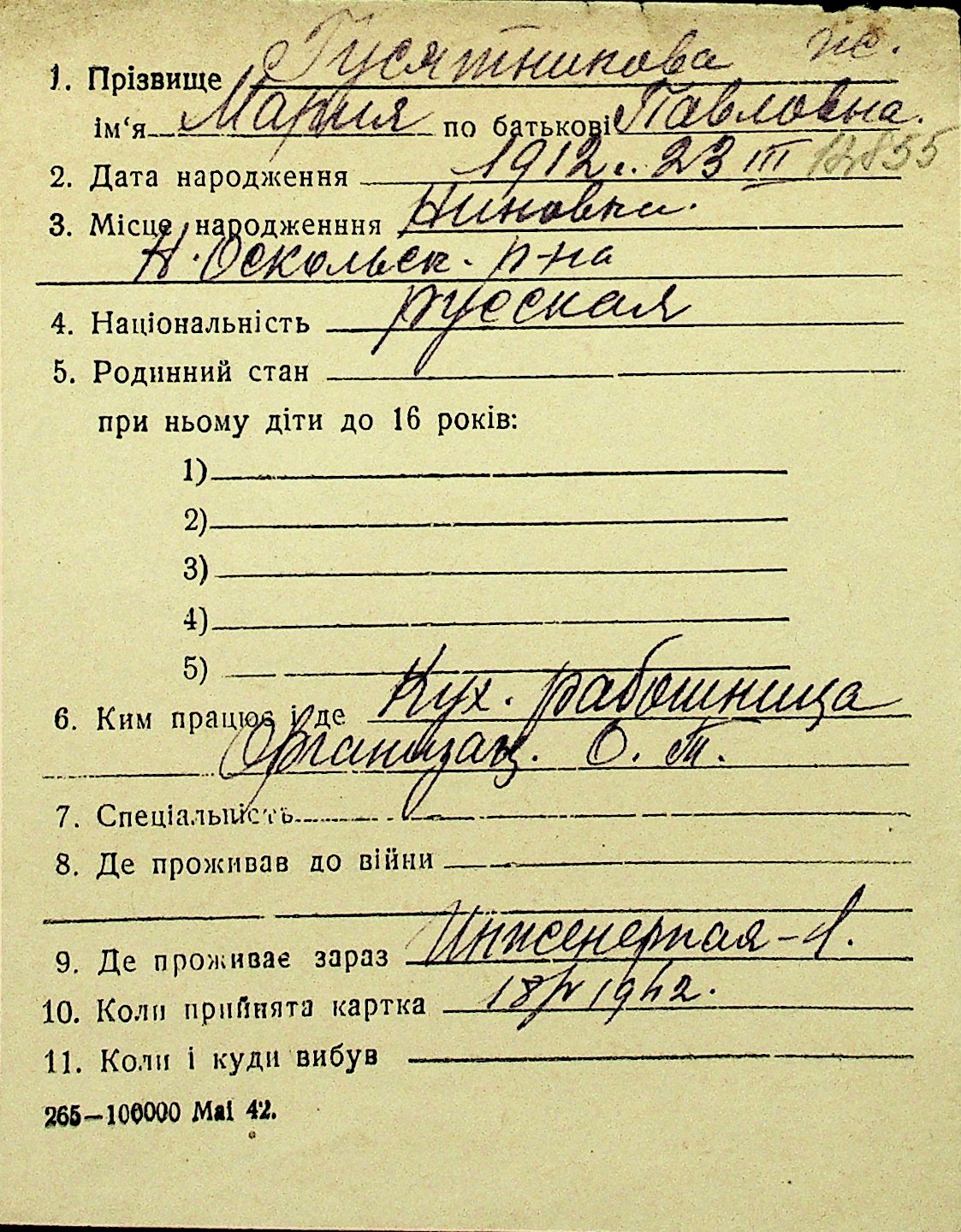 • • Перелік карток до фонду № Н-1016