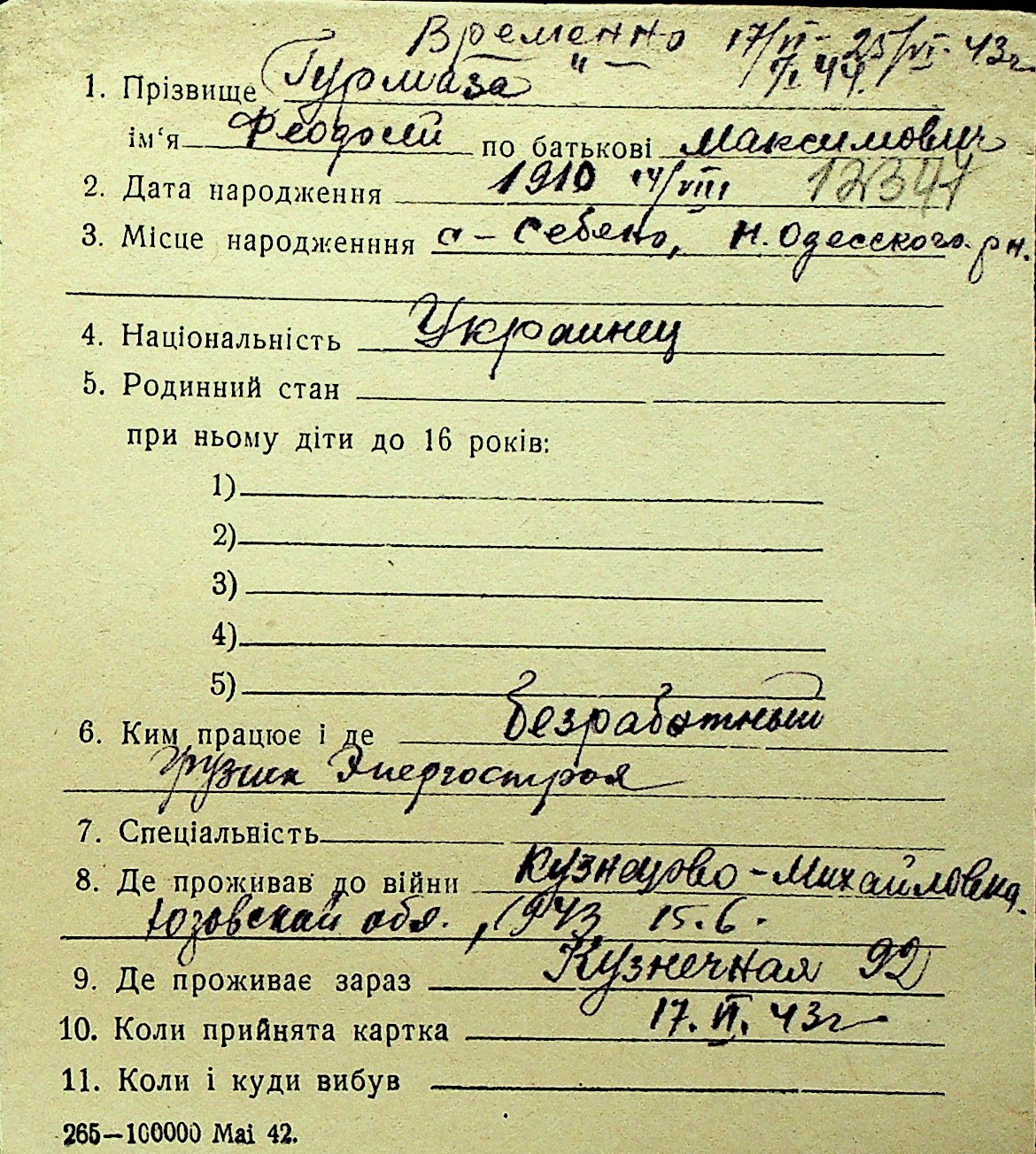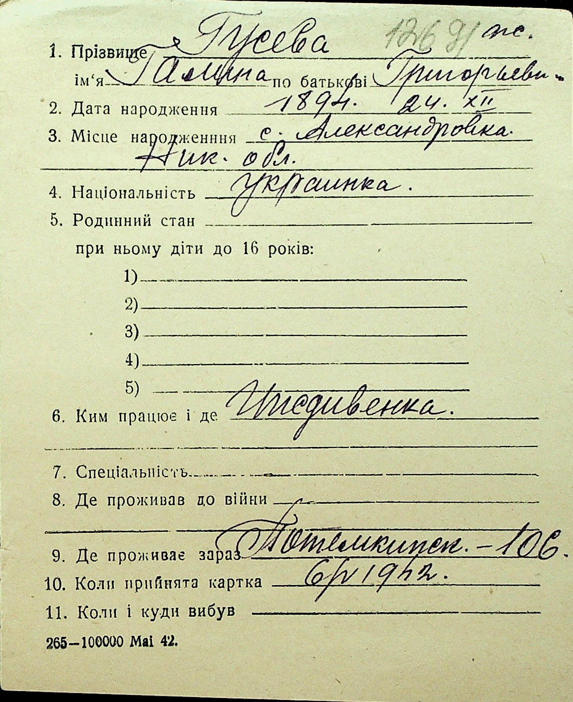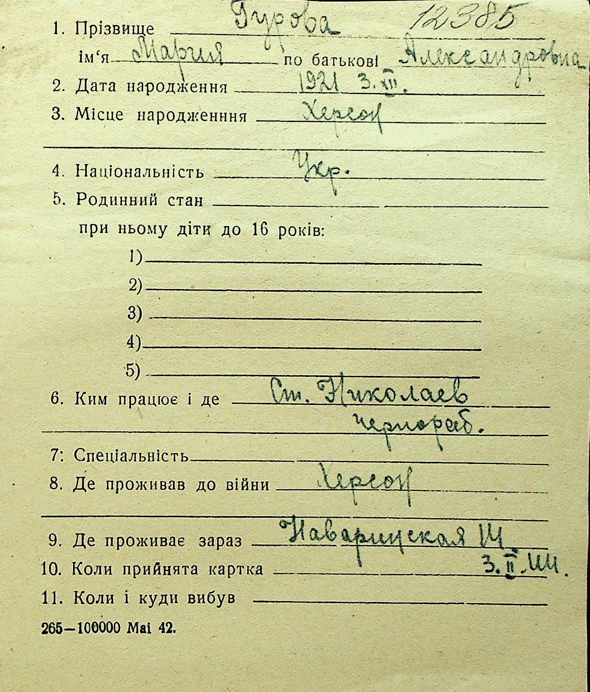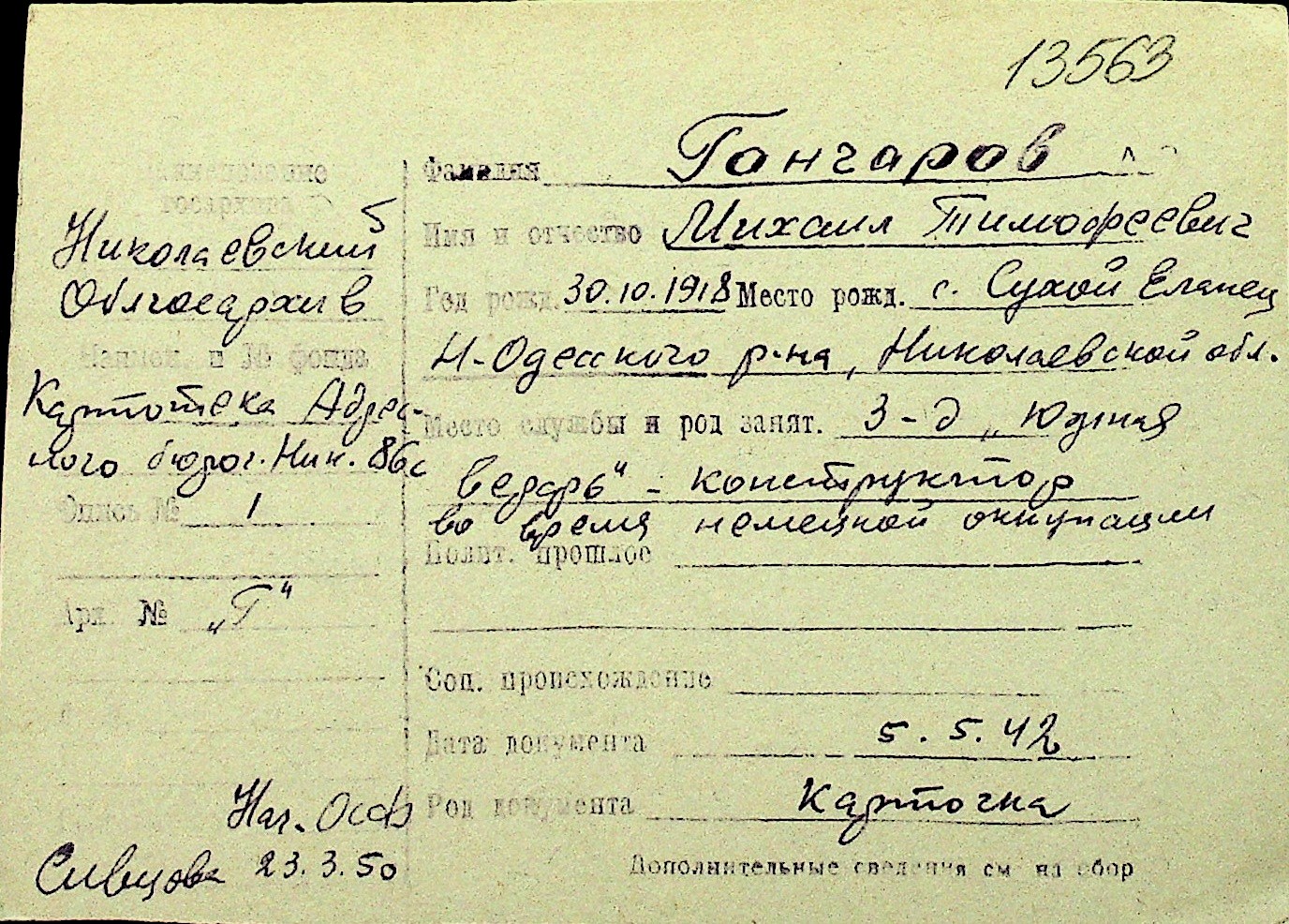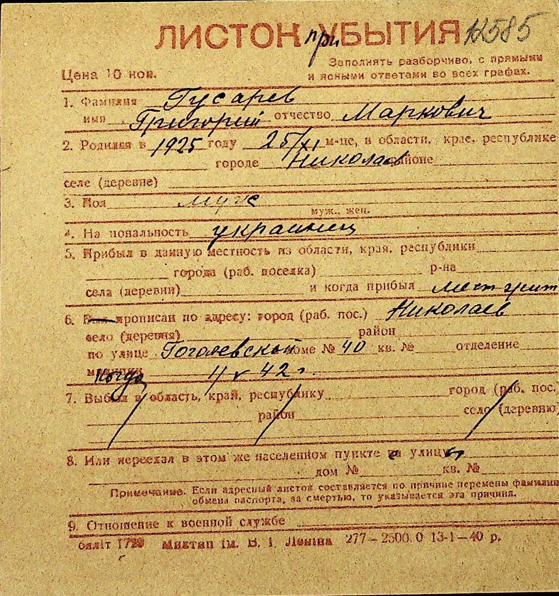 • • Перелік карток до фонду № Н-1016