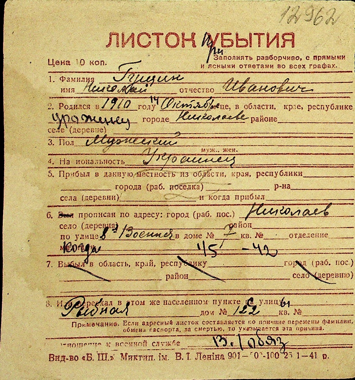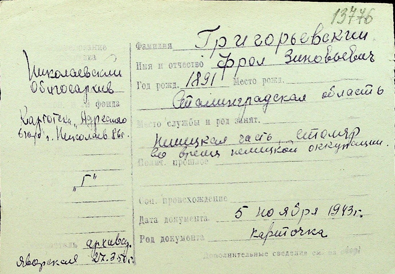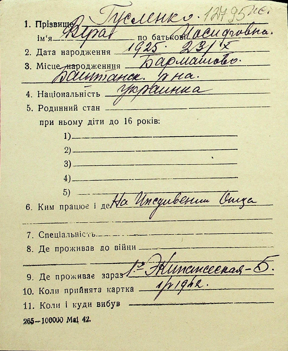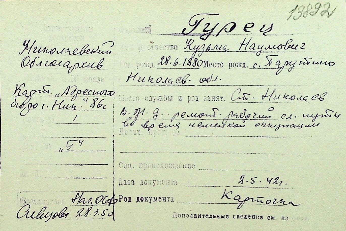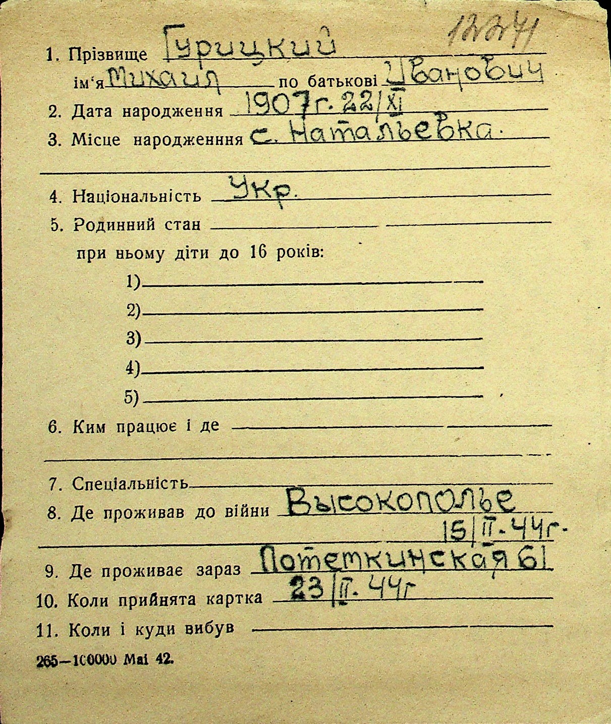 • • Перелік карток до фонду № Н-1016