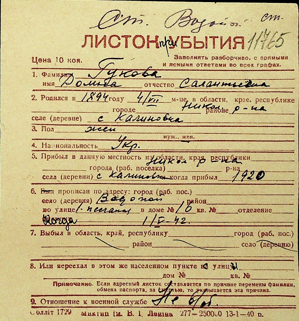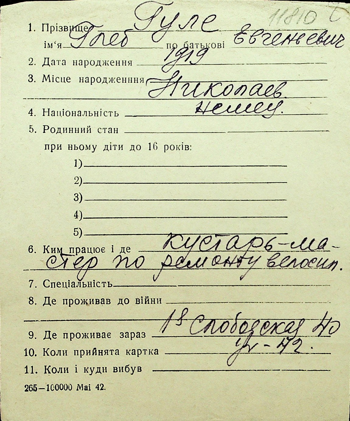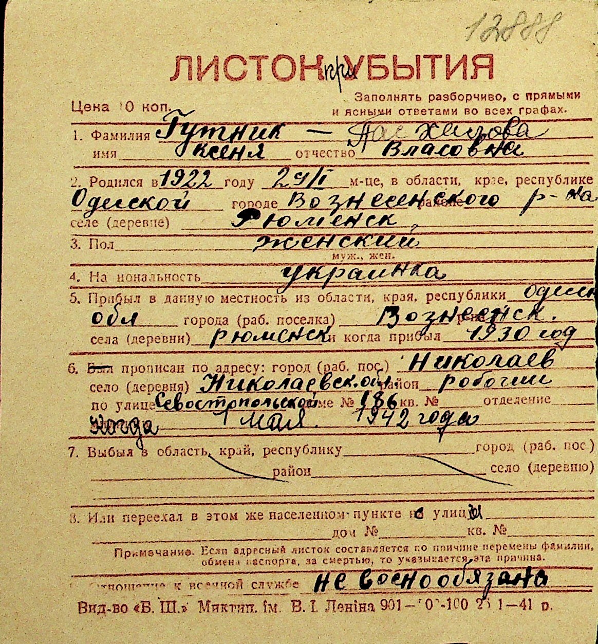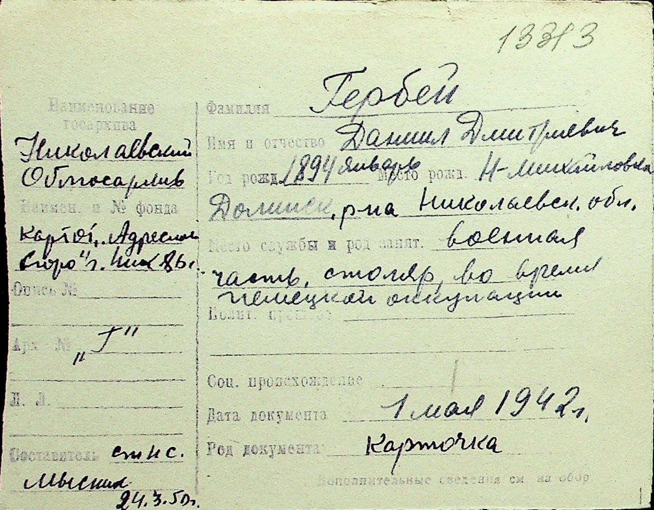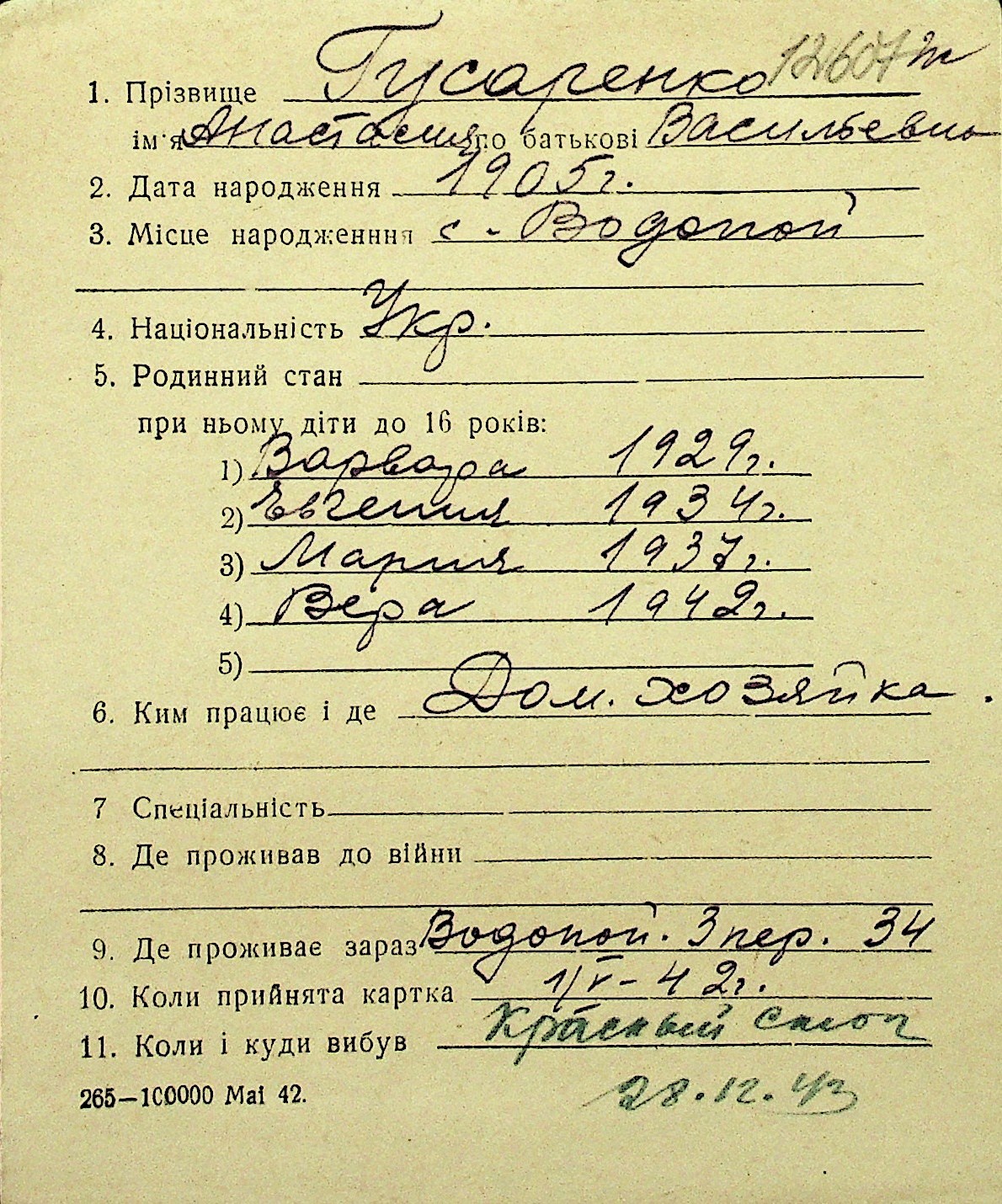 • • Перелік карток до фонду № Н-1016