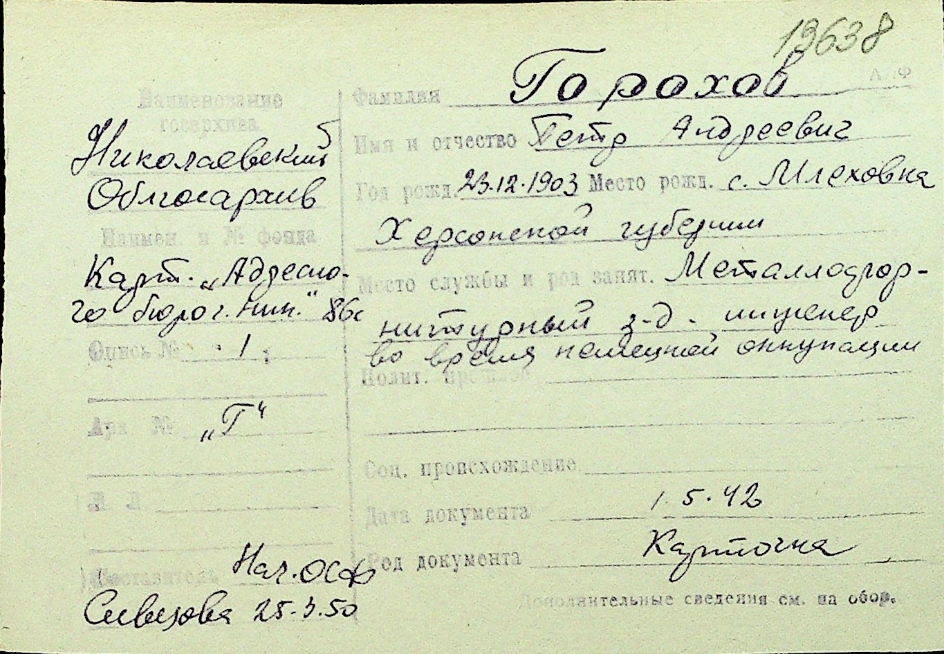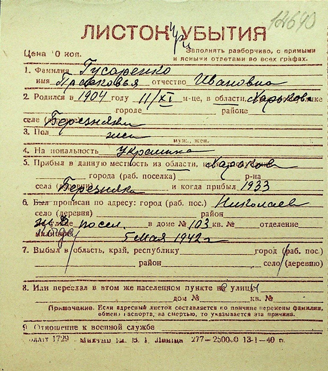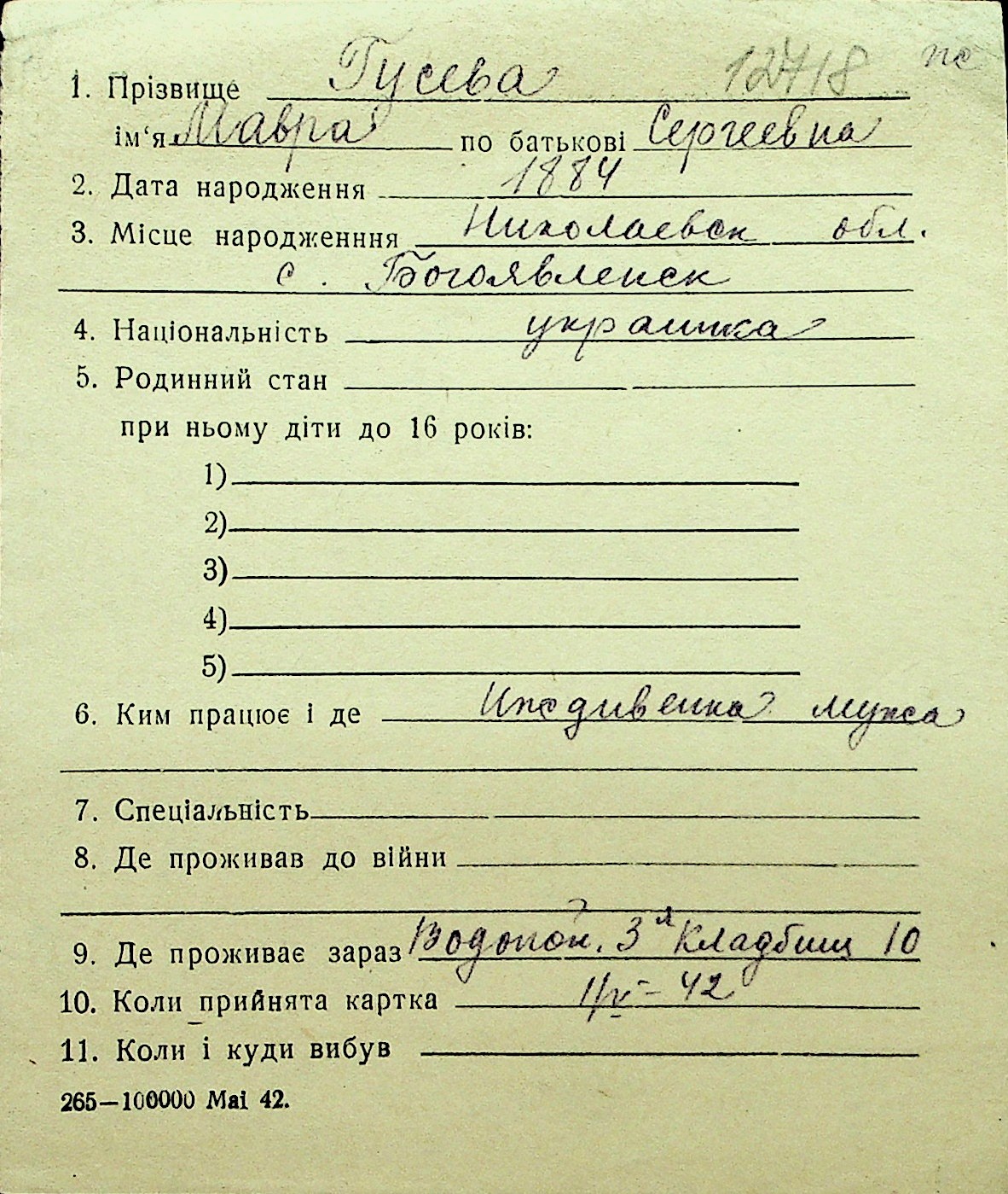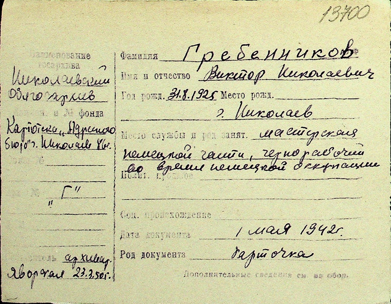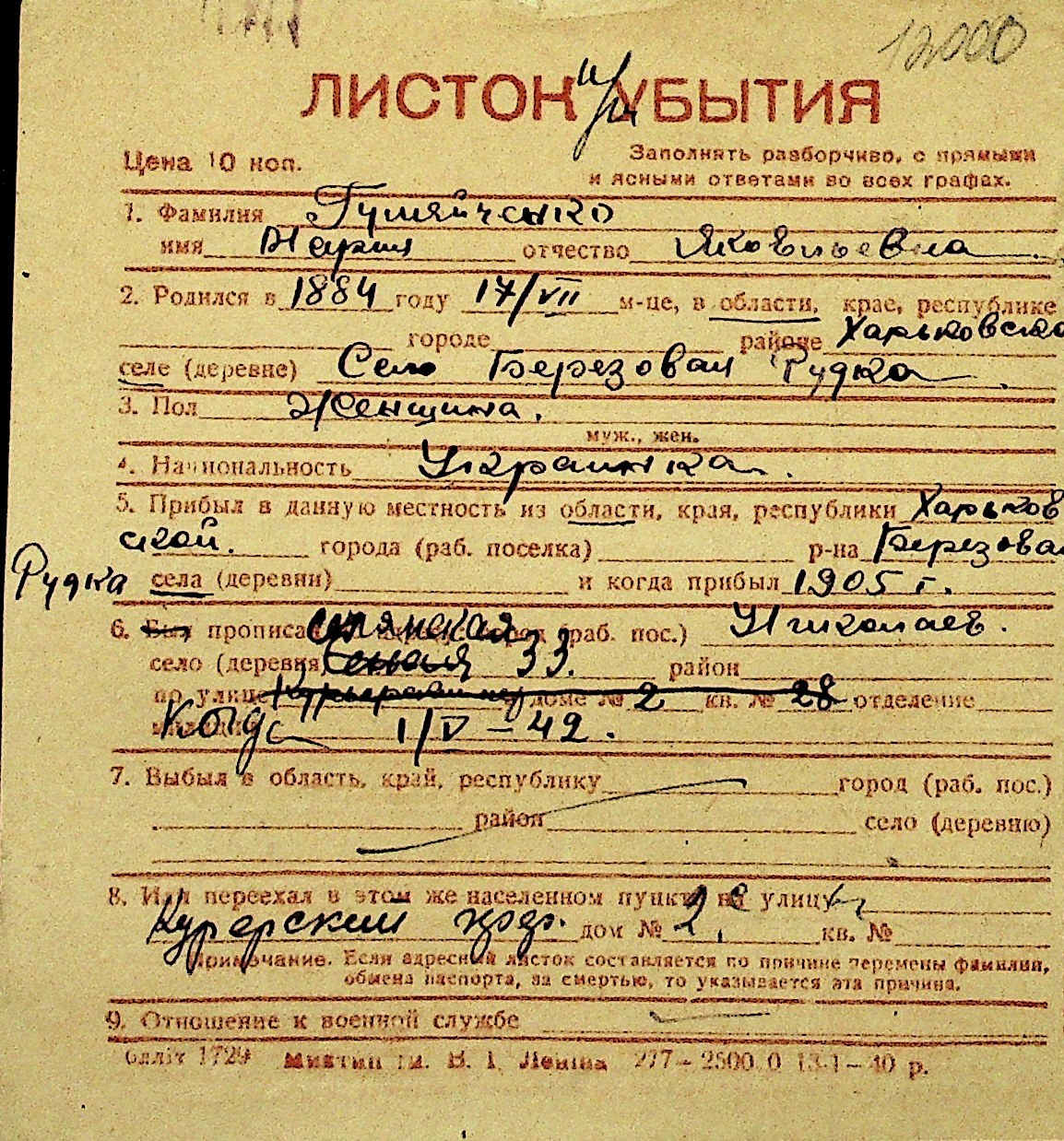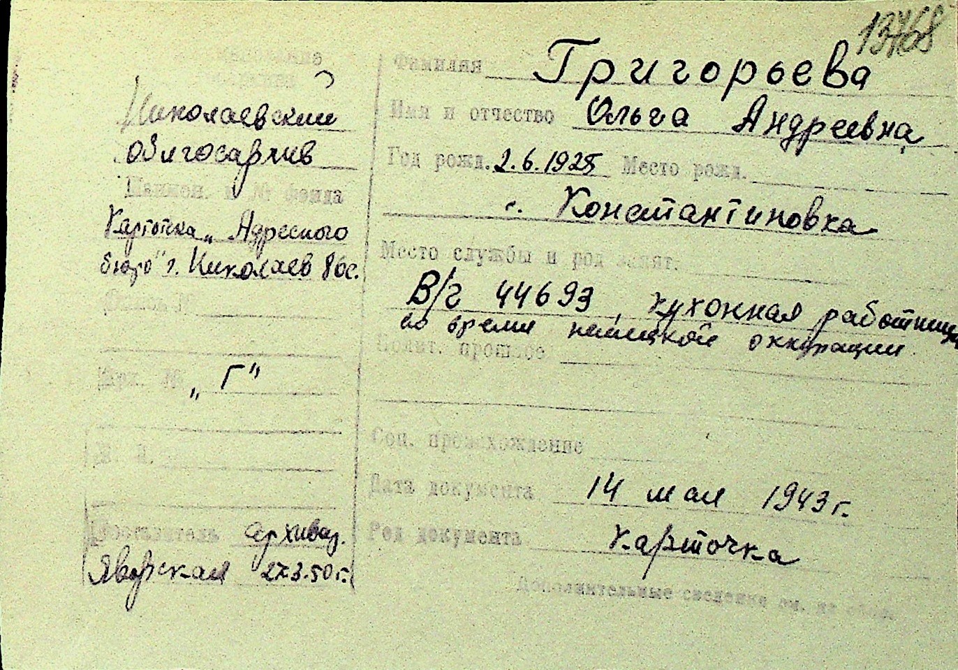 • • Перелік карток до фонду № Н-1016