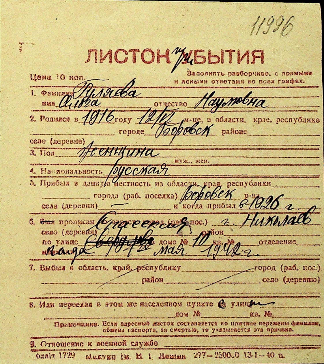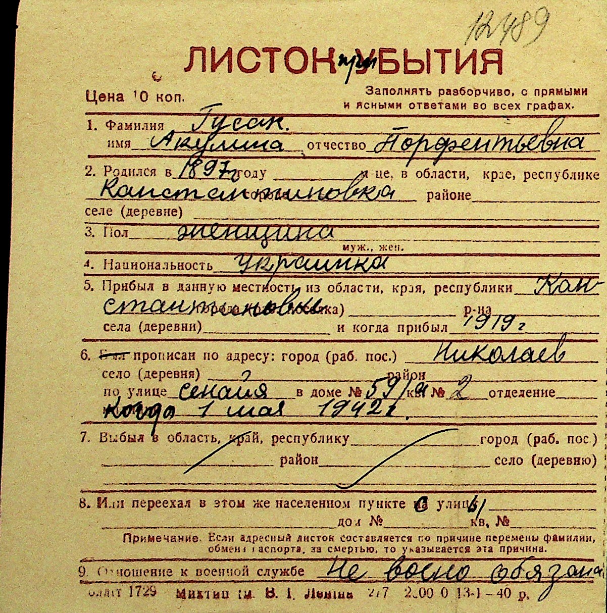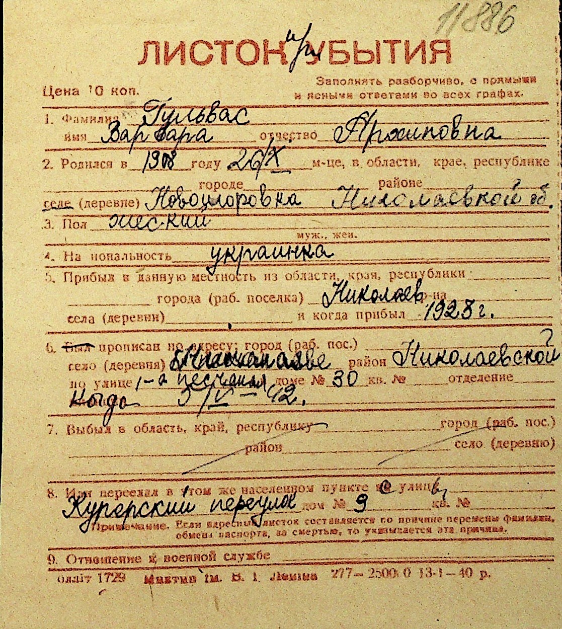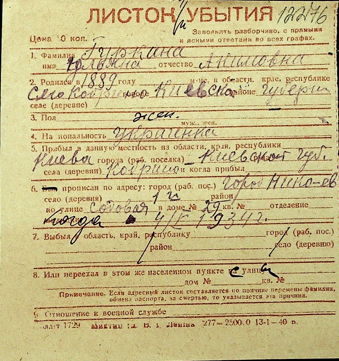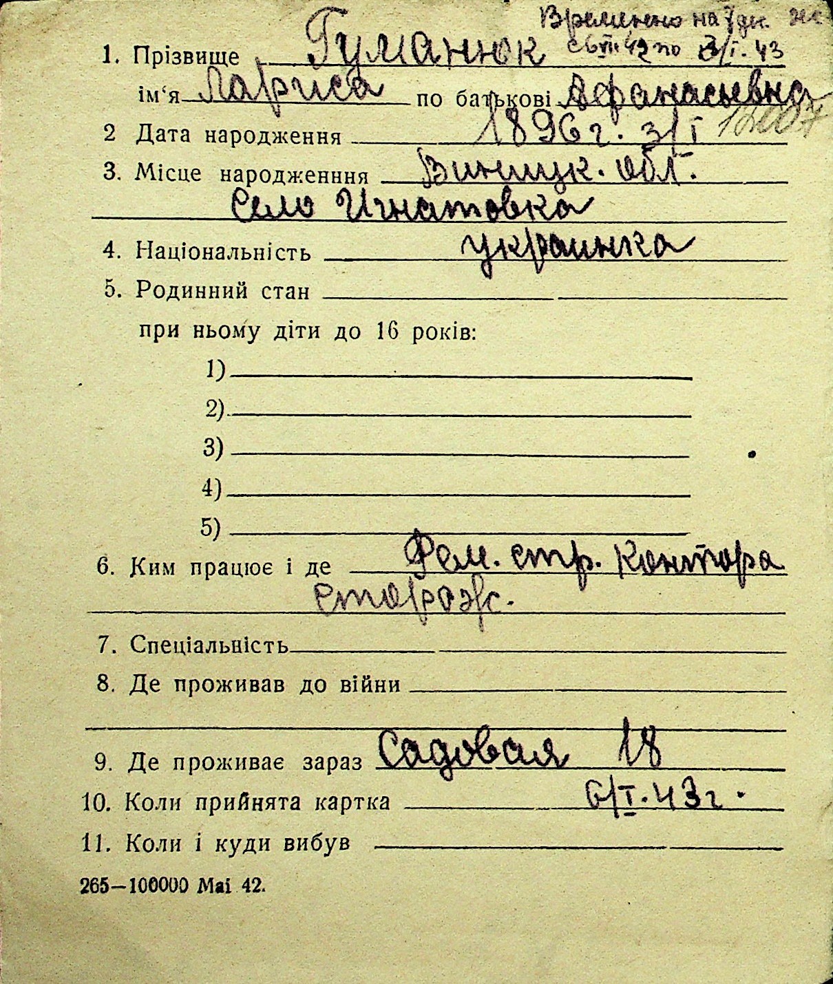 • • Перелік карток до фонду № Н-1016
