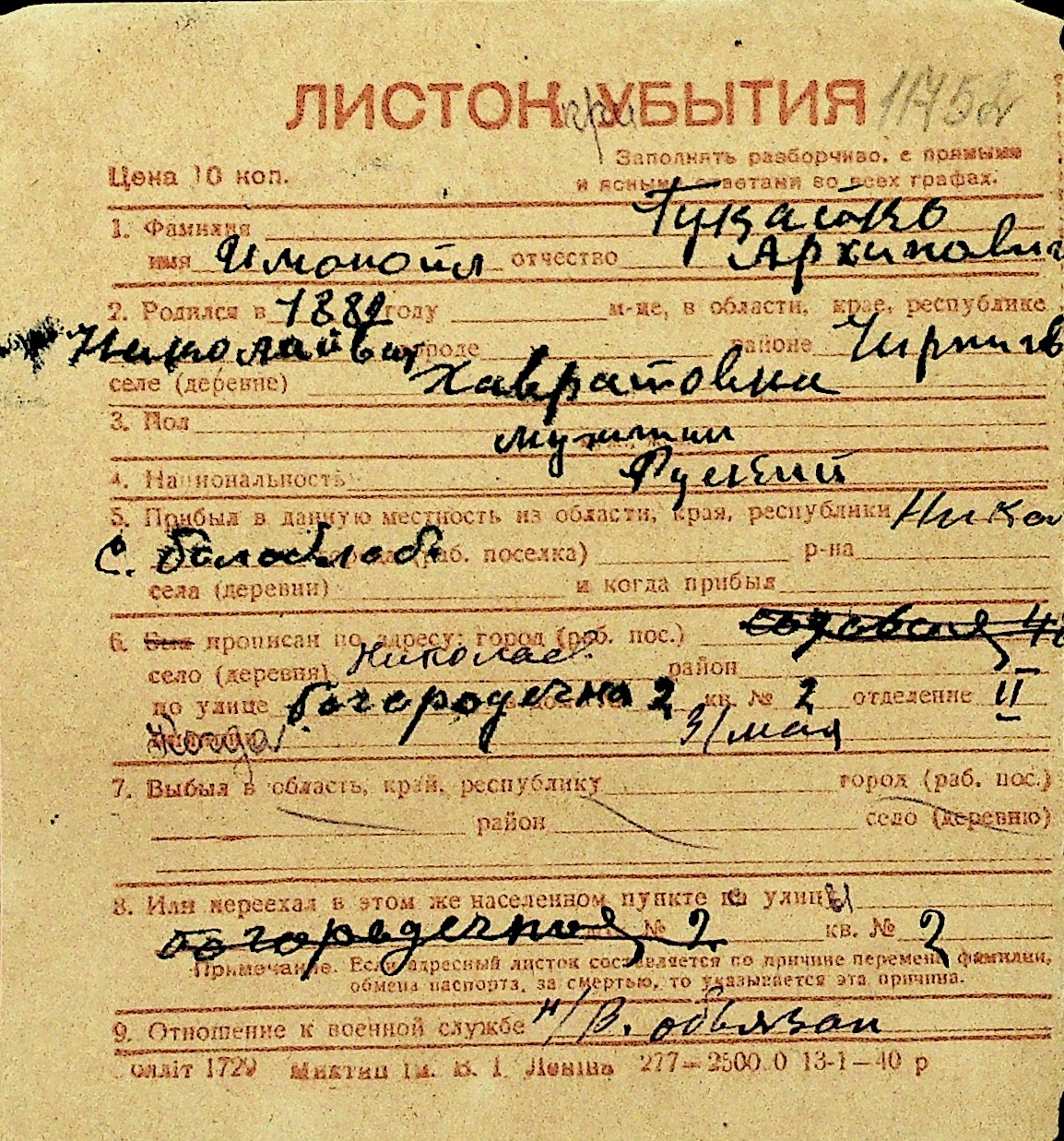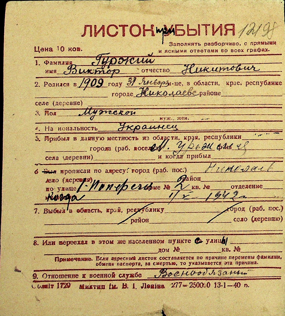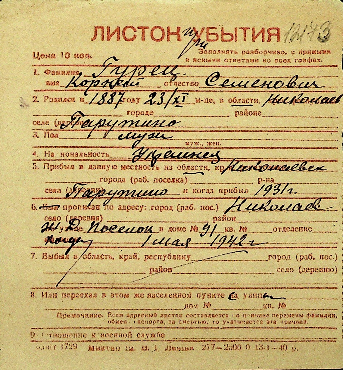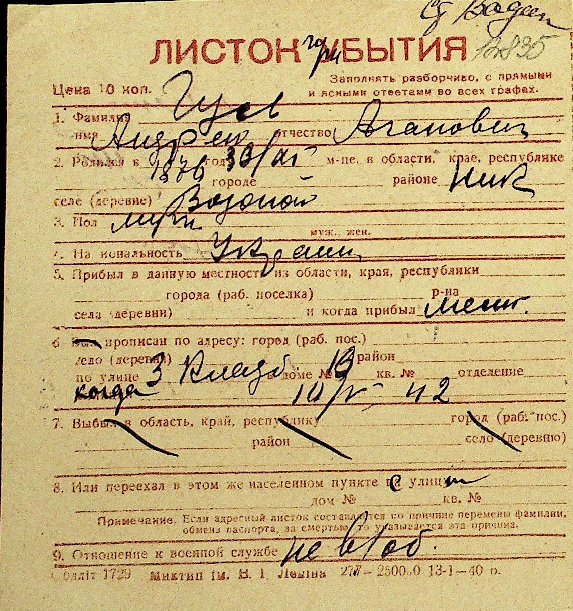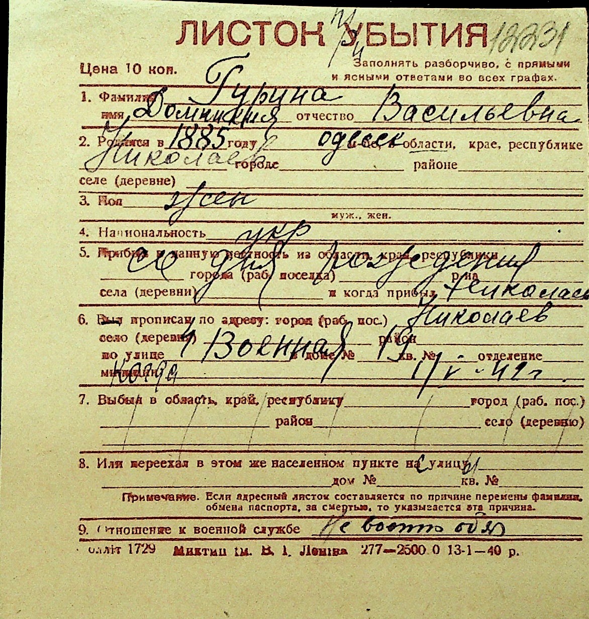 • • Перелік карток до фонду № Н-1016