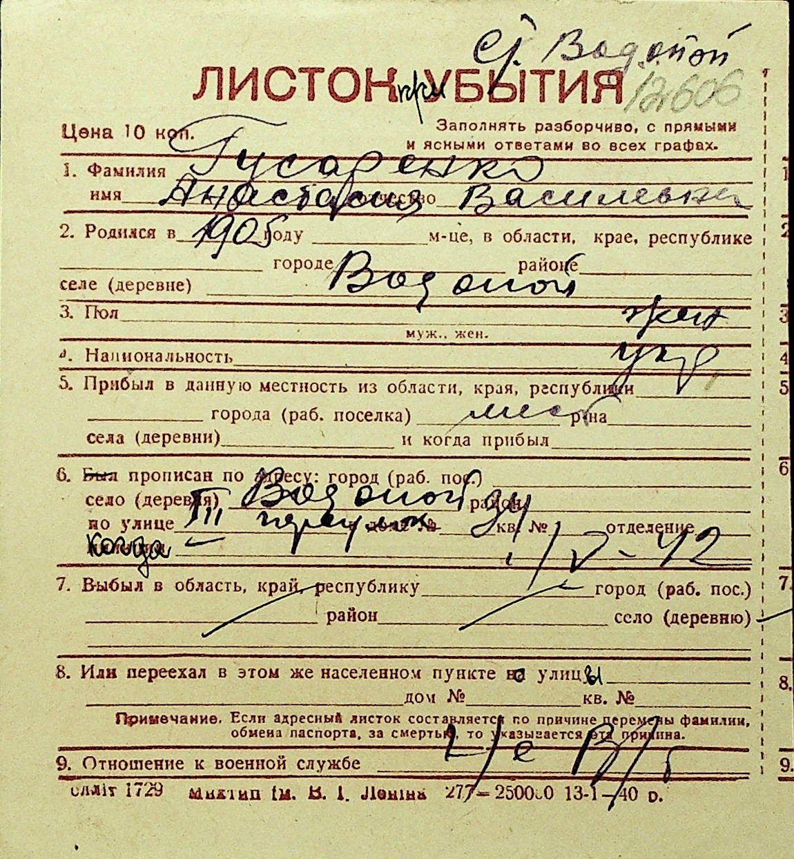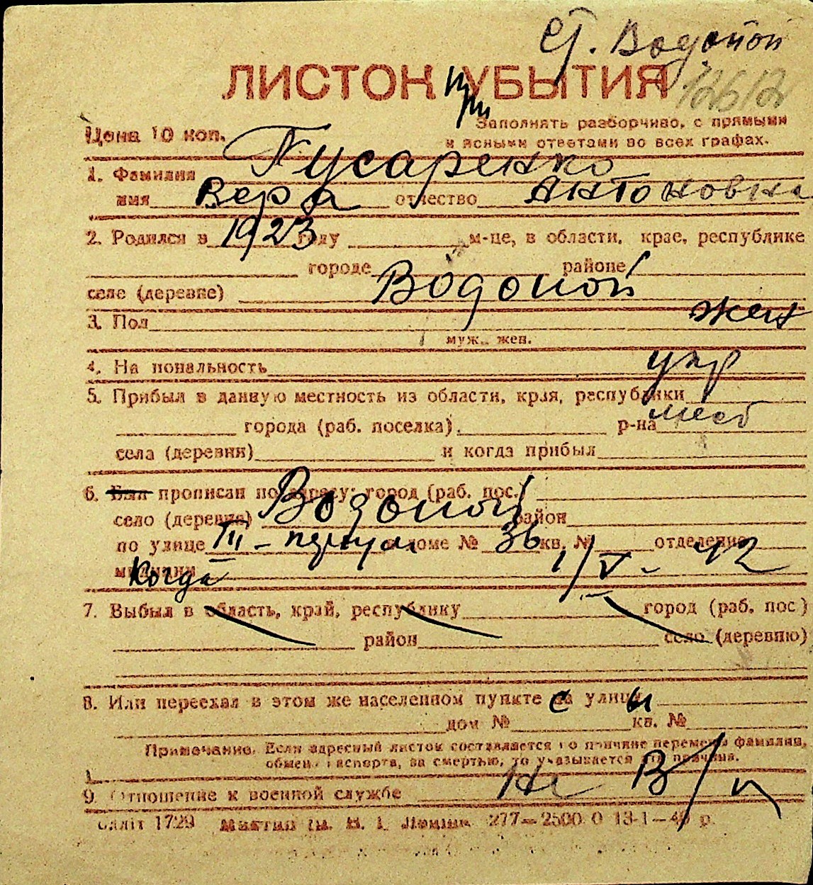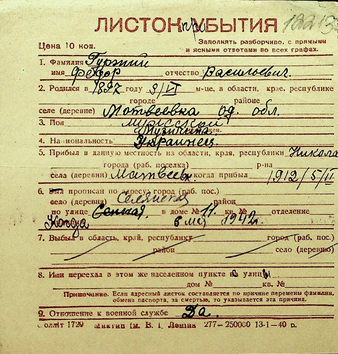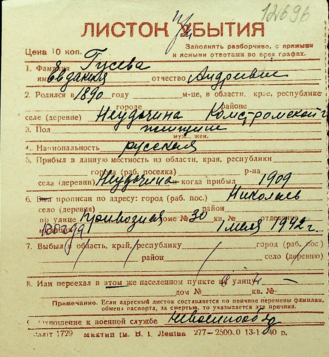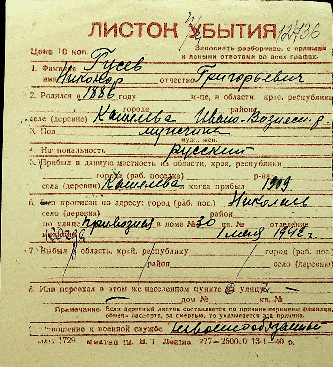 • • Перелік карток до фонду № Н-1016