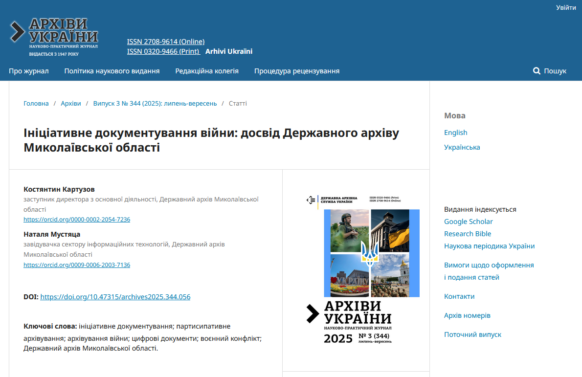 У фаховому науковому журналі «Архіви України» (№3, 2025) опубліковано статтю Костянтина Картузова та Наталії Мустяци «Ініціативне документування війни: досвід Державного архіву Миколаївської області».